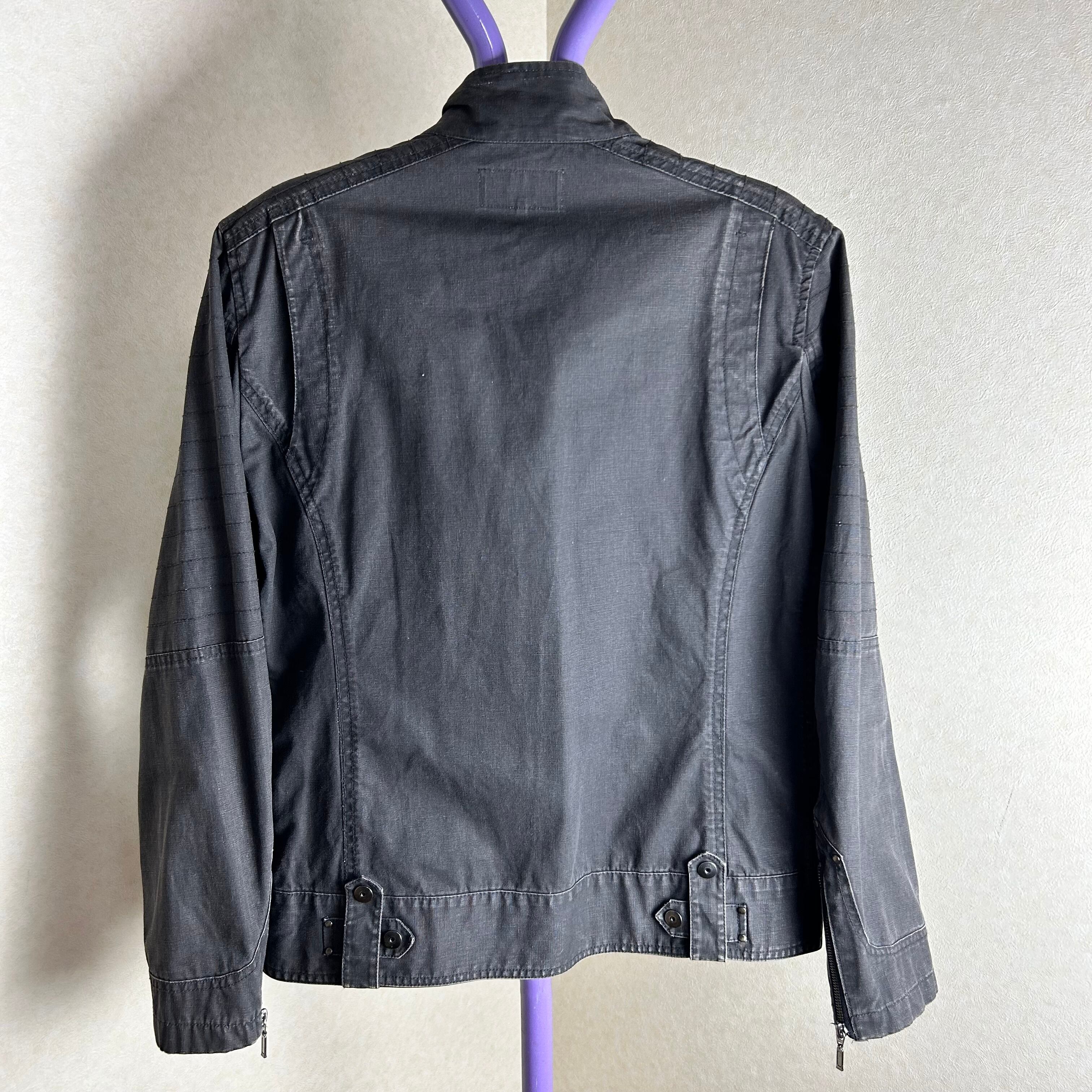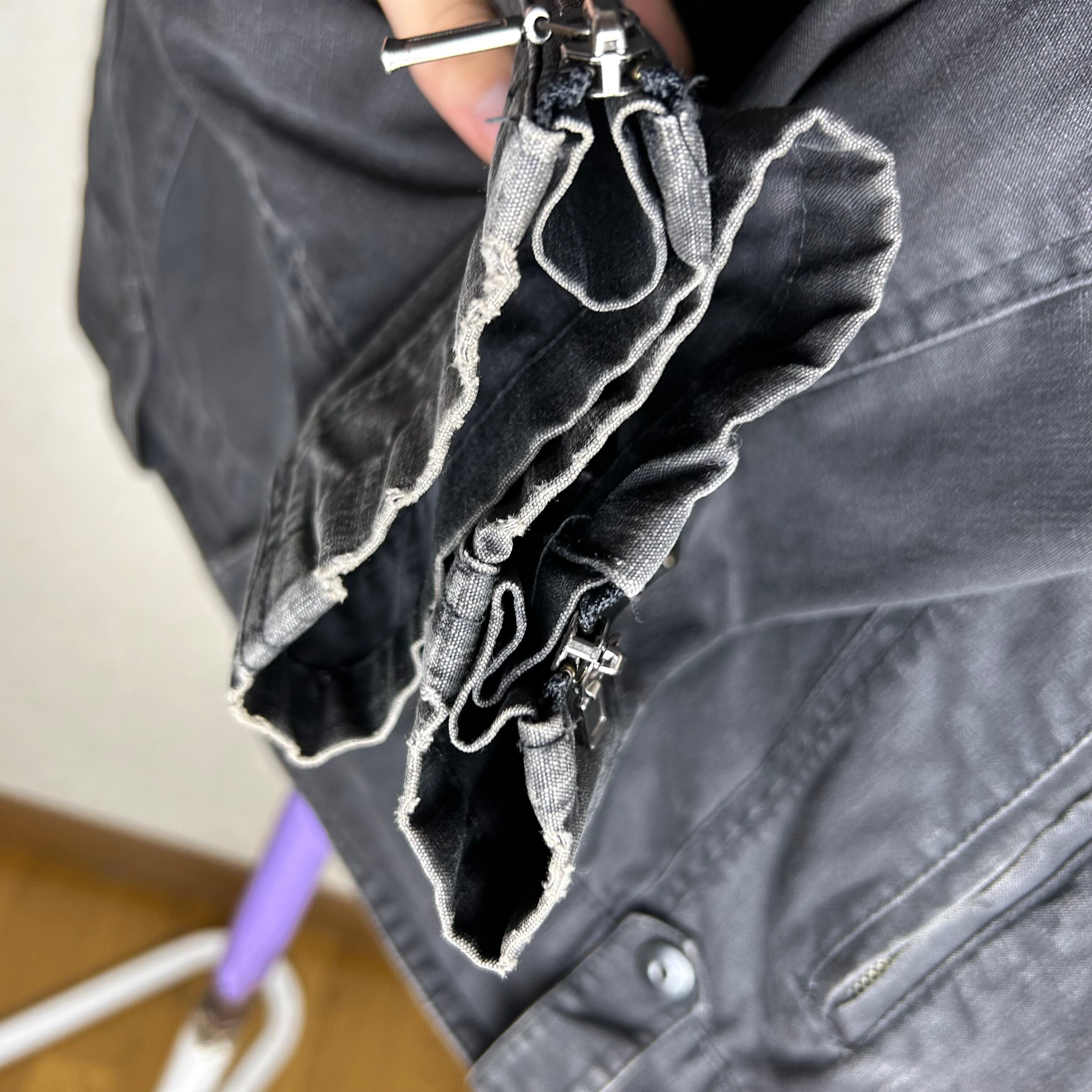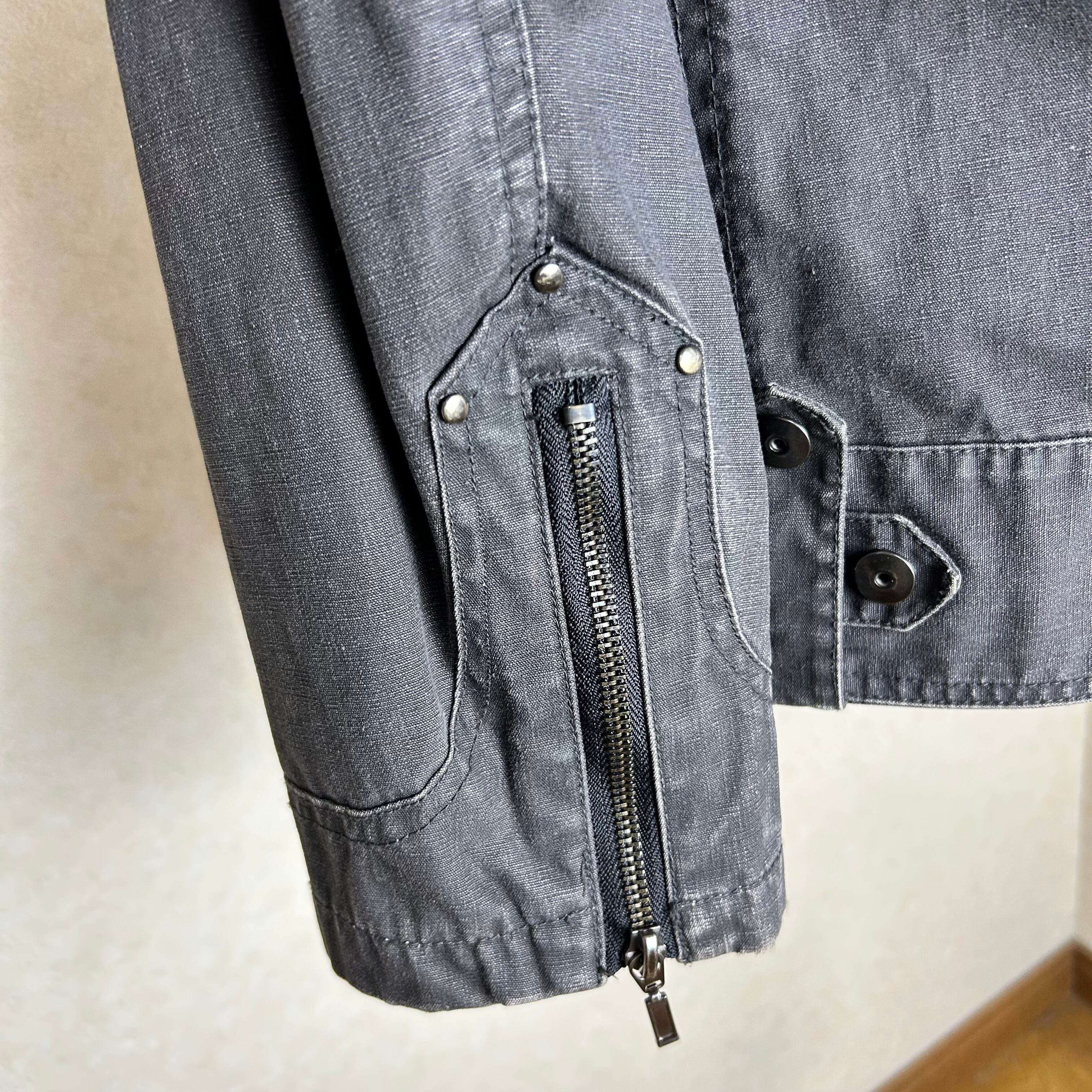 色々ギミックが施されたダークグレーのジャケット。袖にファスナーが付いていたり、裾にスナップボタンが付いていたり細かいギミック多用です。
