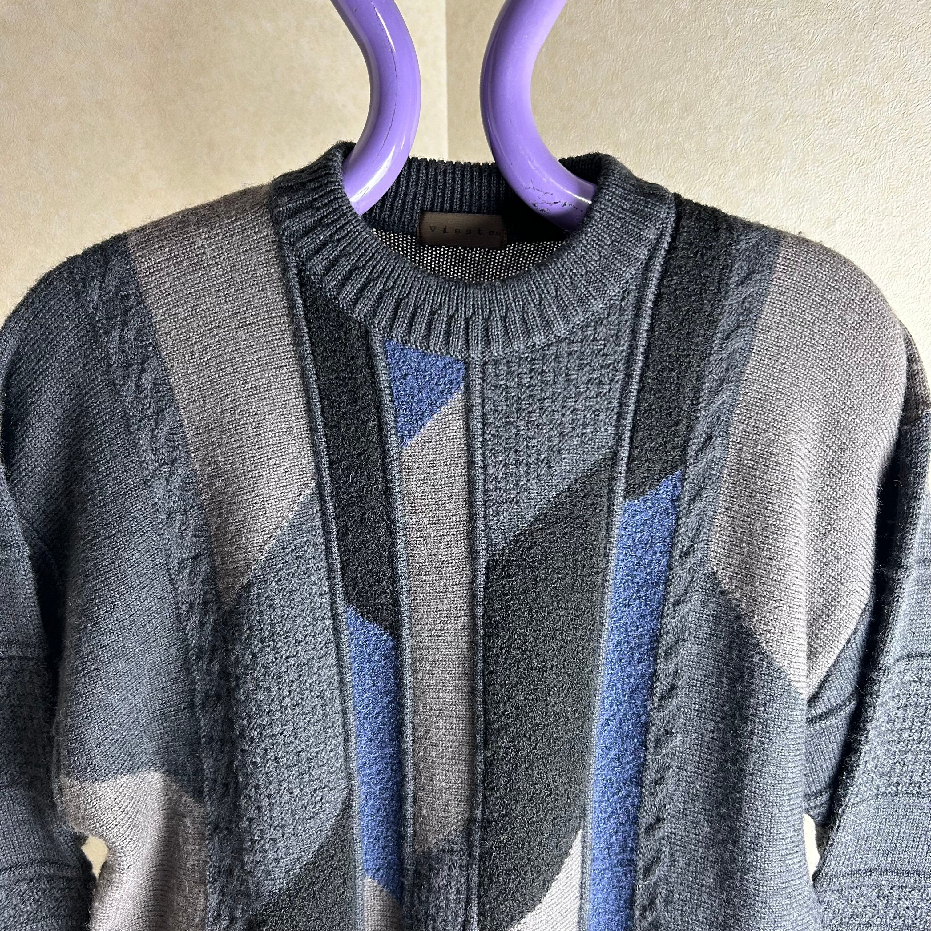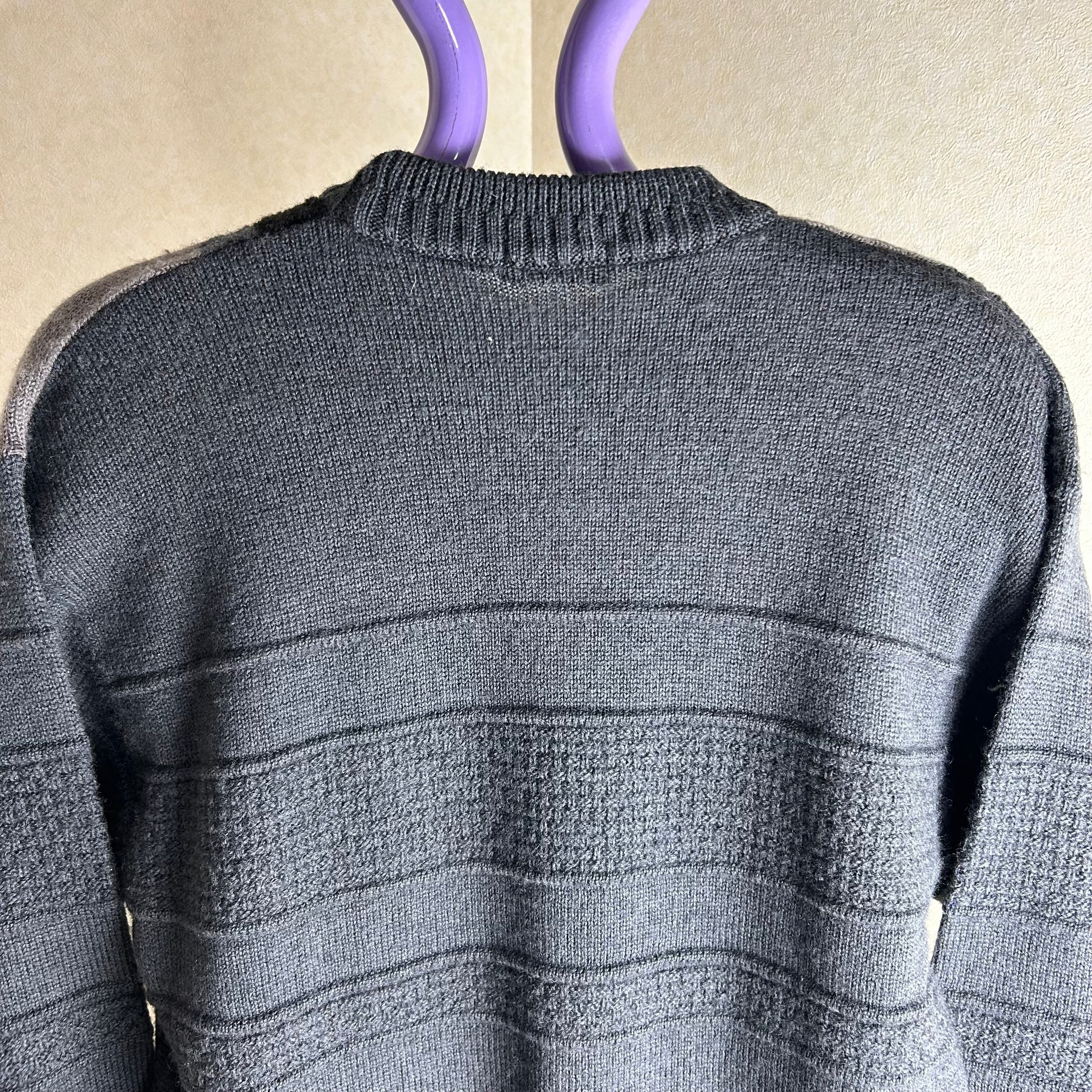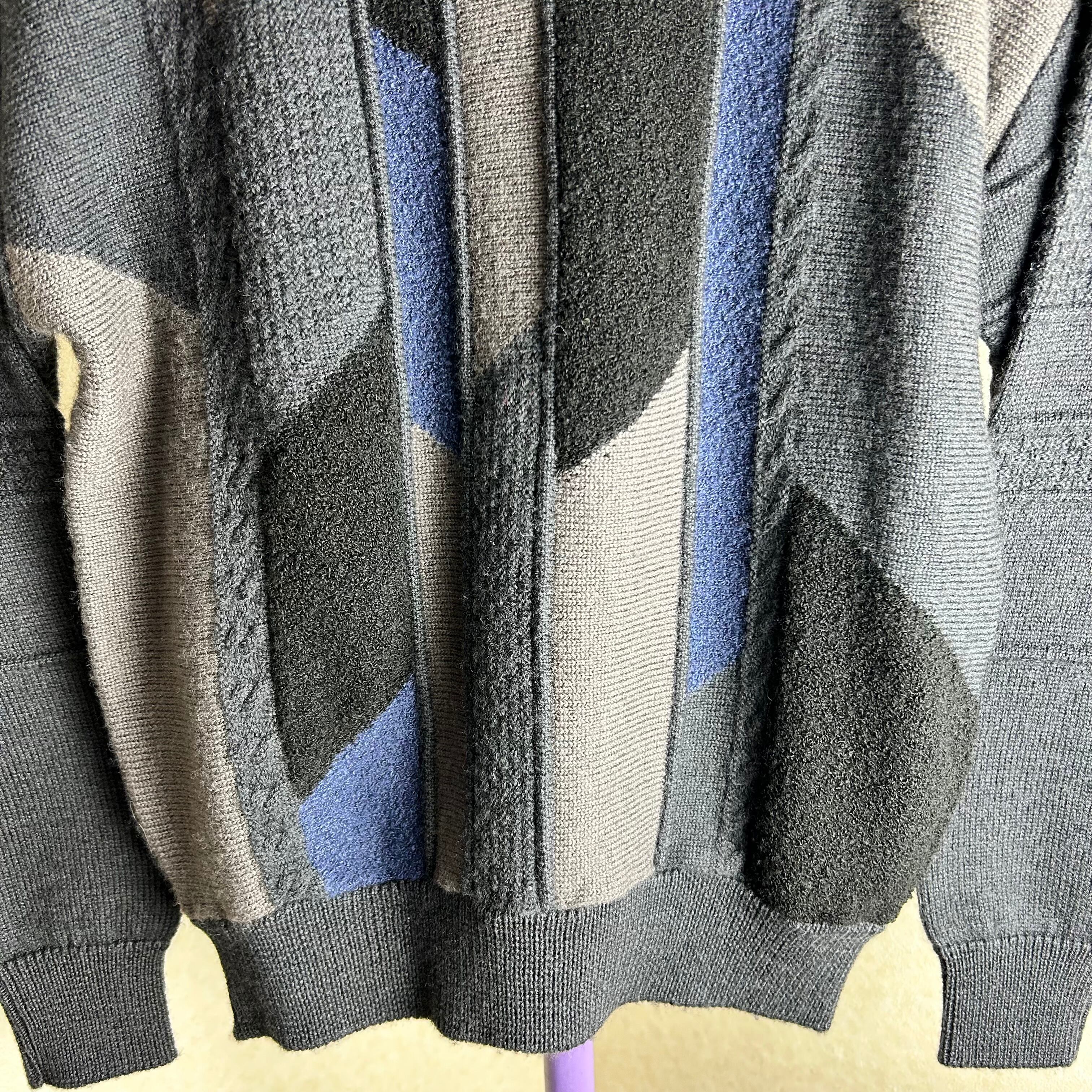 ダークグレーが基調のニット。幾何学模様の編み方で箇所によって生地が違っているもの良いポイントです。
