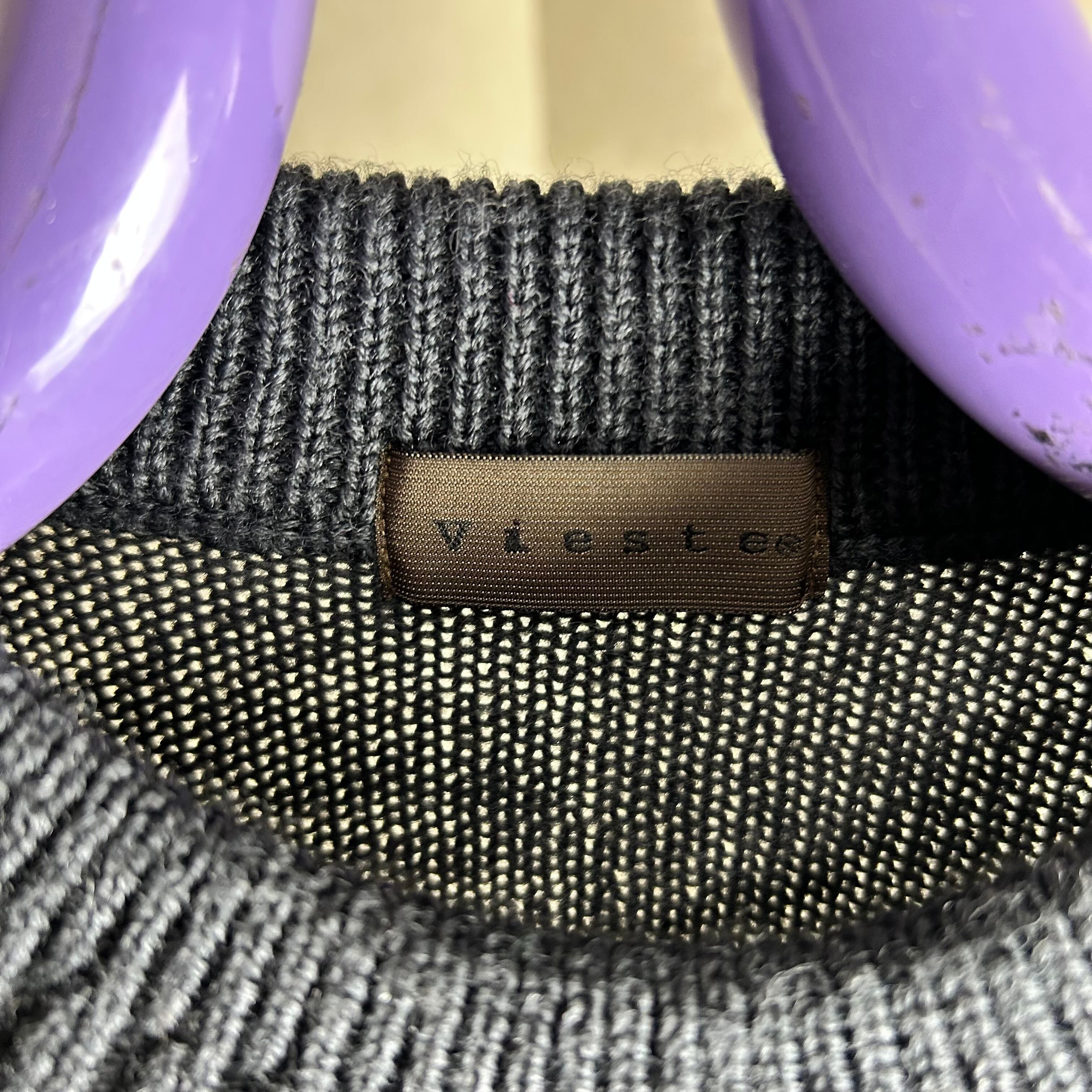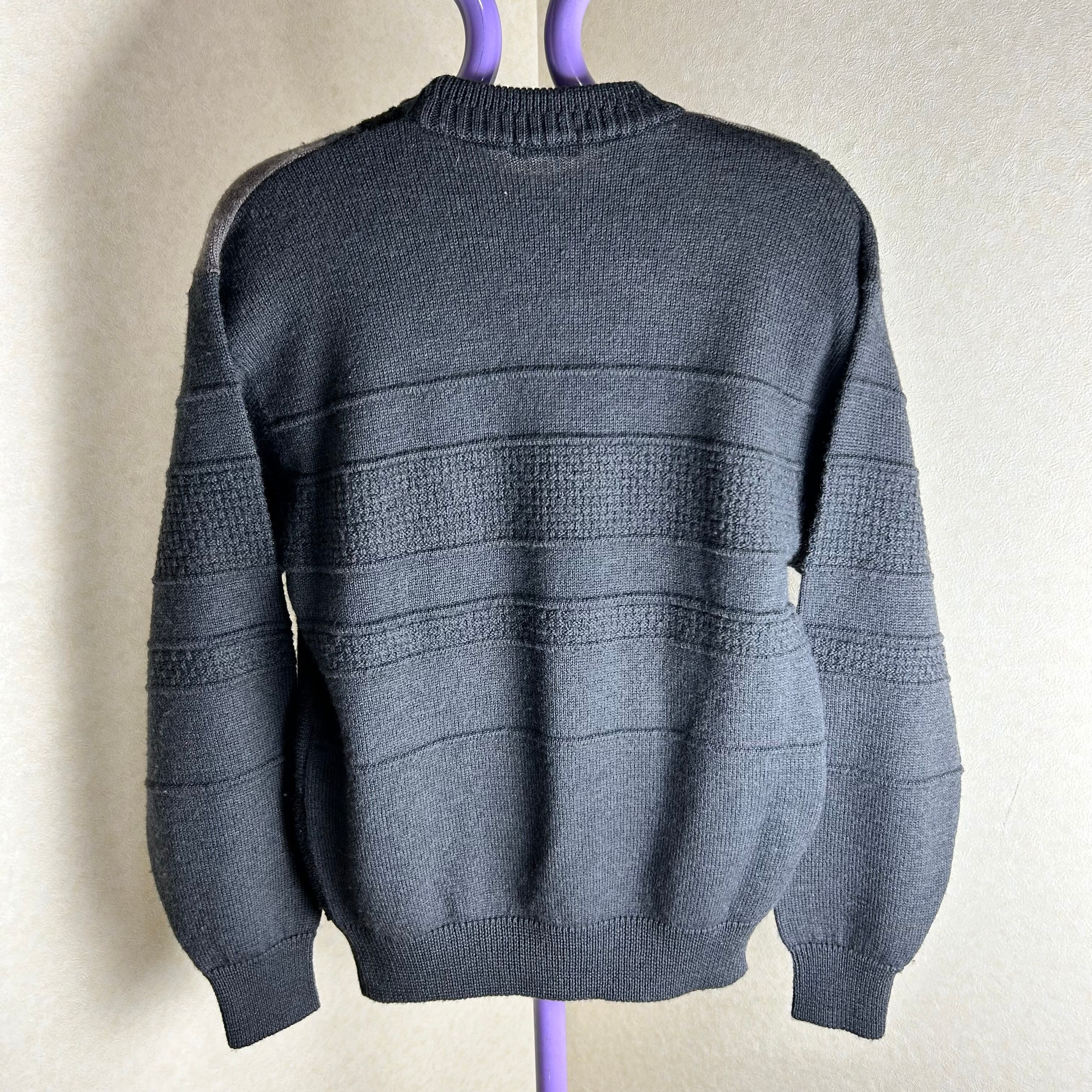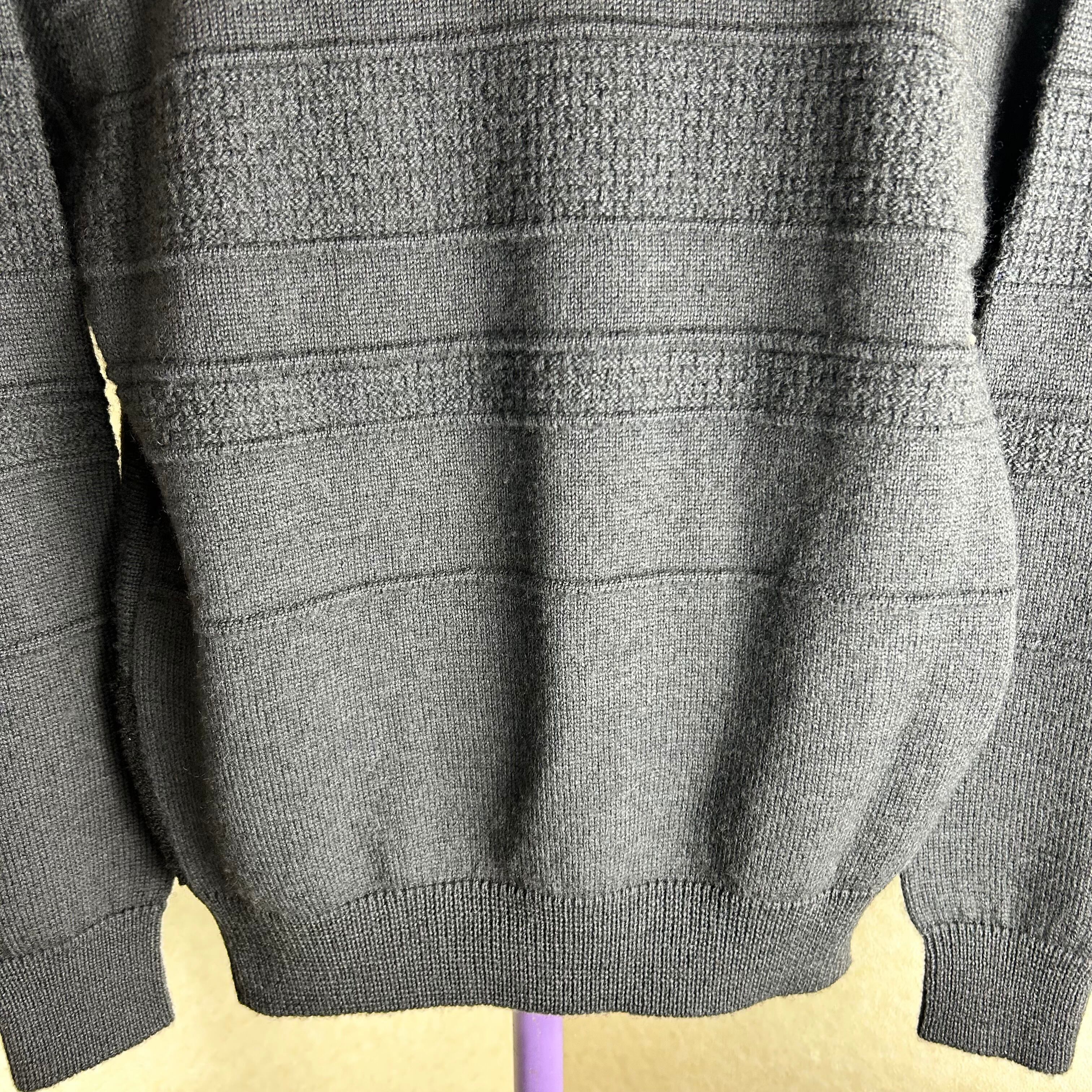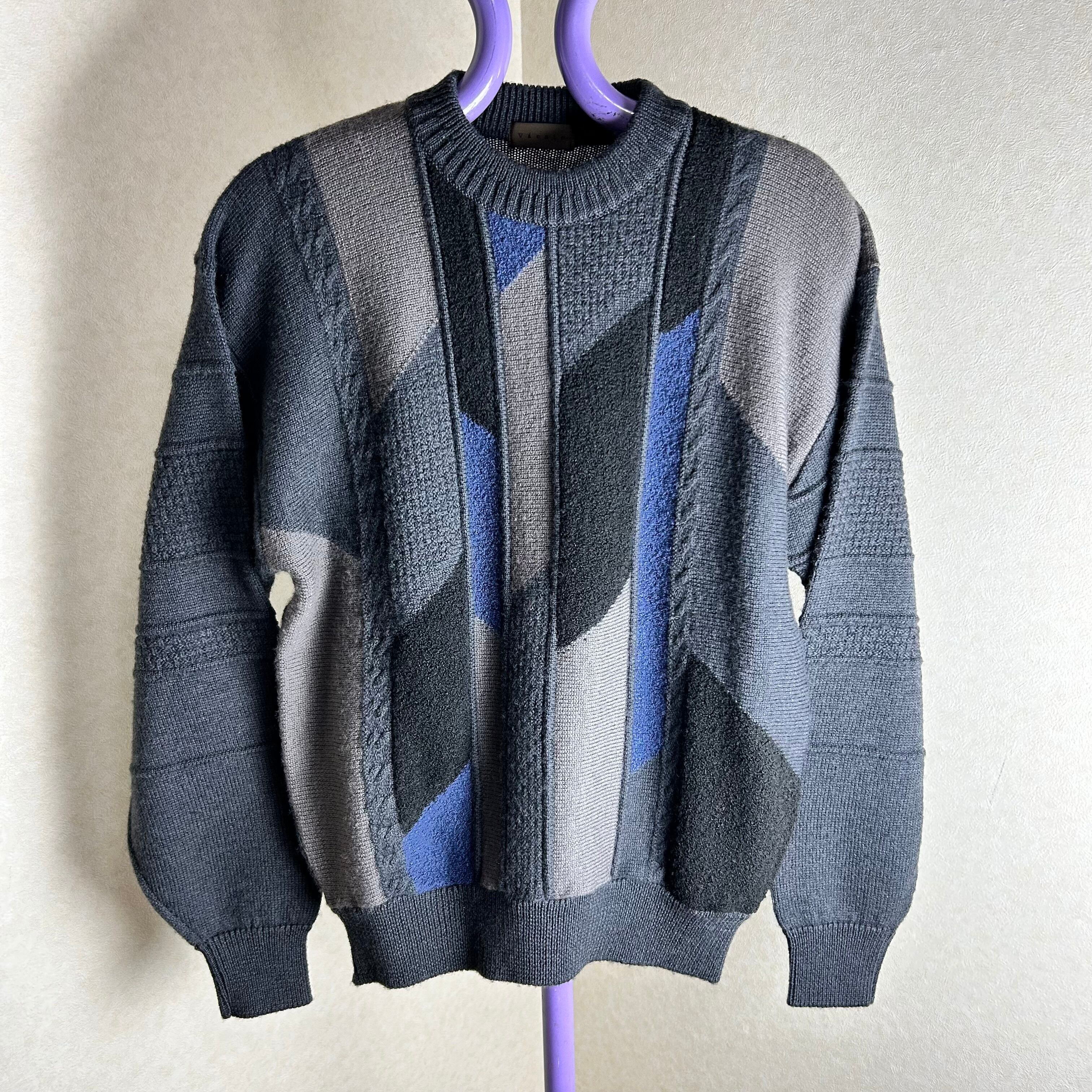 ダークグレーが基調のニット。幾何学模様の編み方で箇所によって生地が違っているもの良いポイントです。