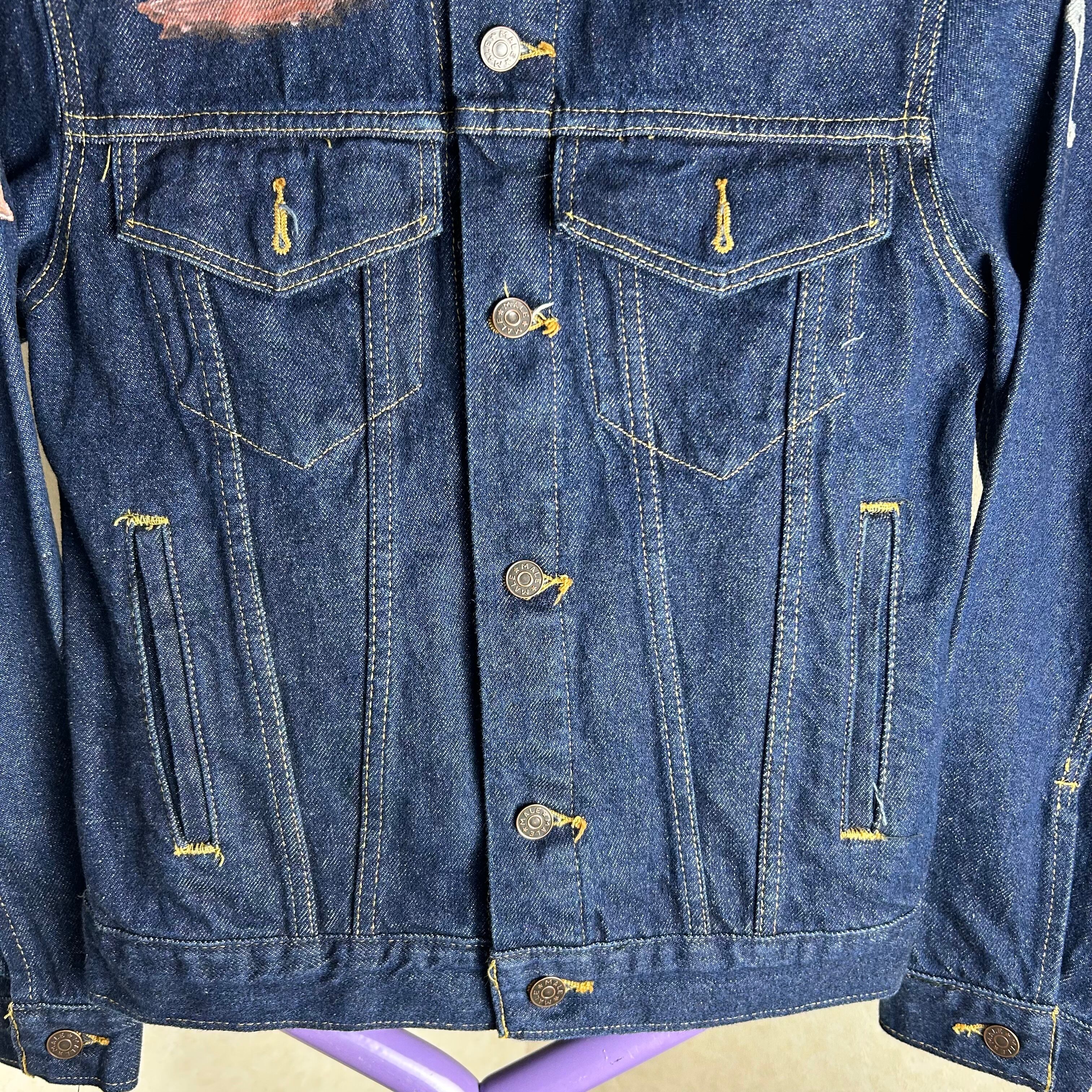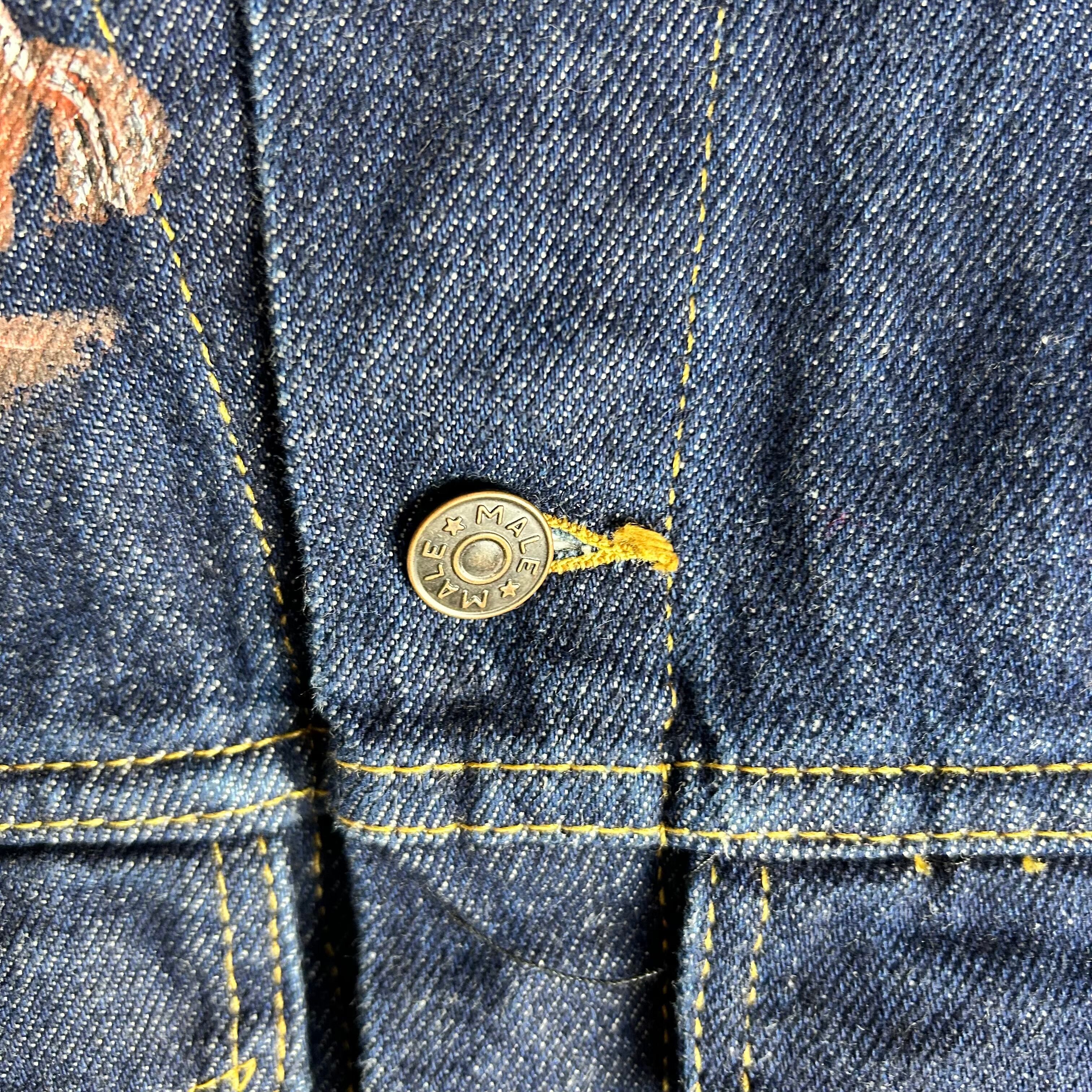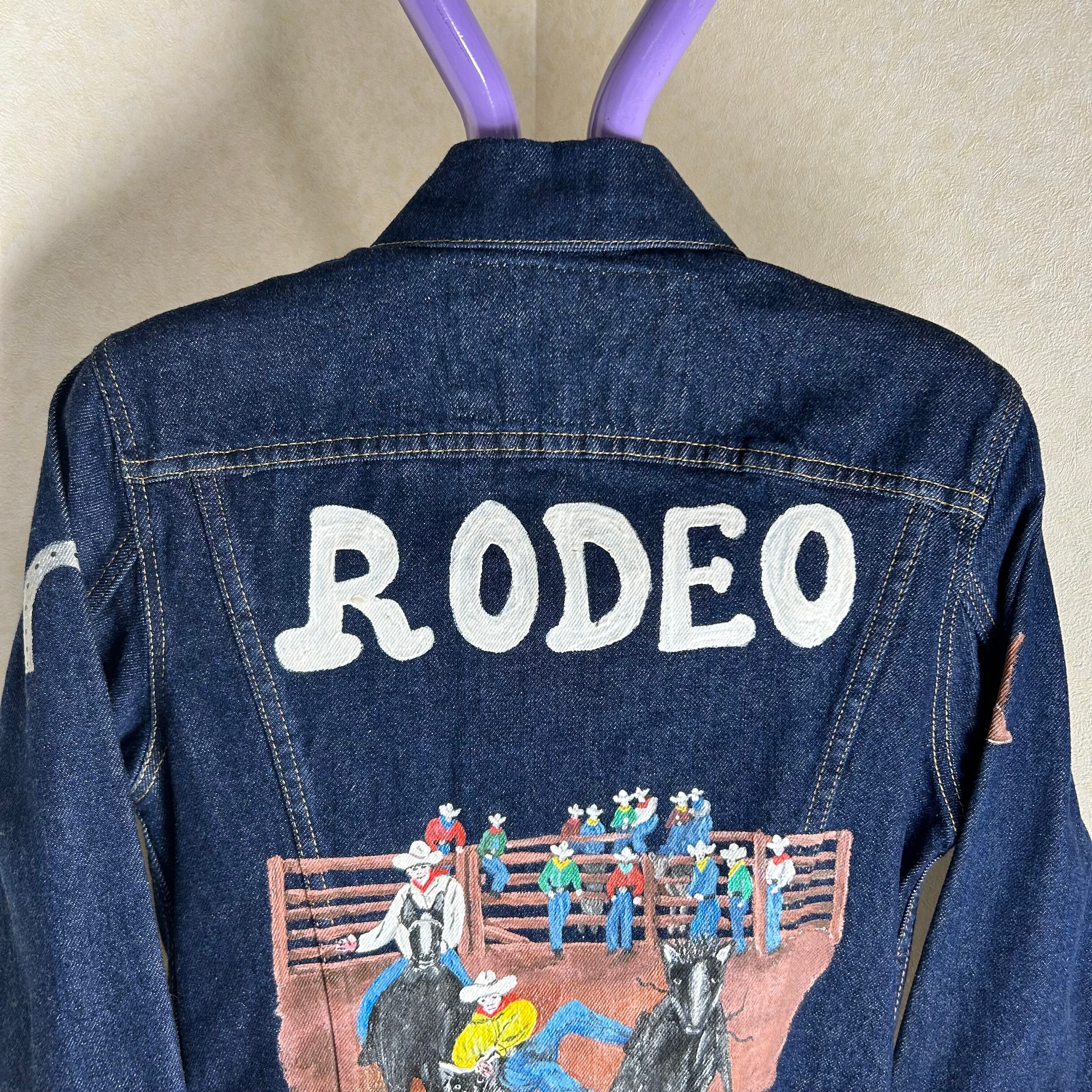 濃紺の生地にペイントがされたデニムジャケットです。ペイントはウエスタンに統一されていてかなりおもしろいとおもいます。