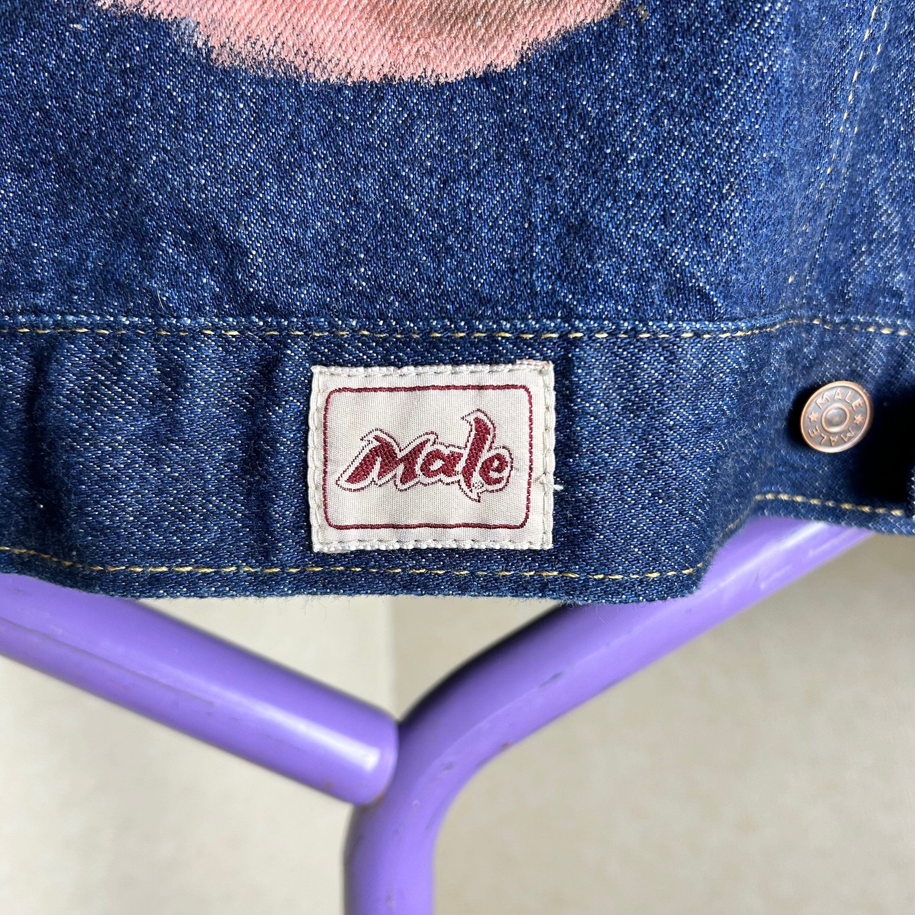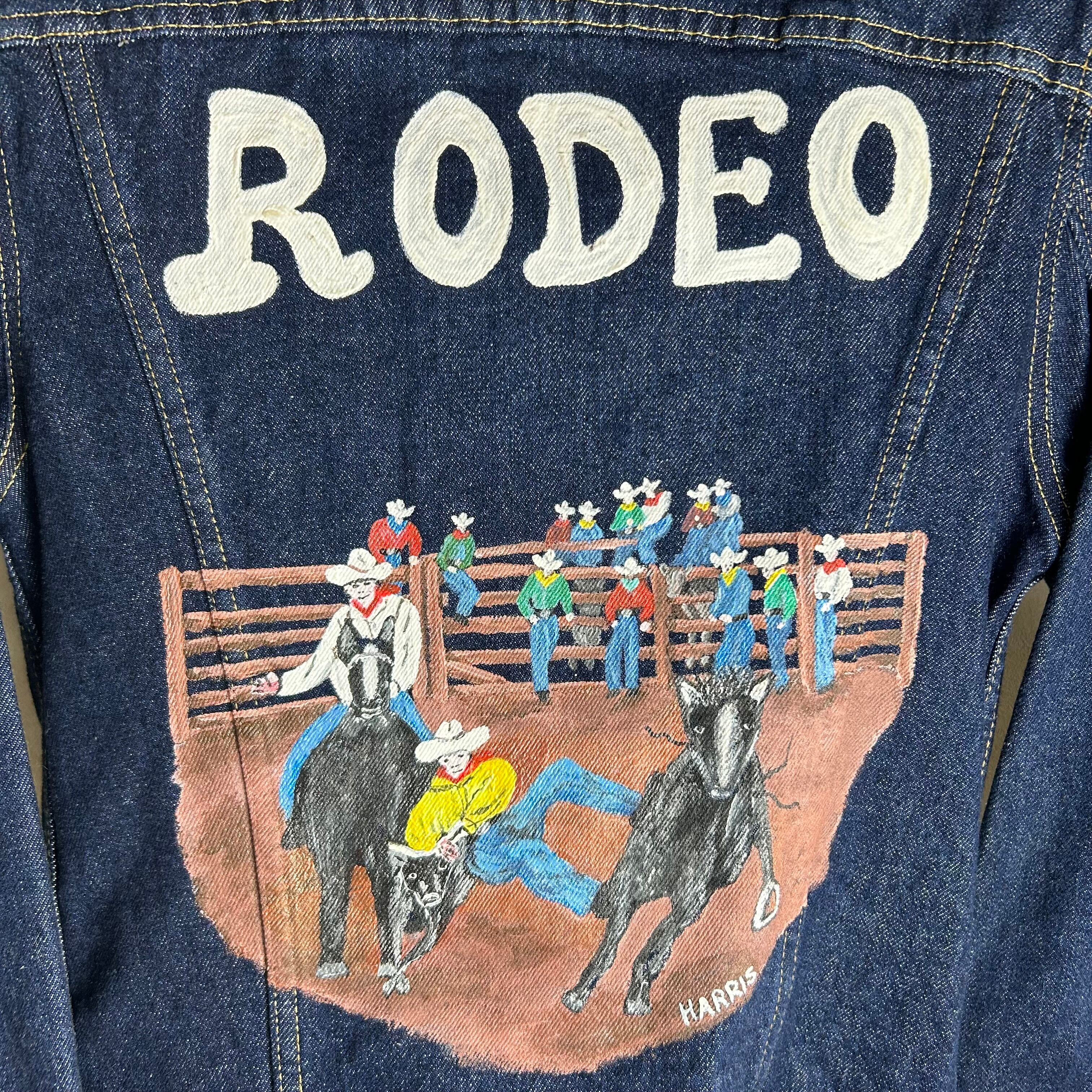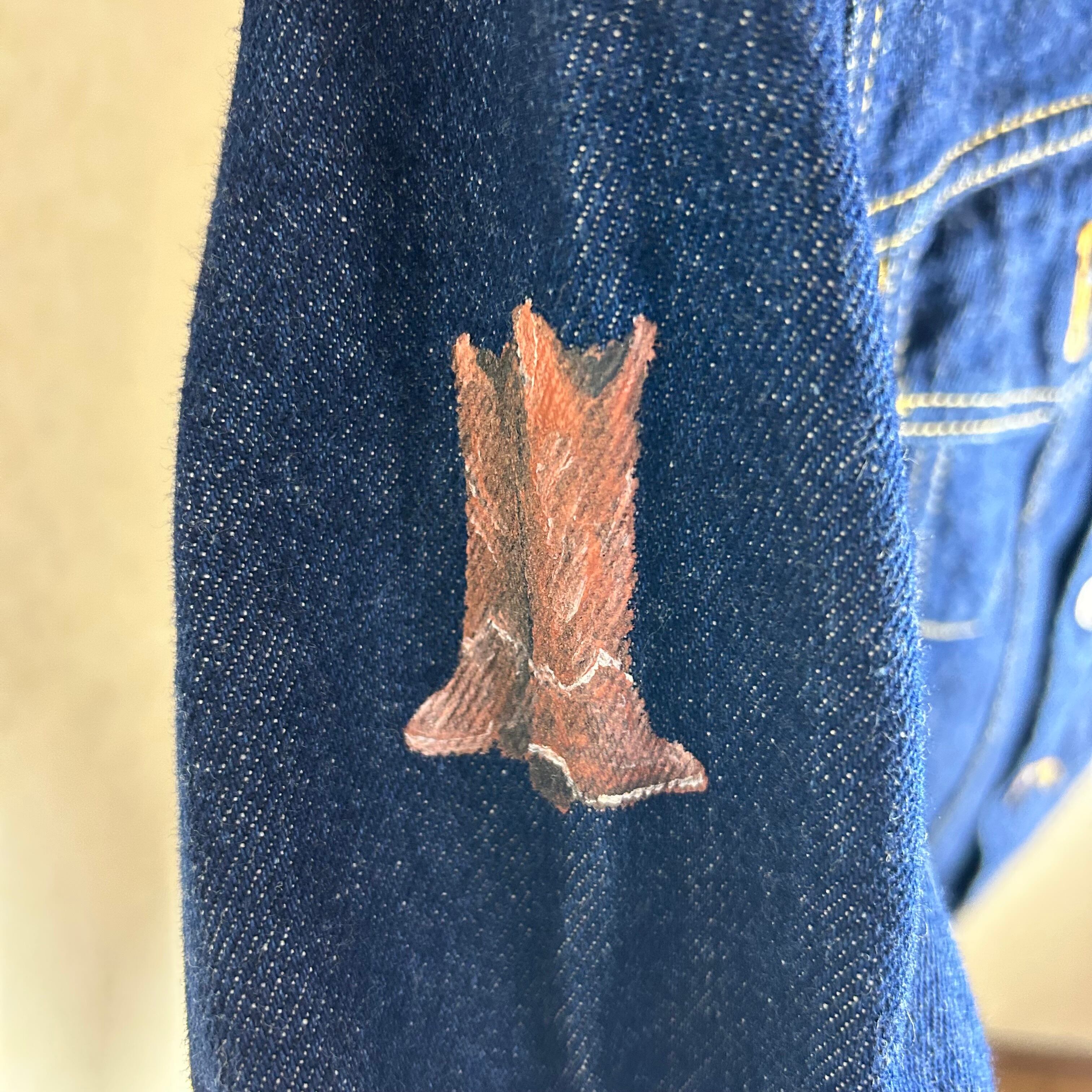 濃紺の生地にペイントがされたデニムジャケットです。ペイントはウエスタンに統一されていてかなりおもしろいとおもいます。