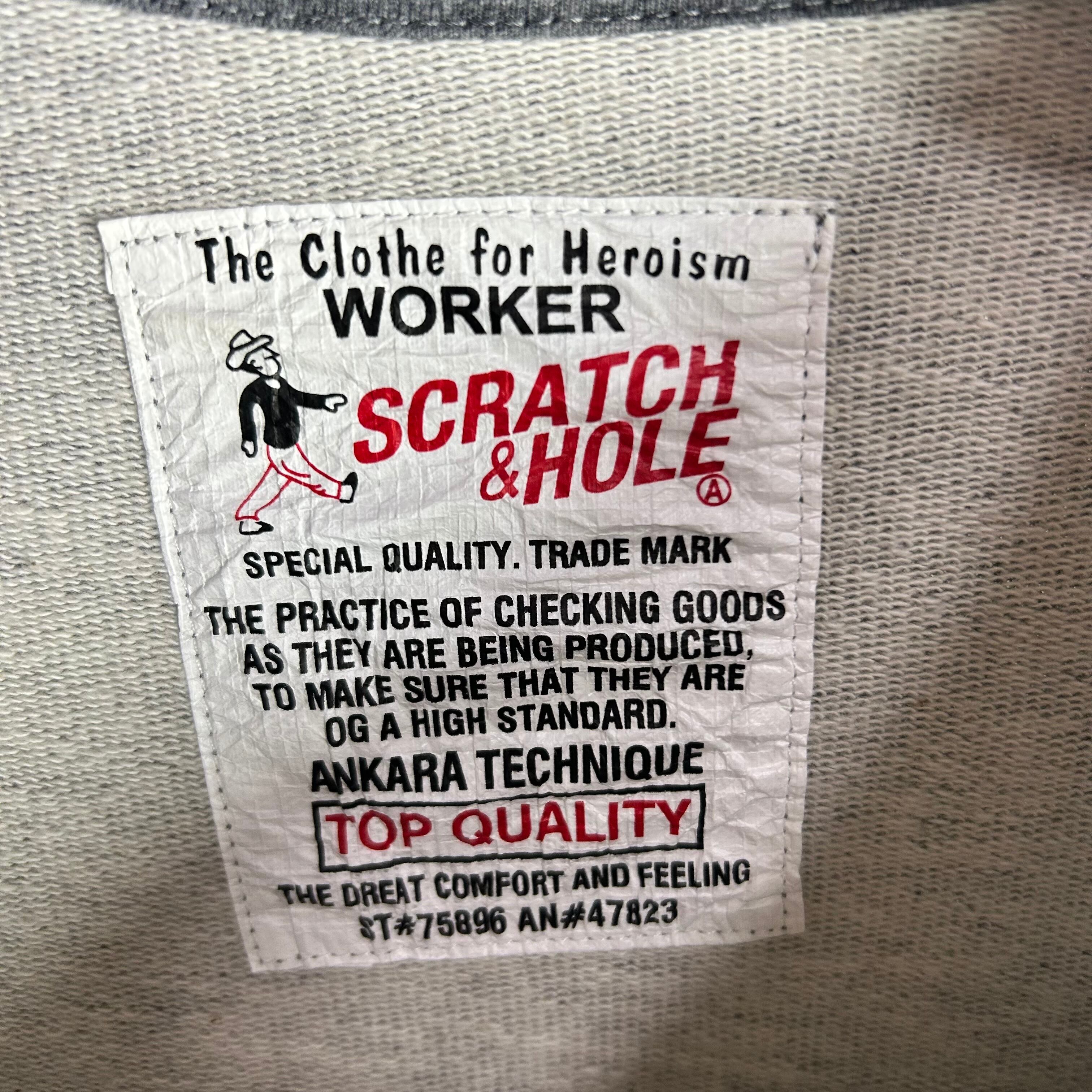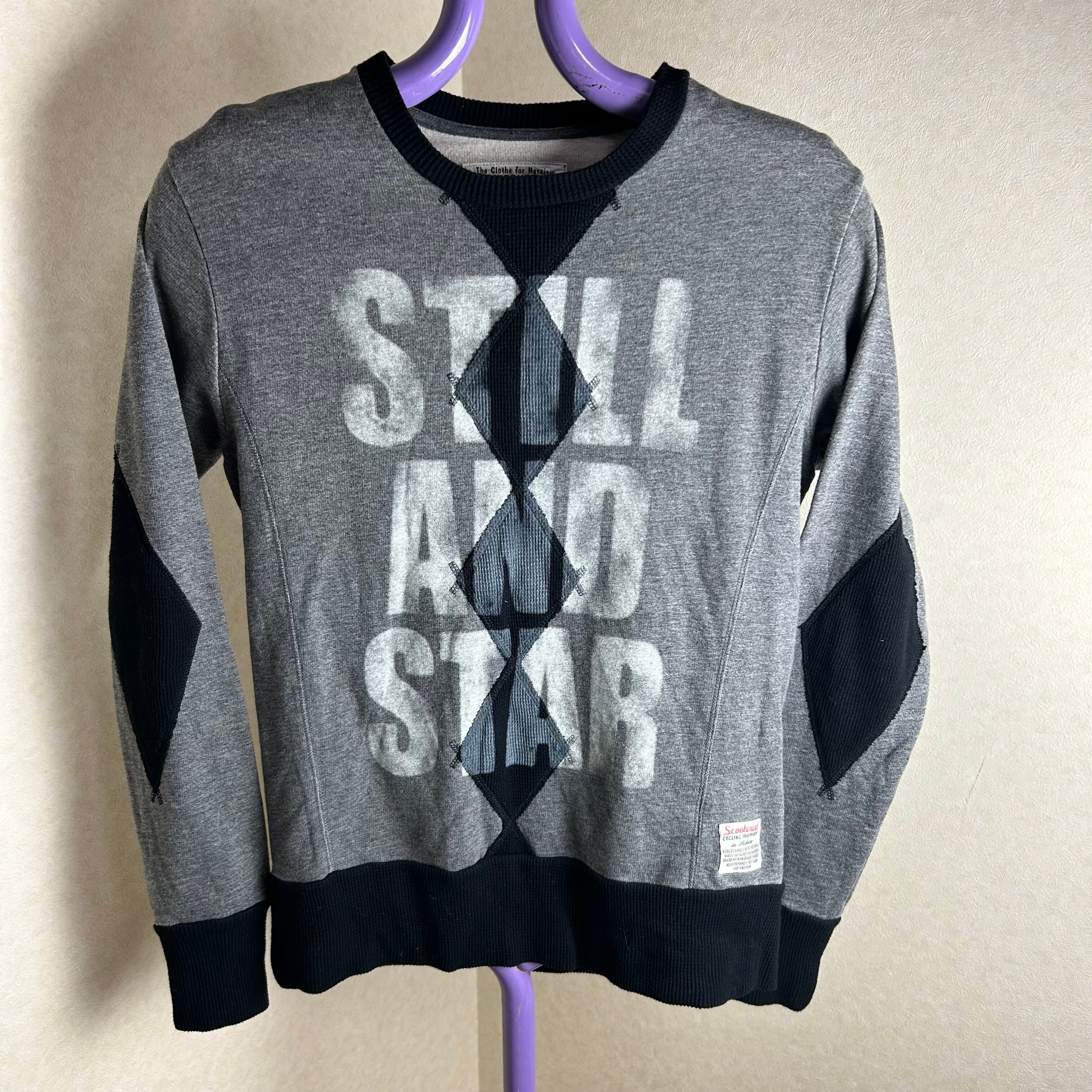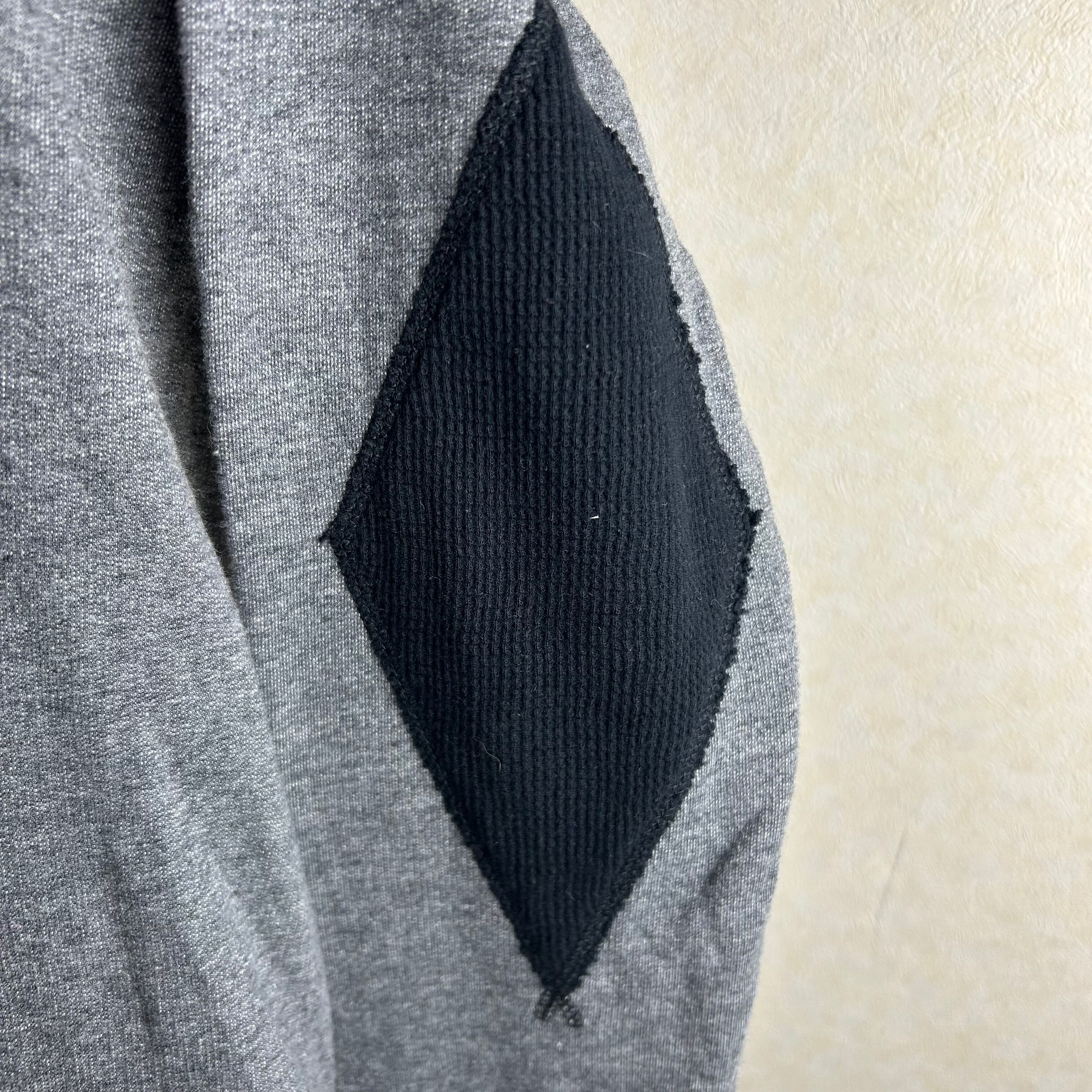 SCRATCH&HOLEのダークグレーのスウェットです。フロントに大きく文字がありアーガイル柄が重なったデザインです。エルボーパッチもアーガイルになってておもしろい1点になってます。