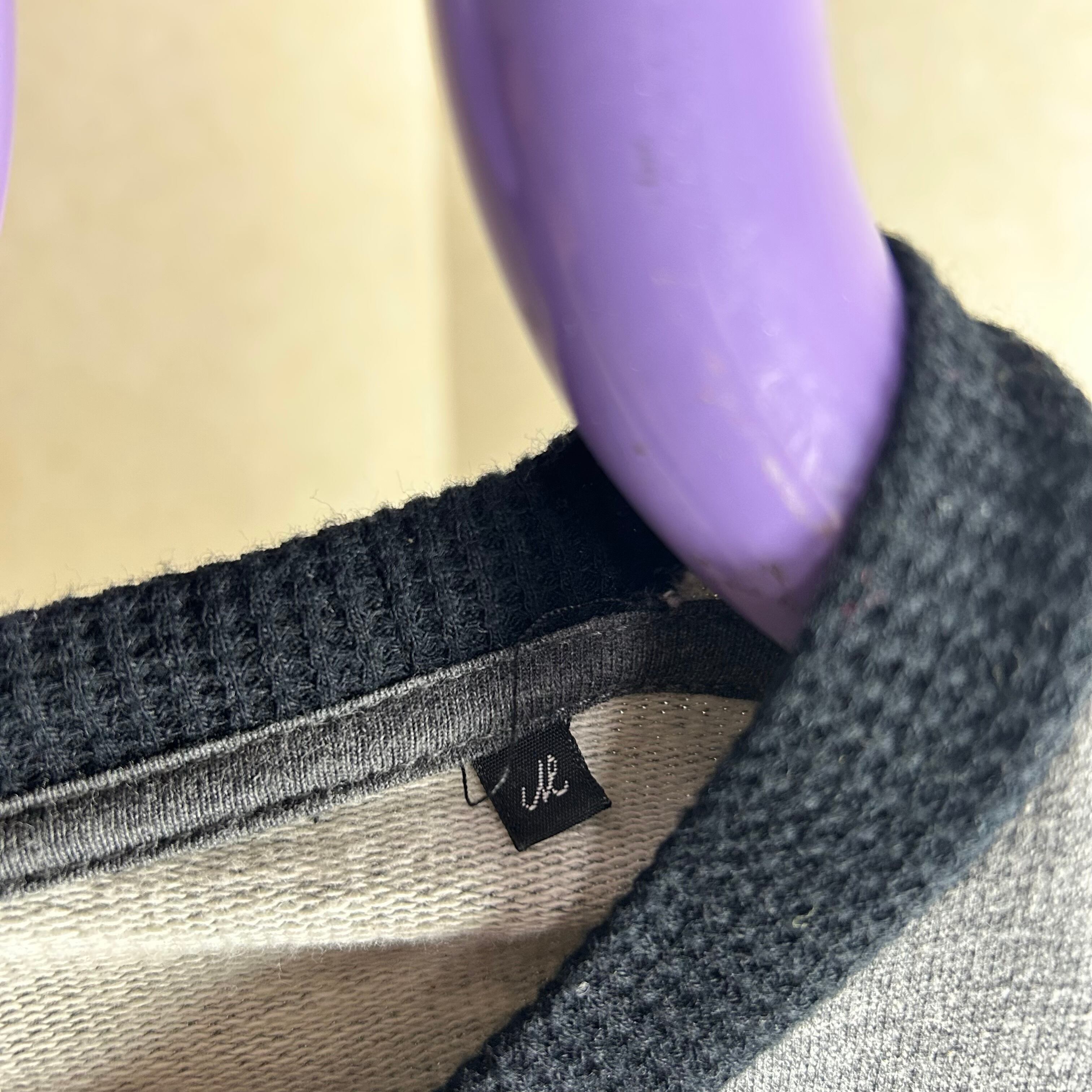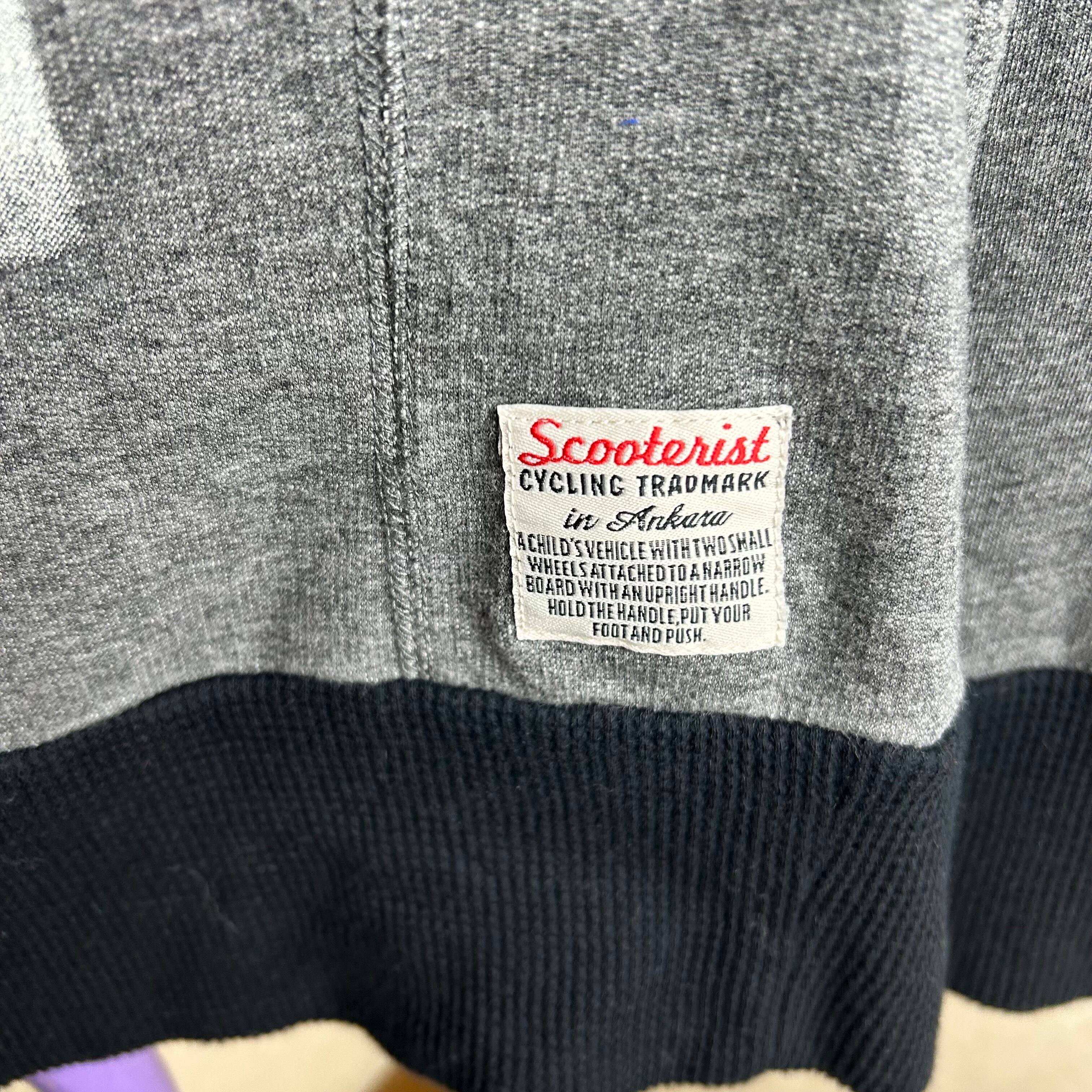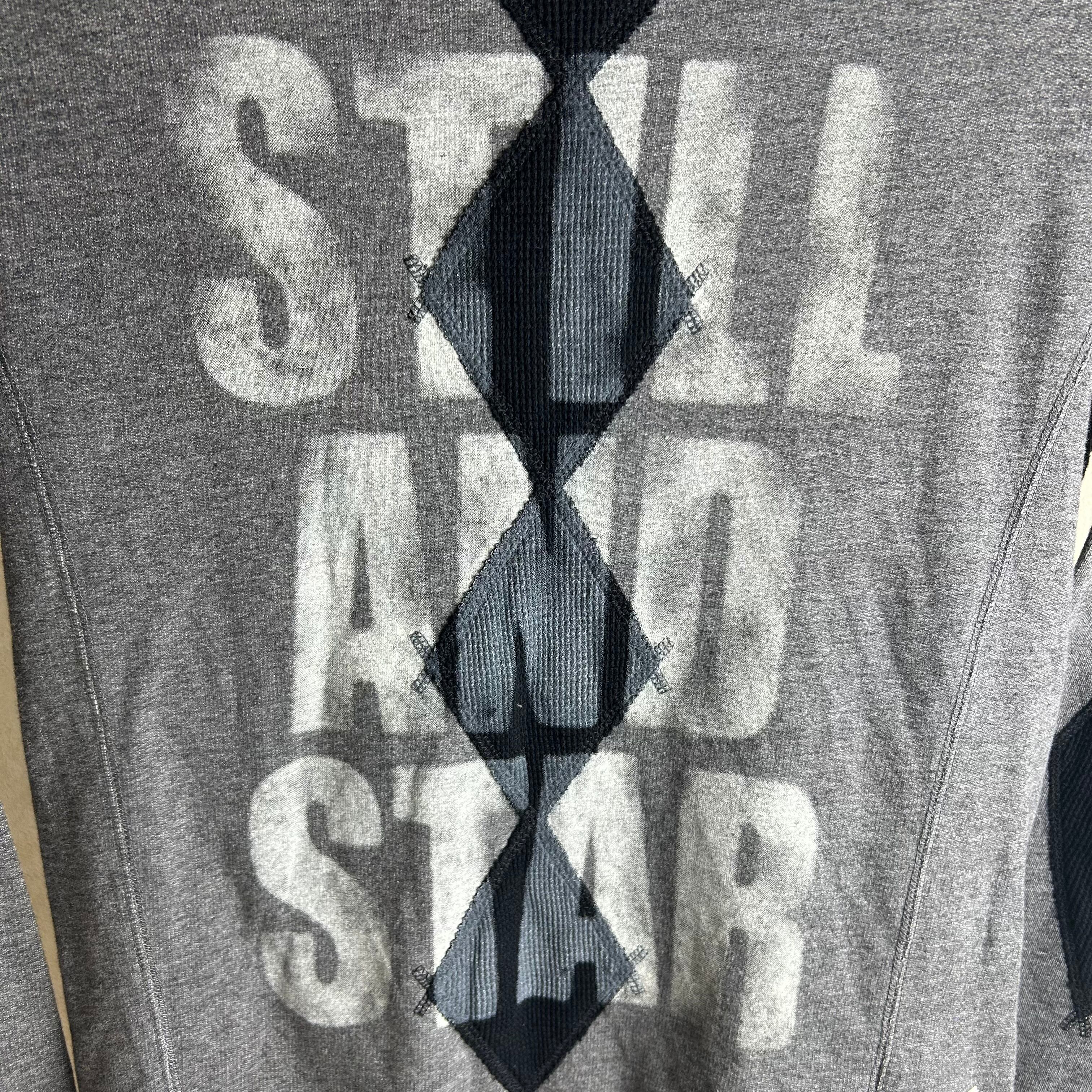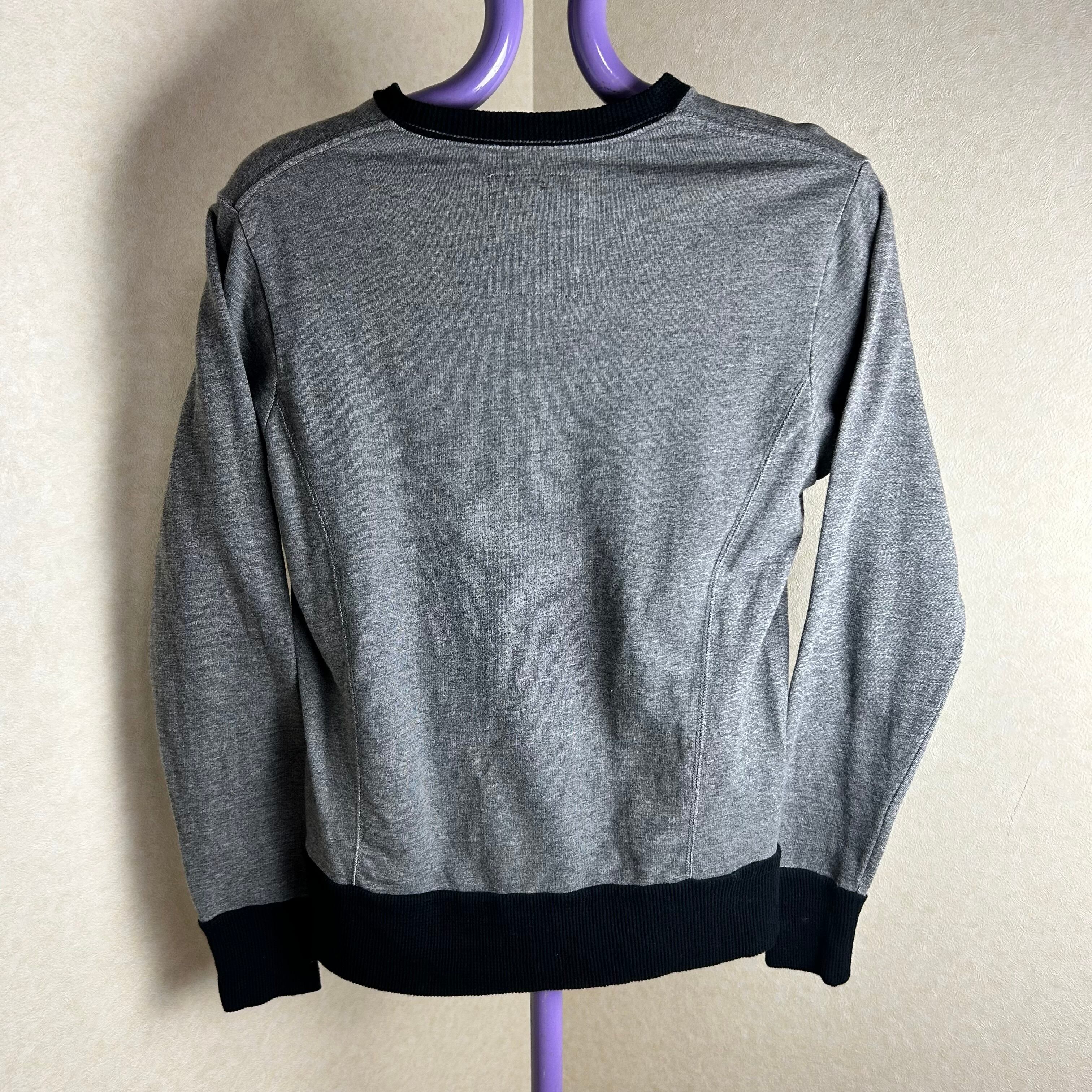 SCRATCH&HOLEのダークグレーのスウェットです。フロントに大きく文字がありアーガイル柄が重なったデザインです。エルボーパッチもアーガイルになってておもしろい1点になってます。