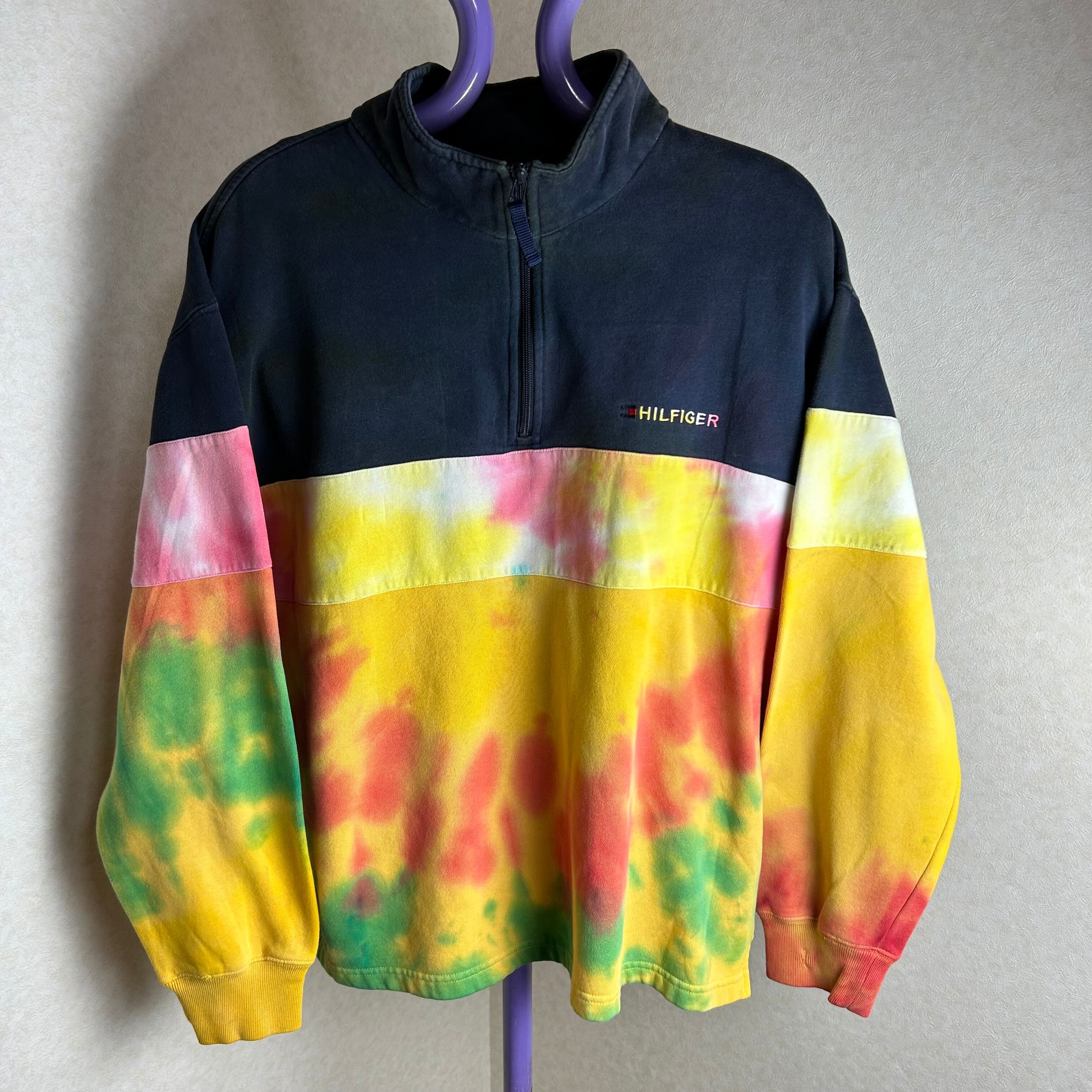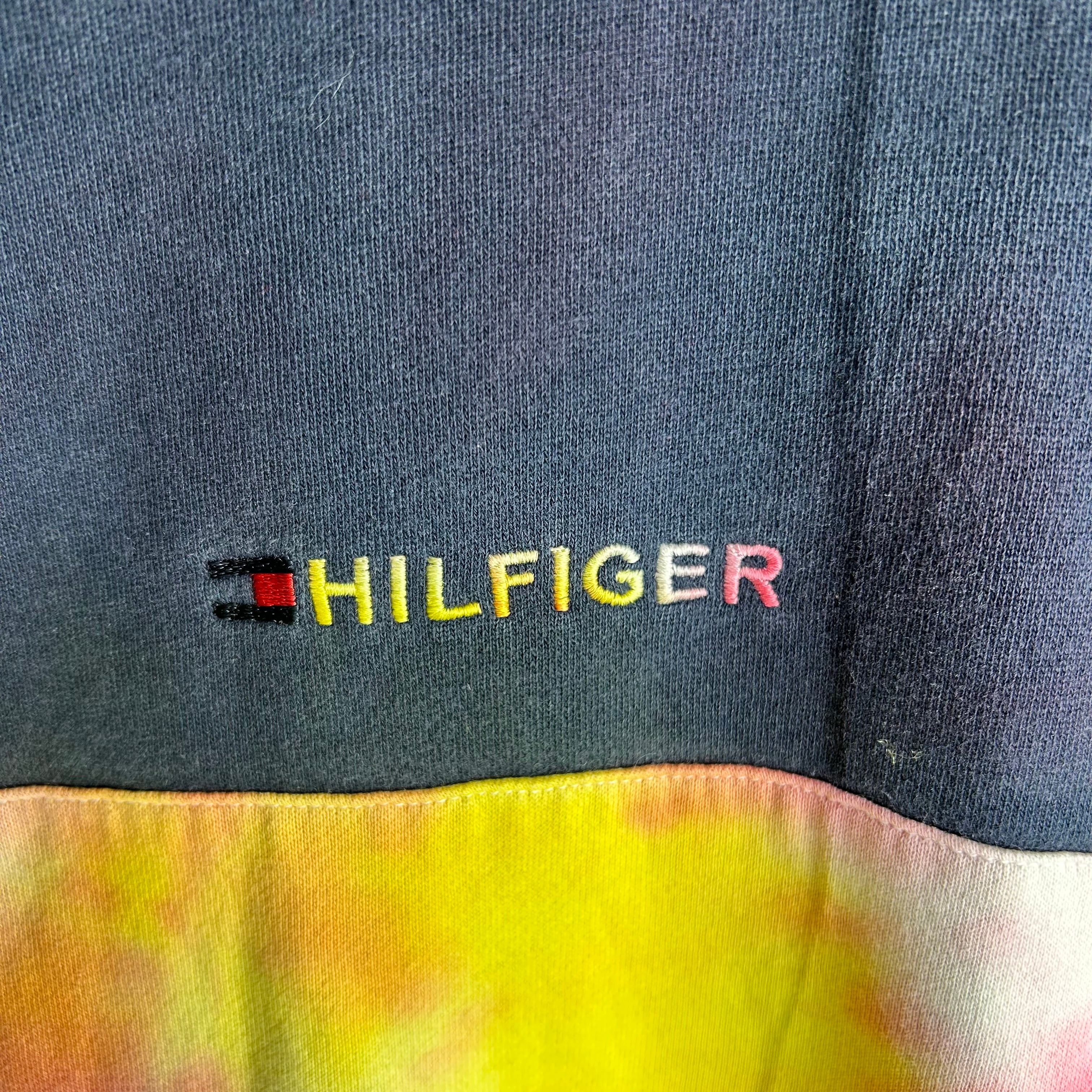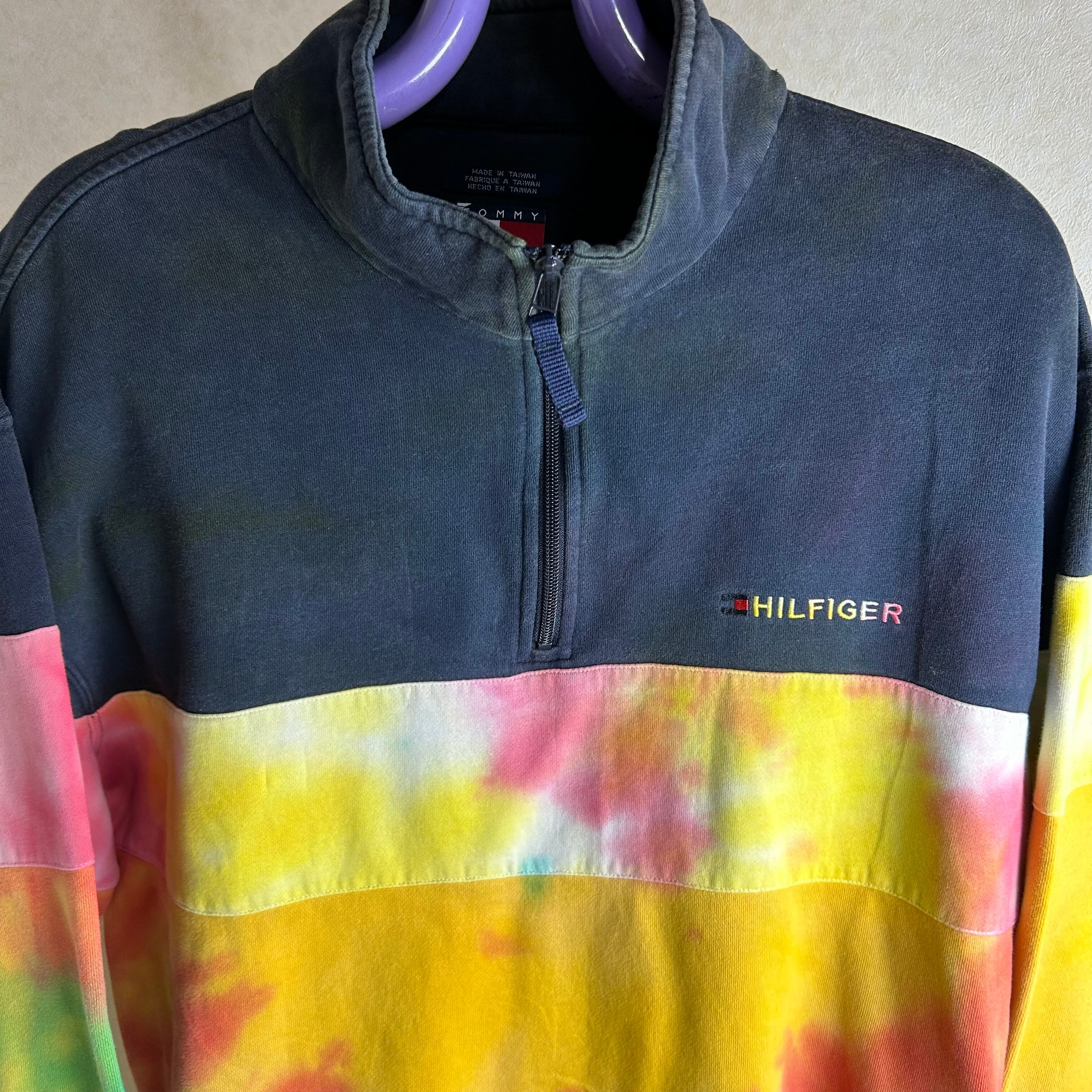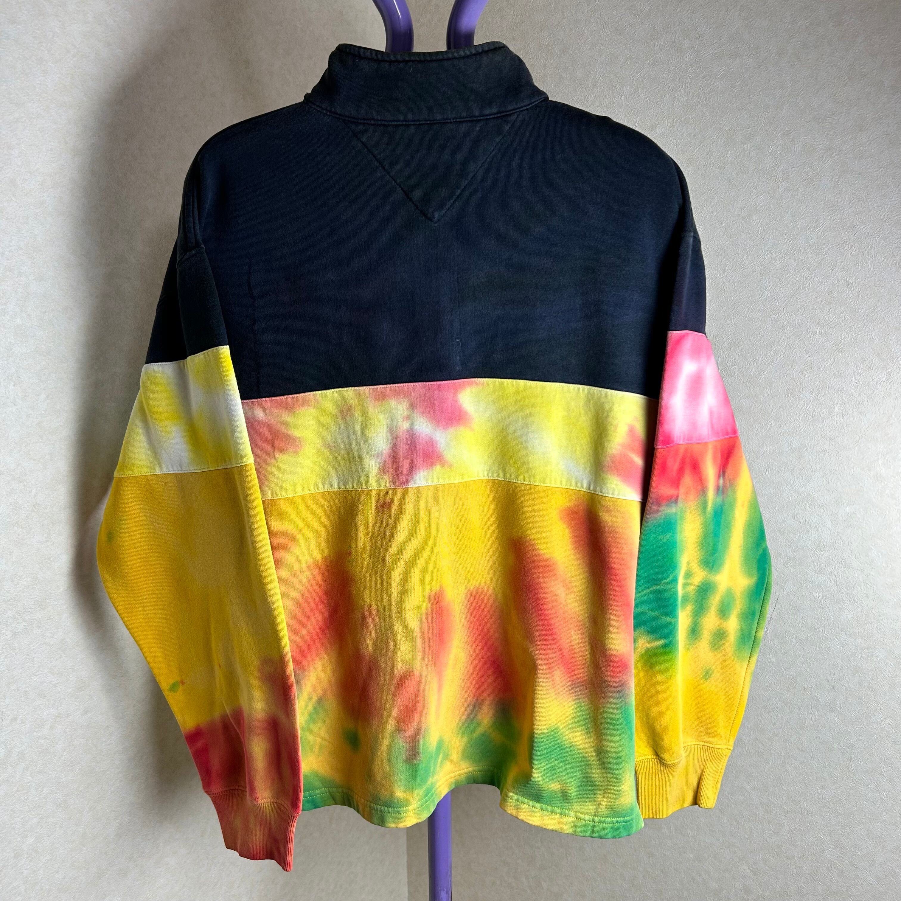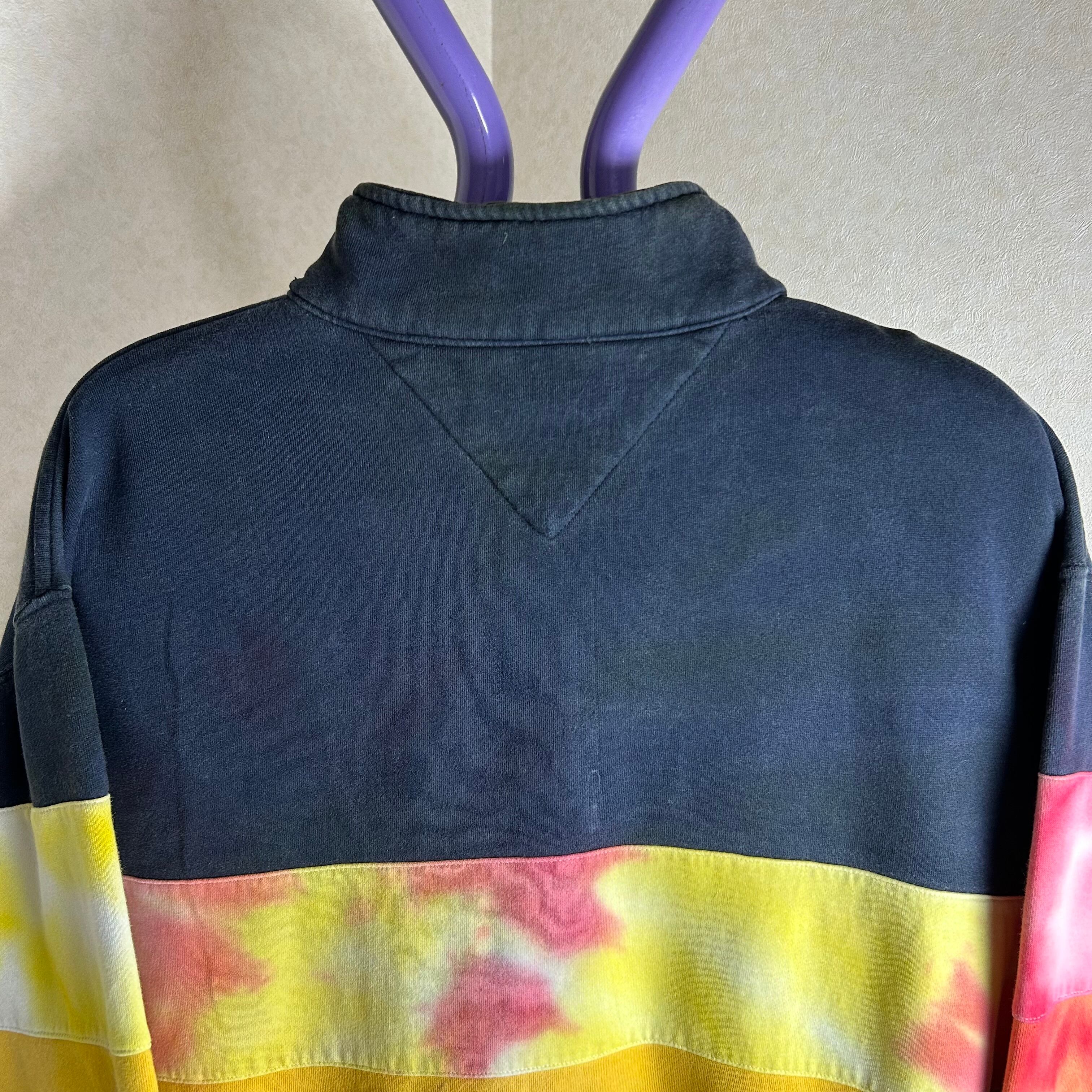 TOMMY HILFIGERのハーフジップのスウェットです。おそらく、元は黒と白だったと思うのですがタイダイ柄に染められています。一見派手ですが、実際着てみるとスタイリングの邪魔はしないです。