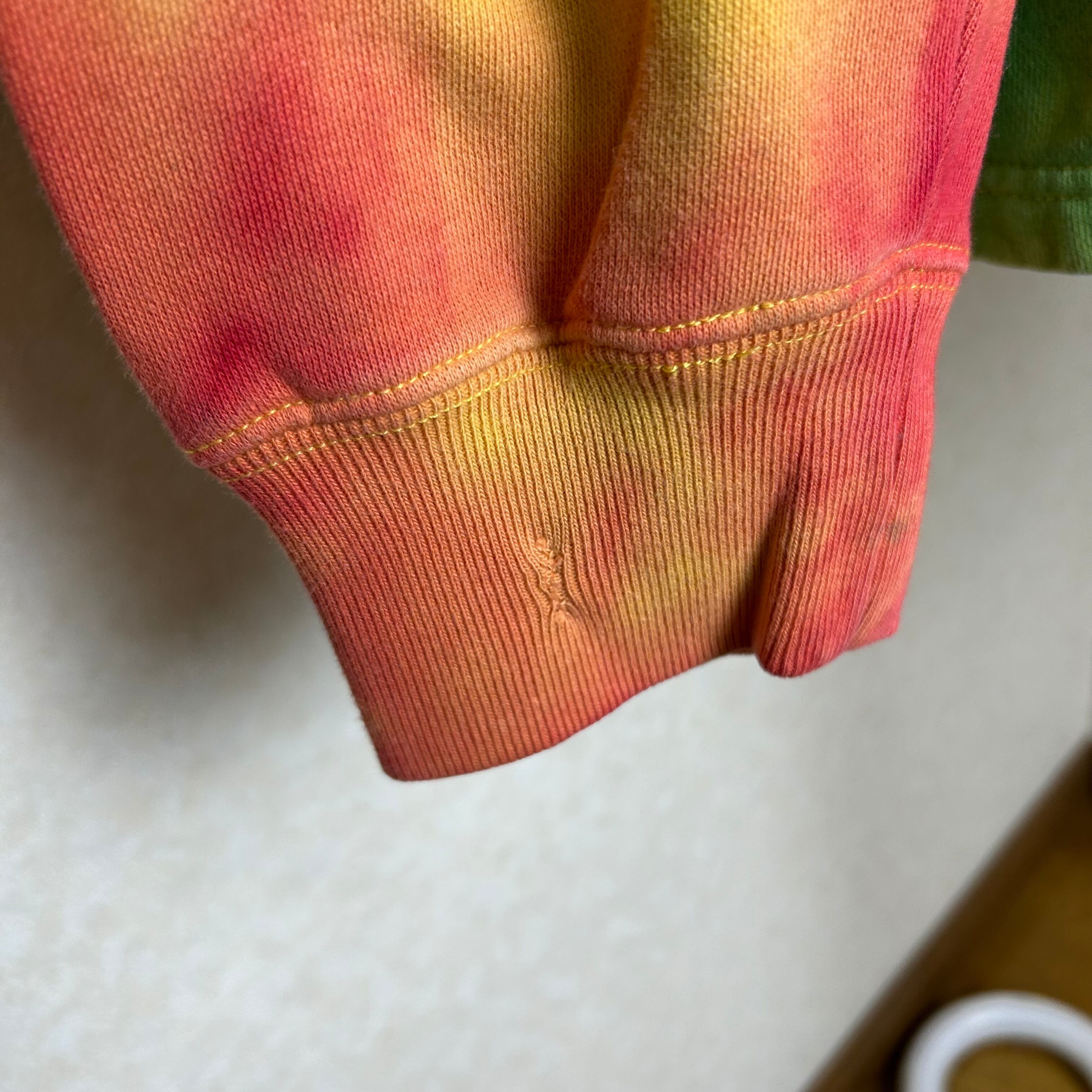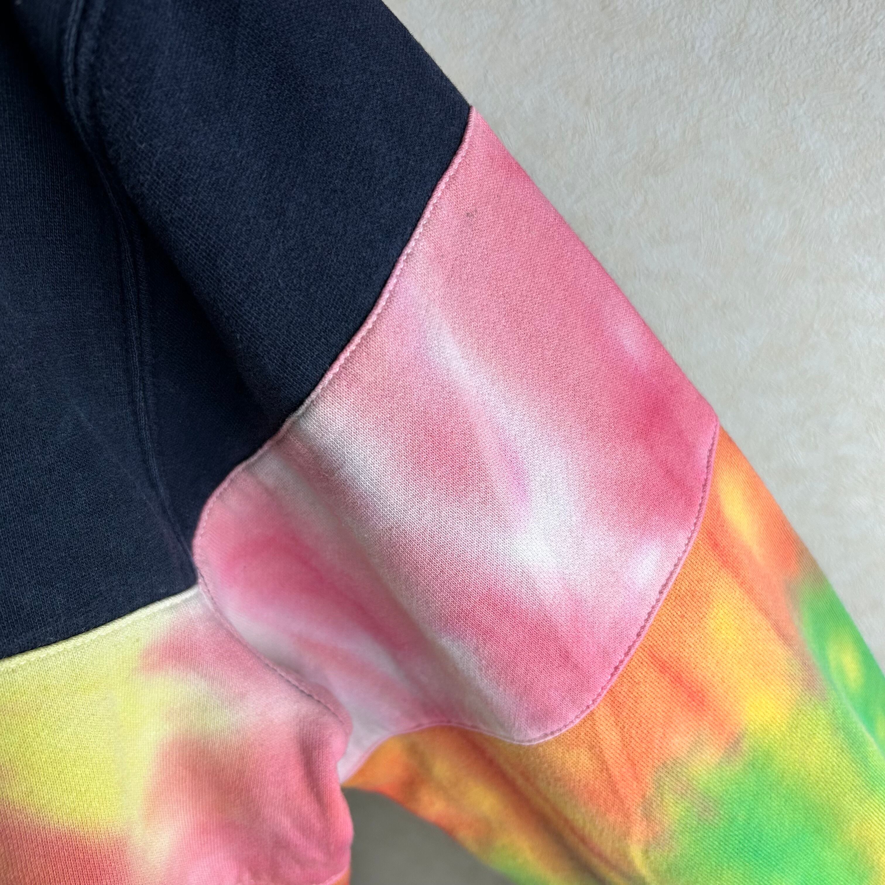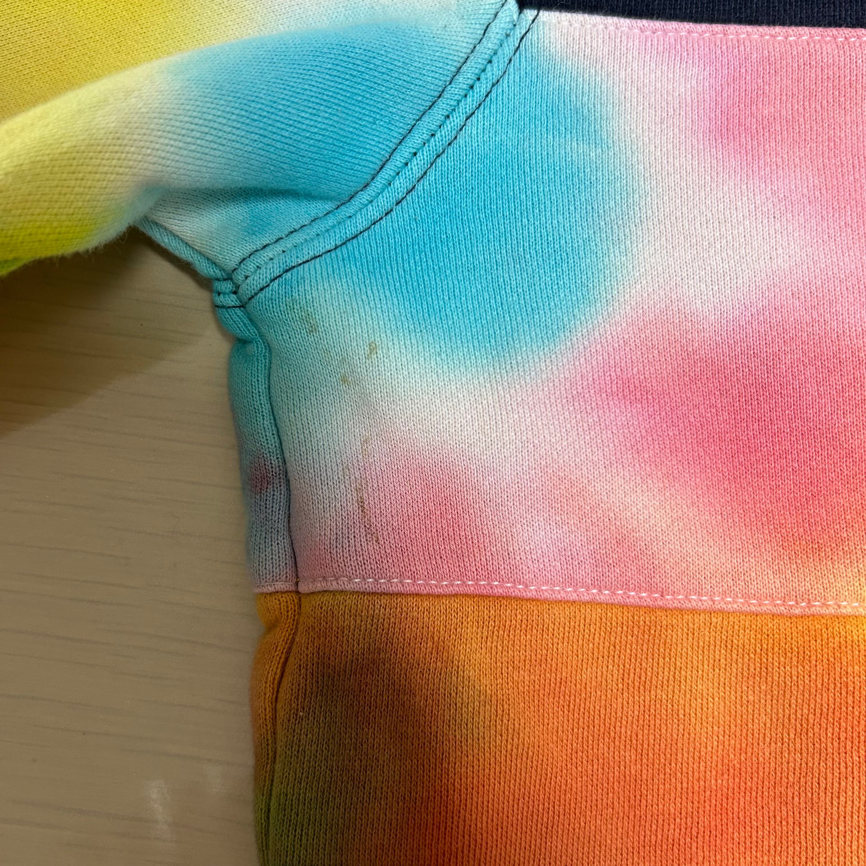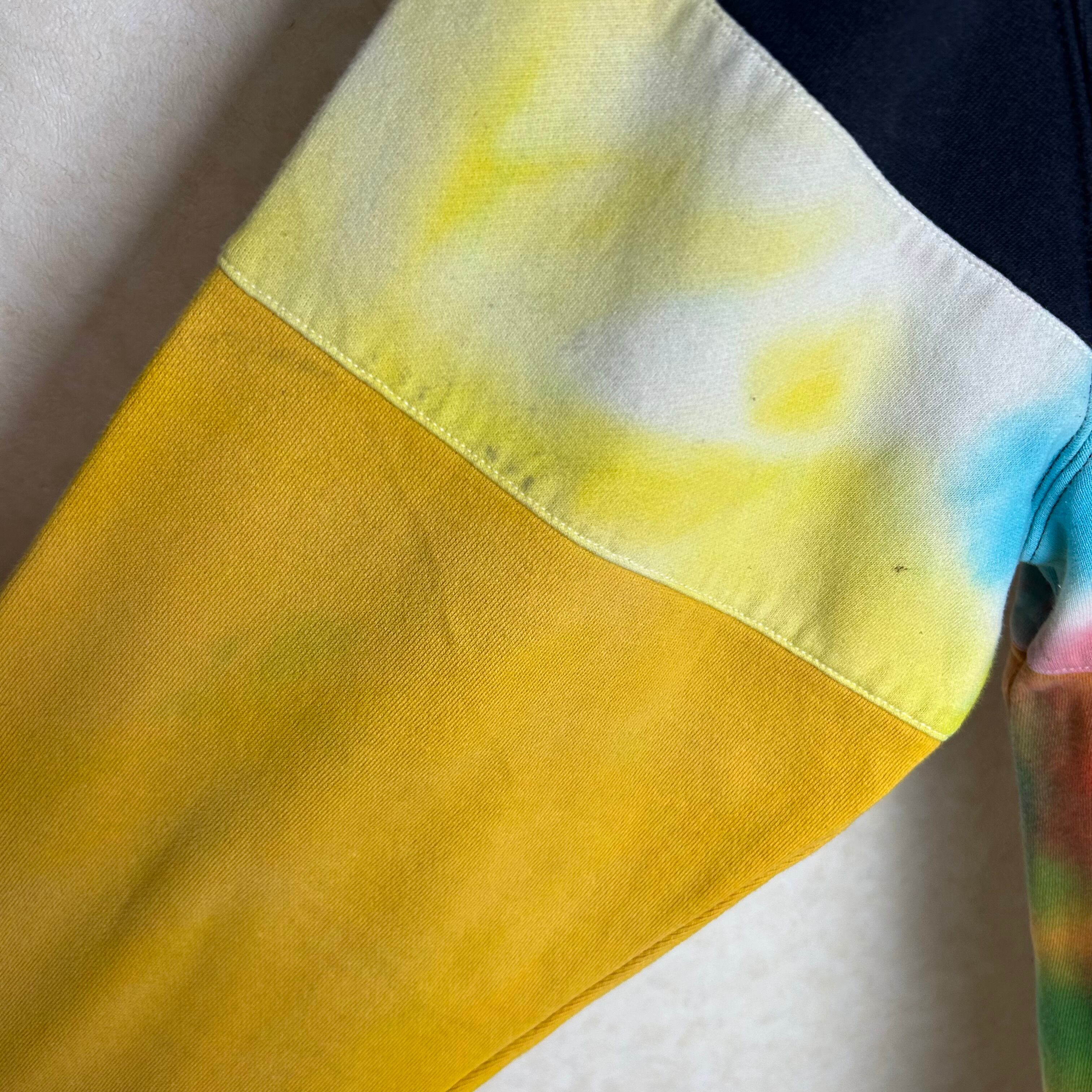 TOMMY HILFIGERのハーフジップのスウェットです。おそらく、元は黒と白だったと思うのですがタイダイ柄に染められています。一見派手ですが、実際着てみるとスタイリングの邪魔はしないです。