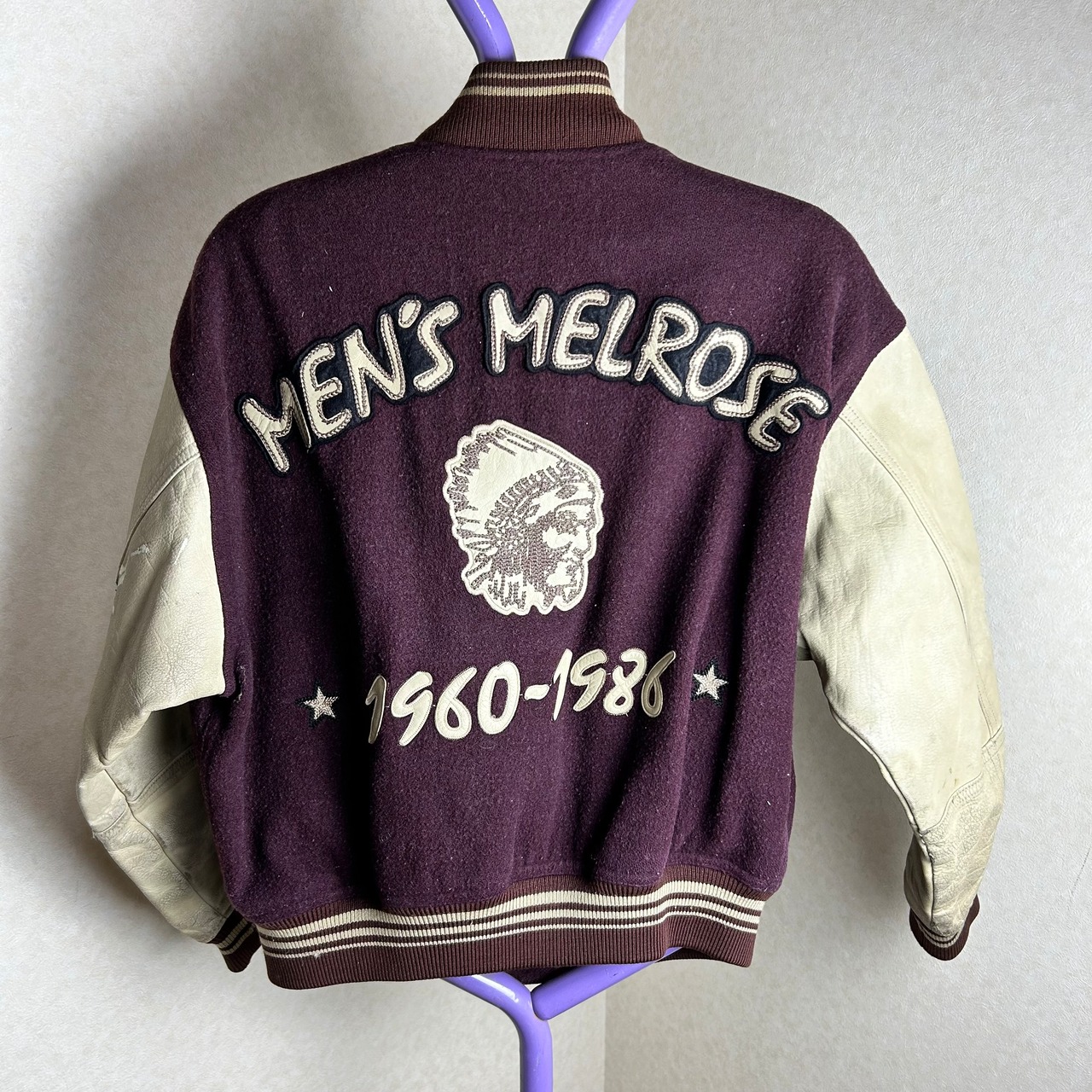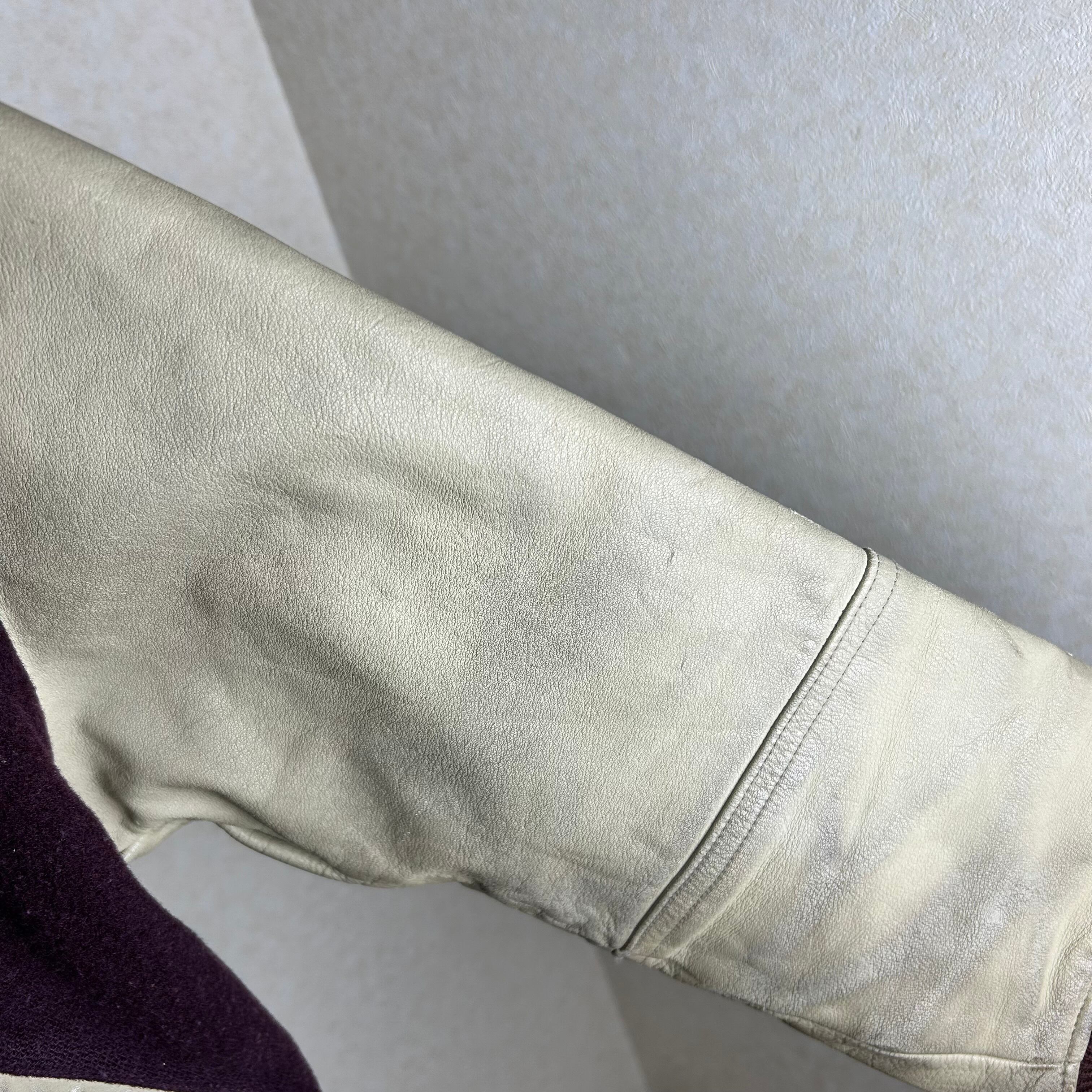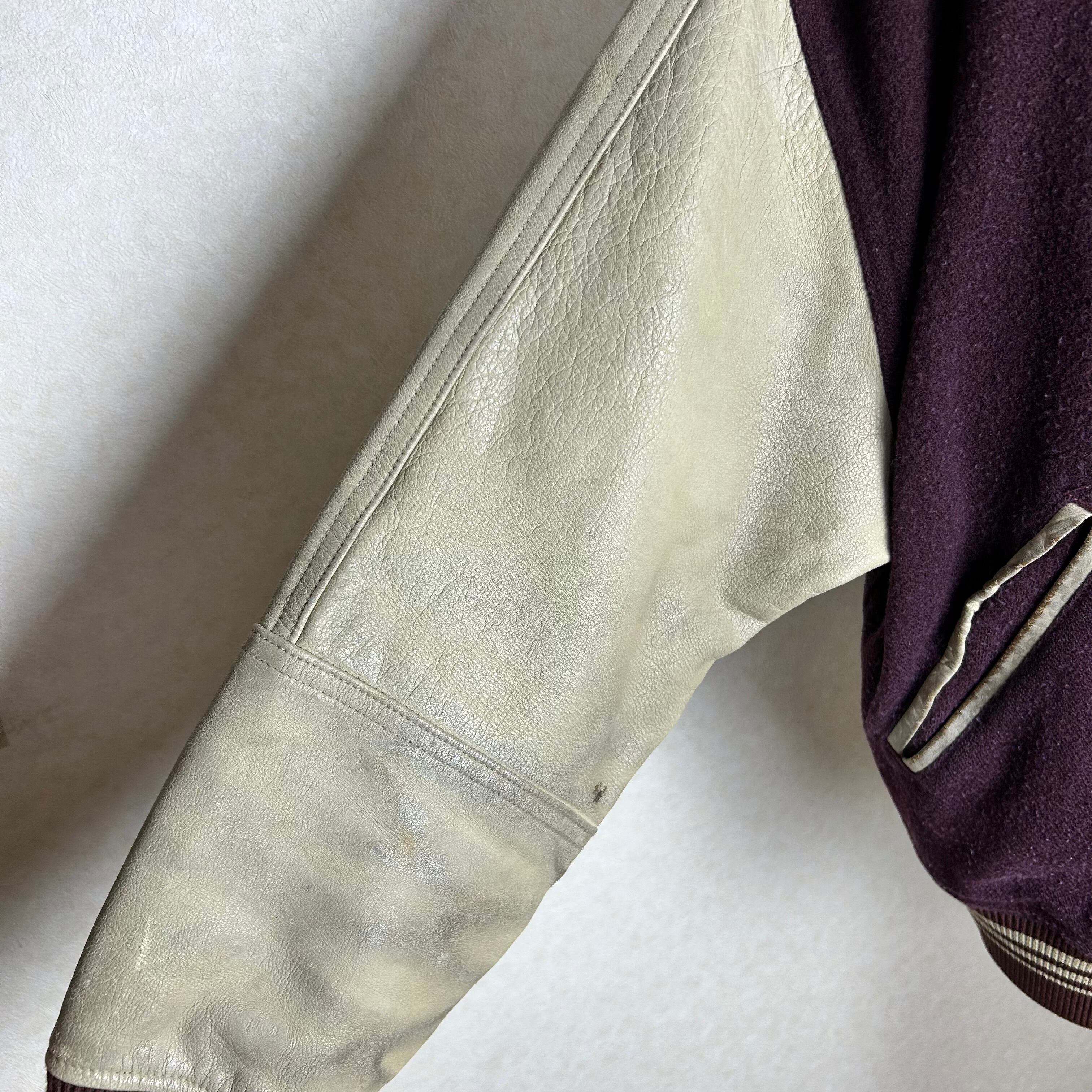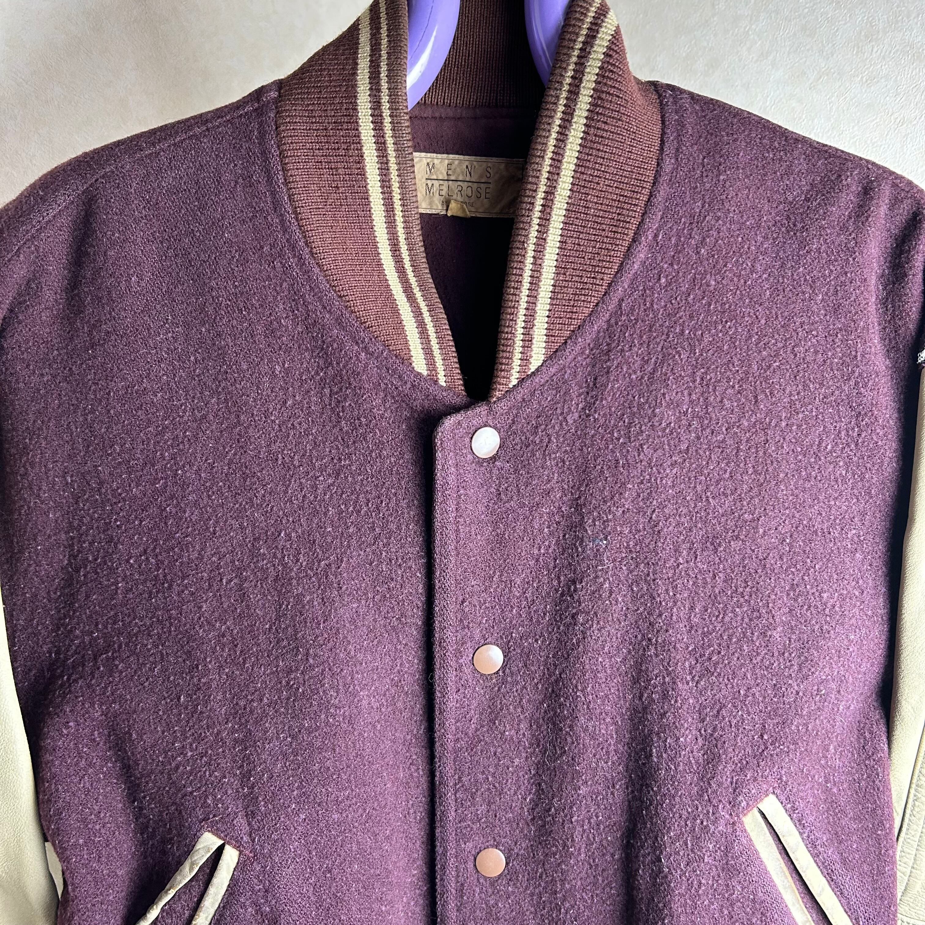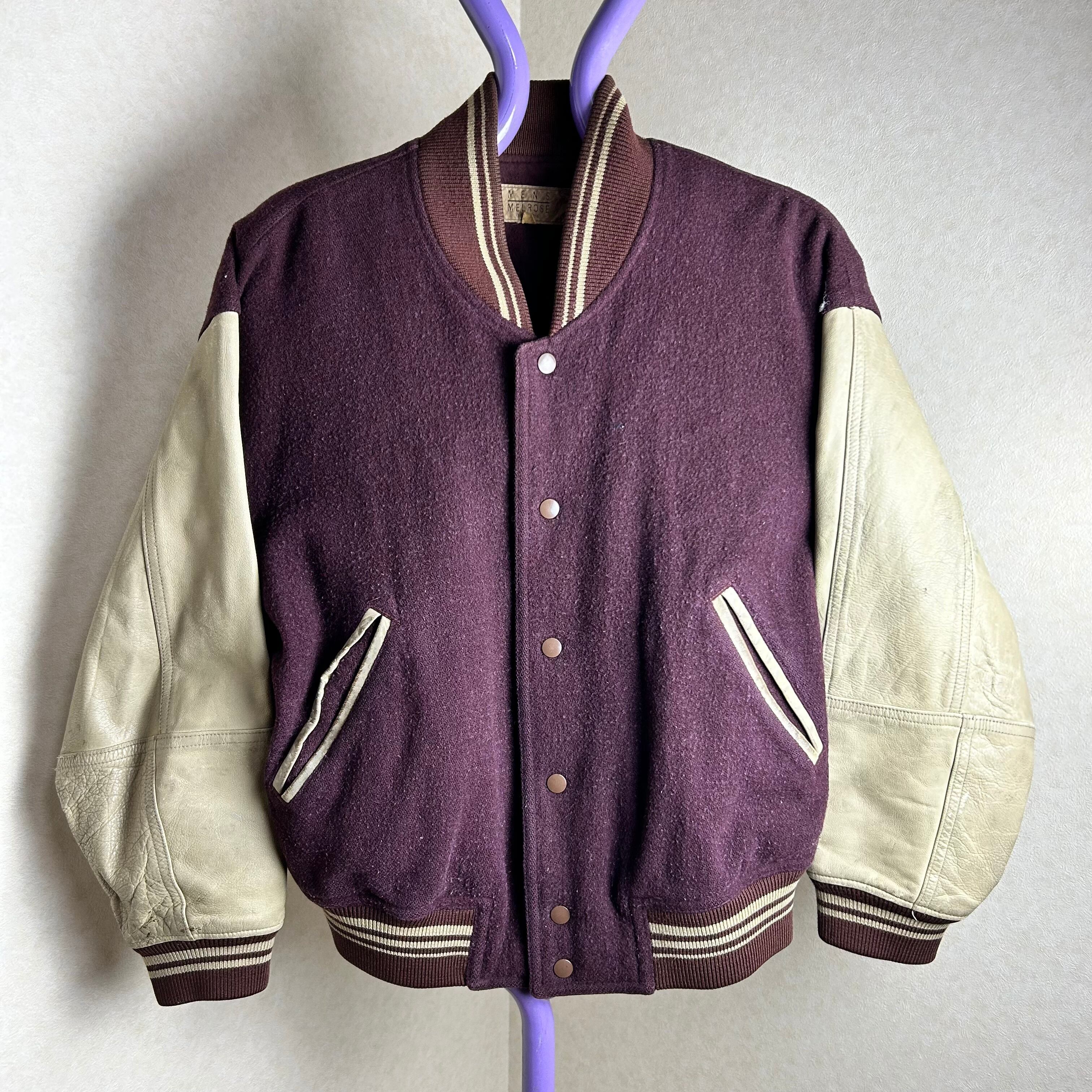 ワインレッドのボディーに袖は切り返しでレザーになったスタジャンです。何の上に着ても1枚で主役になる1点です。