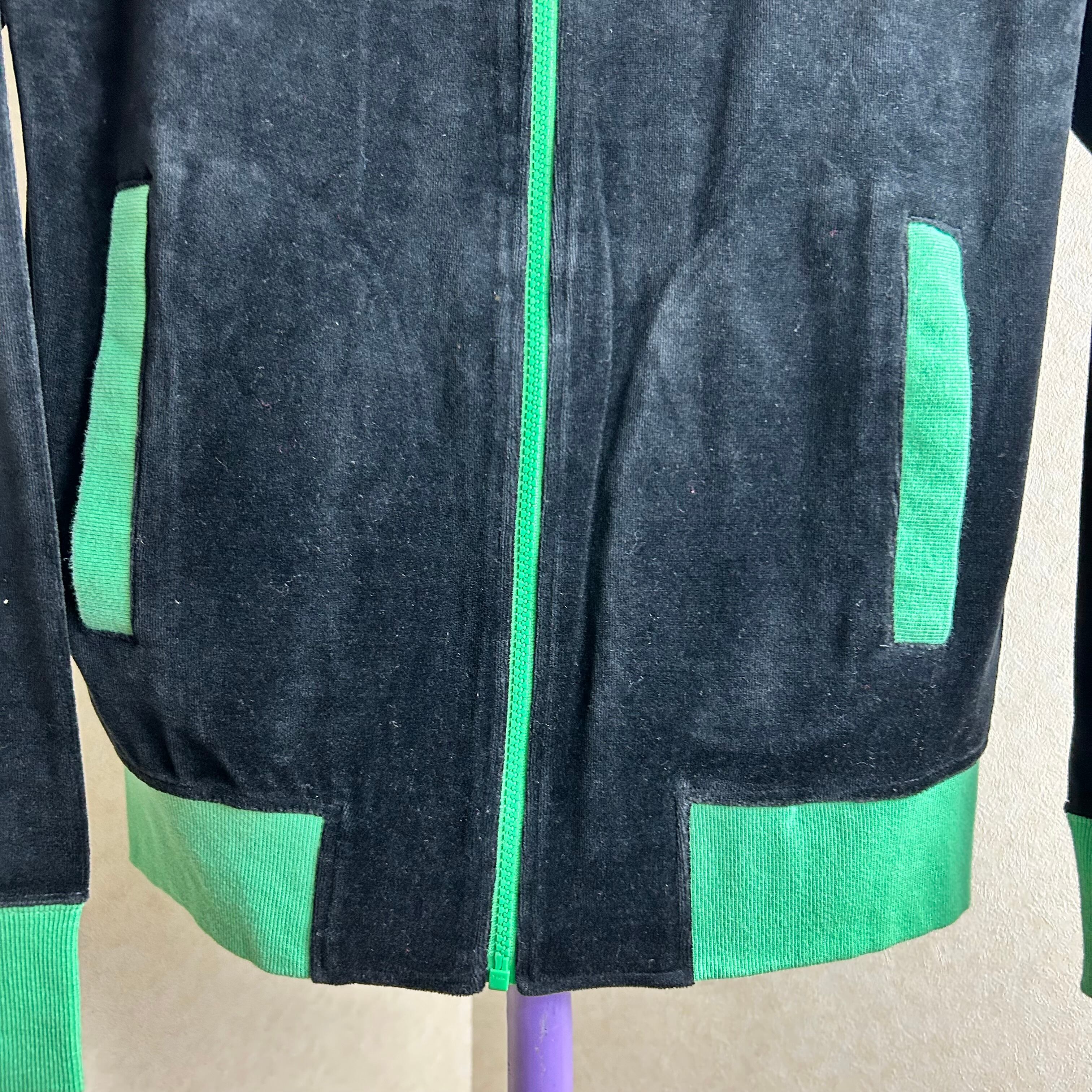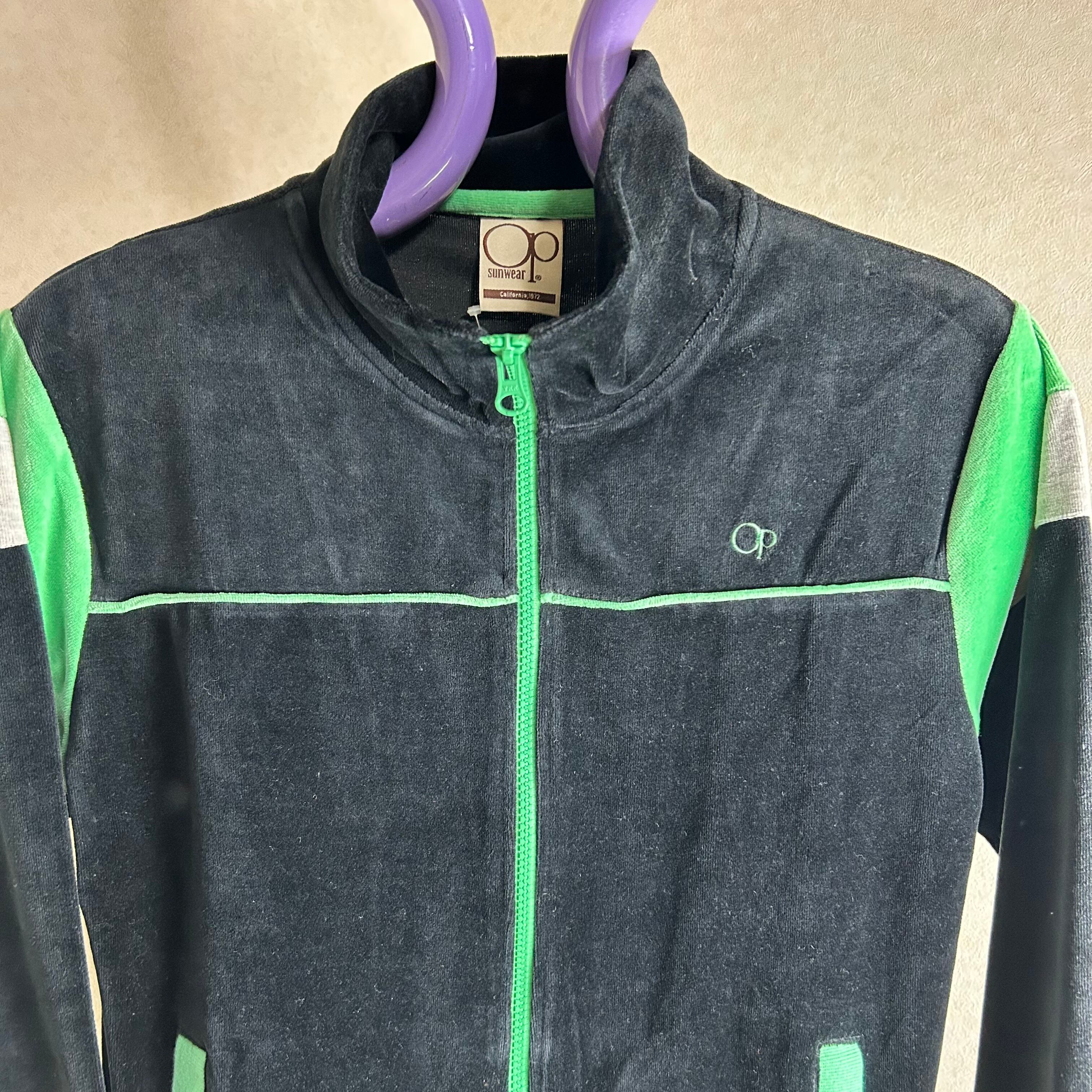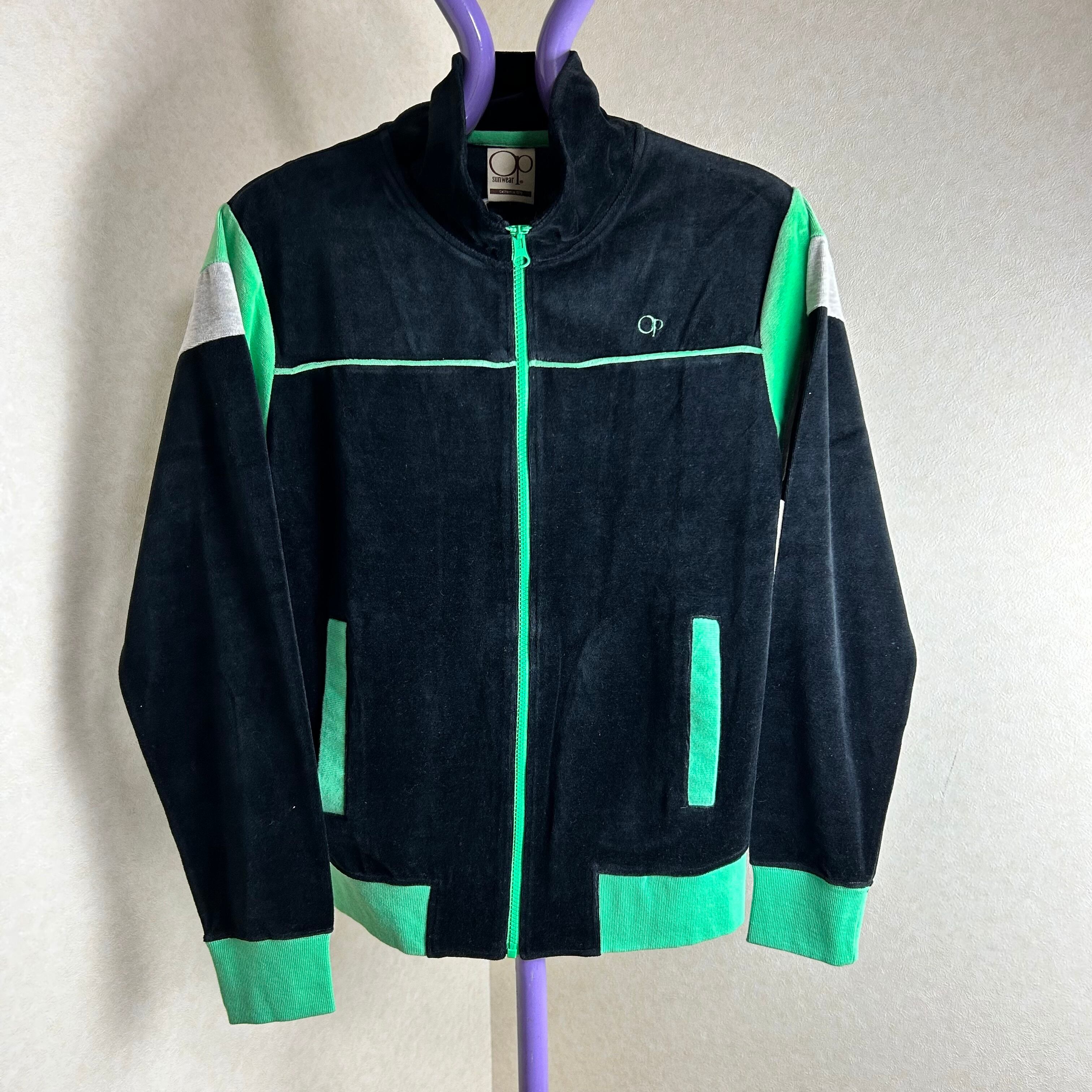 OCEAN PACIFICのベロアのトラックジャケットになります。黒が基調でグリーンでパイピングされています。素材がベロアなので綺麗めなパンツも合わせるのがオススメです。