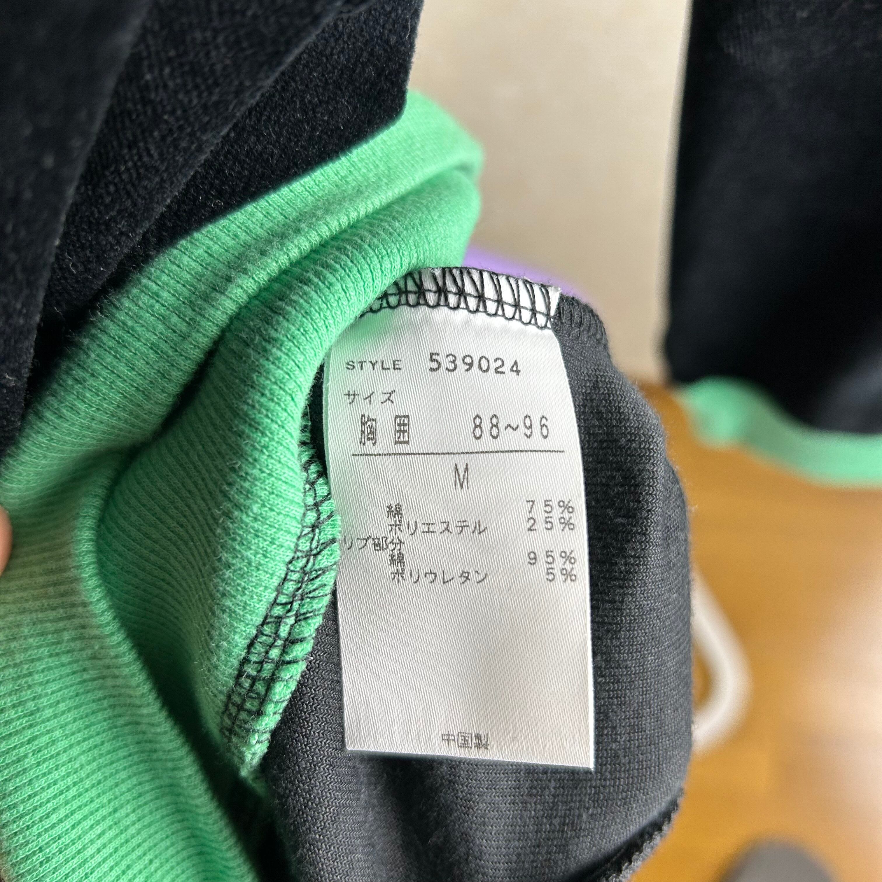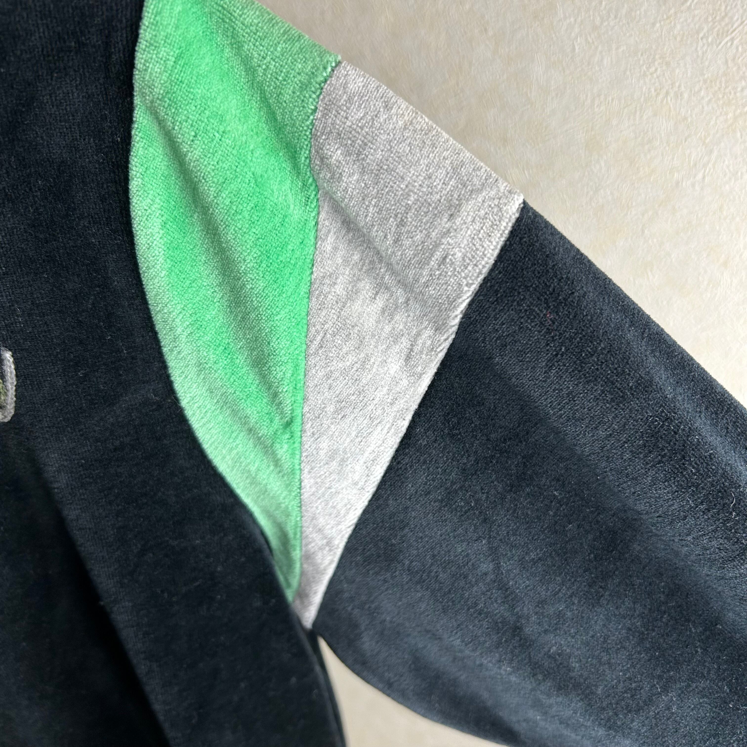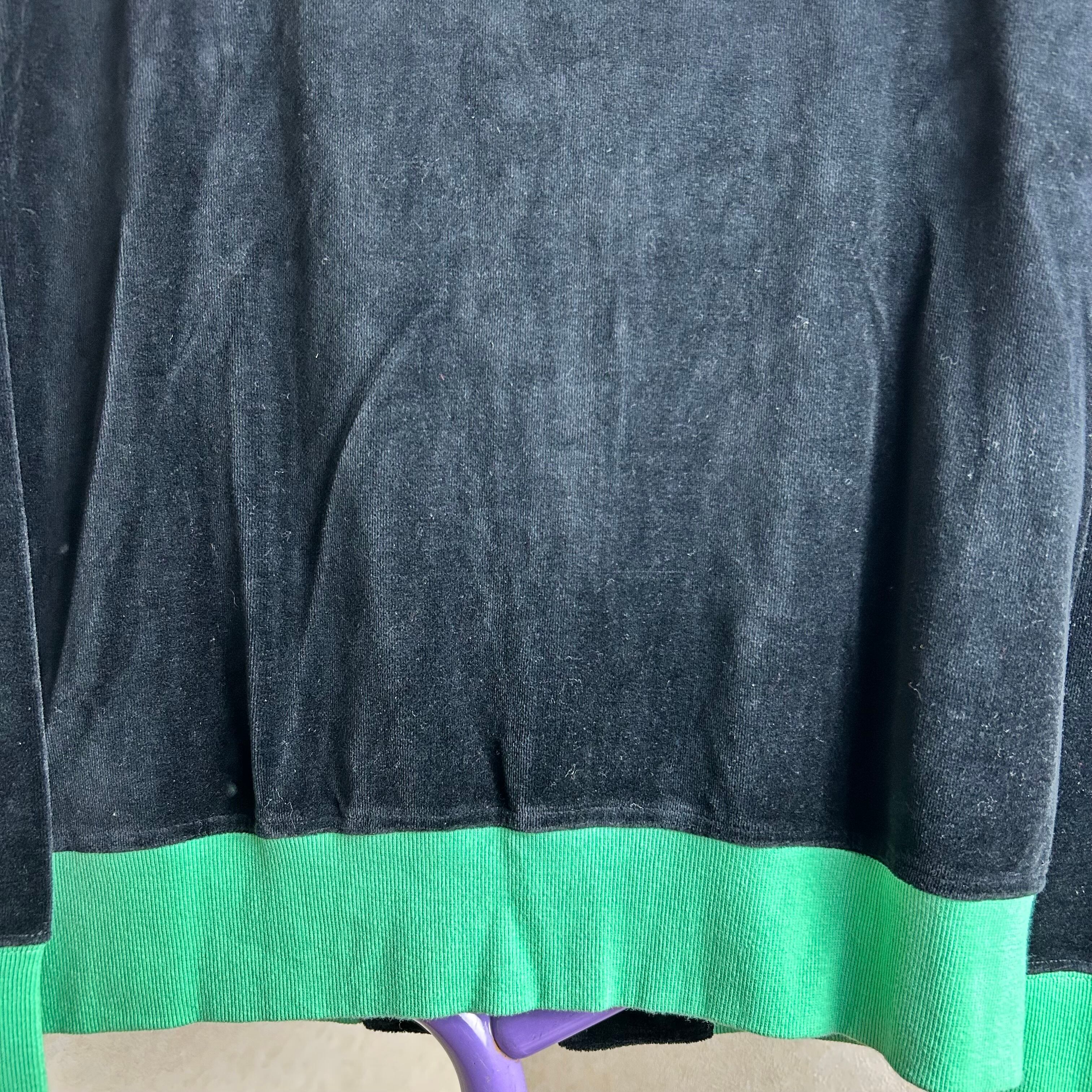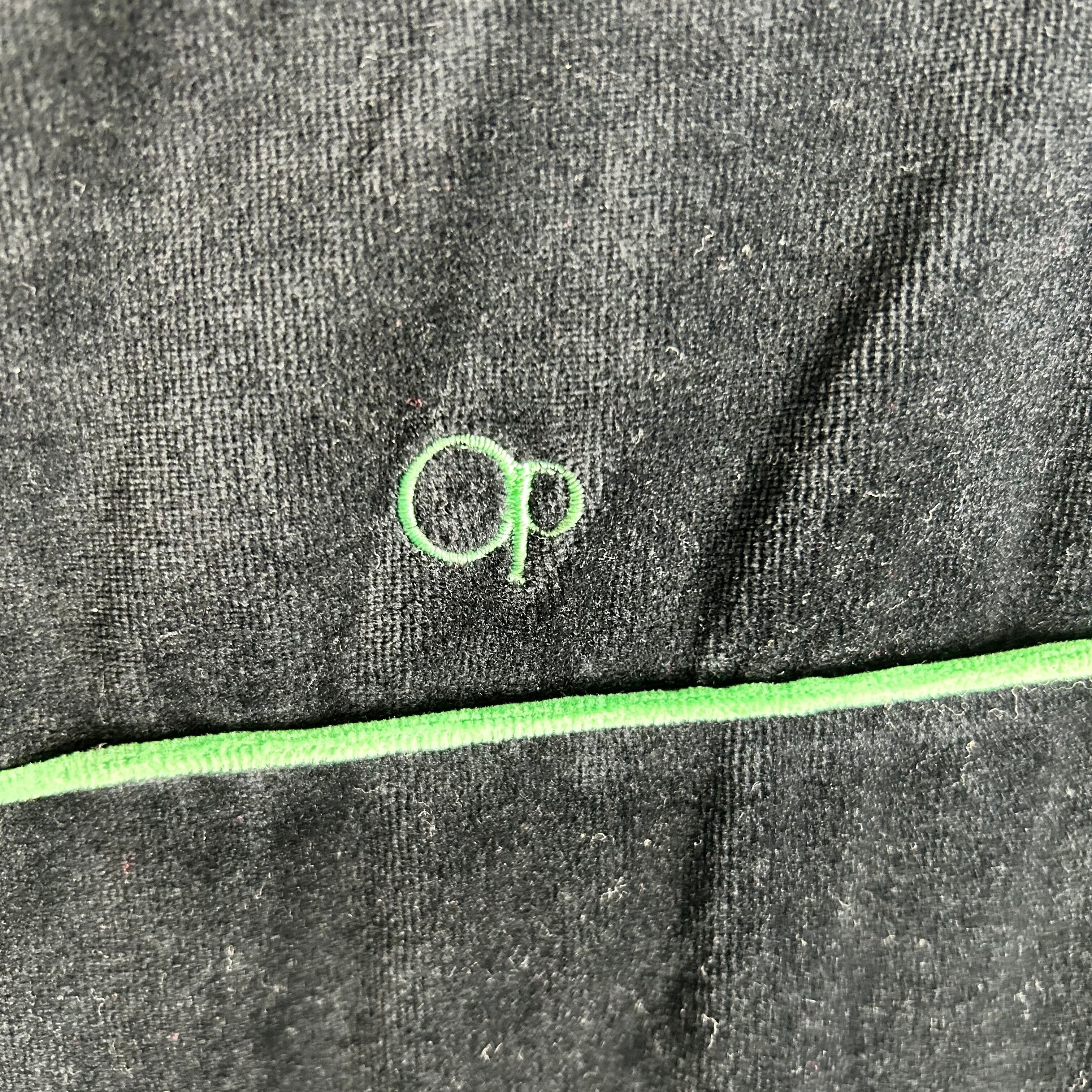 OCEAN PACIFICのベロアのトラックジャケットになります。黒が基調でグリーンでパイピングされています。素材がベロアなので綺麗めなパンツも合わせるのがオススメです。