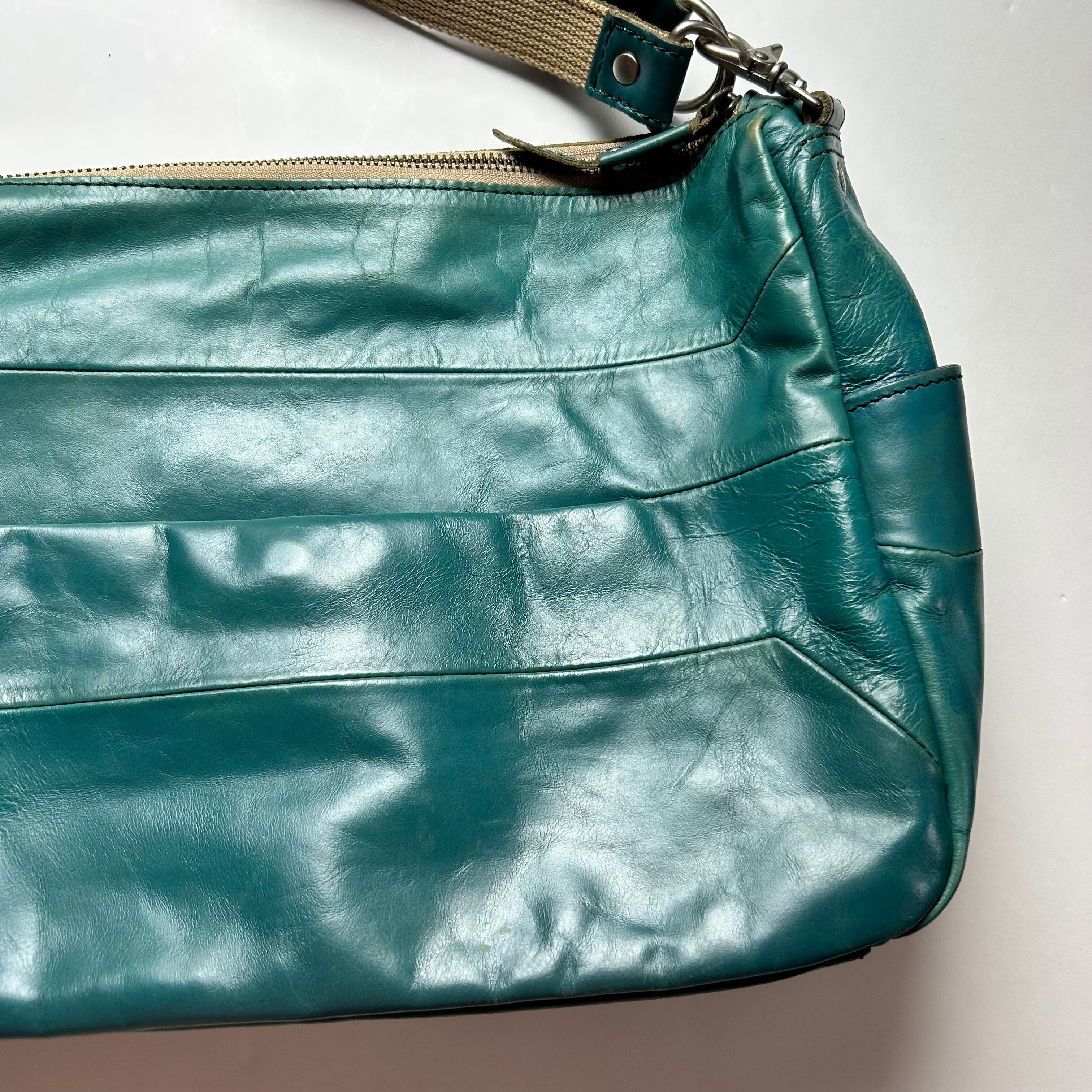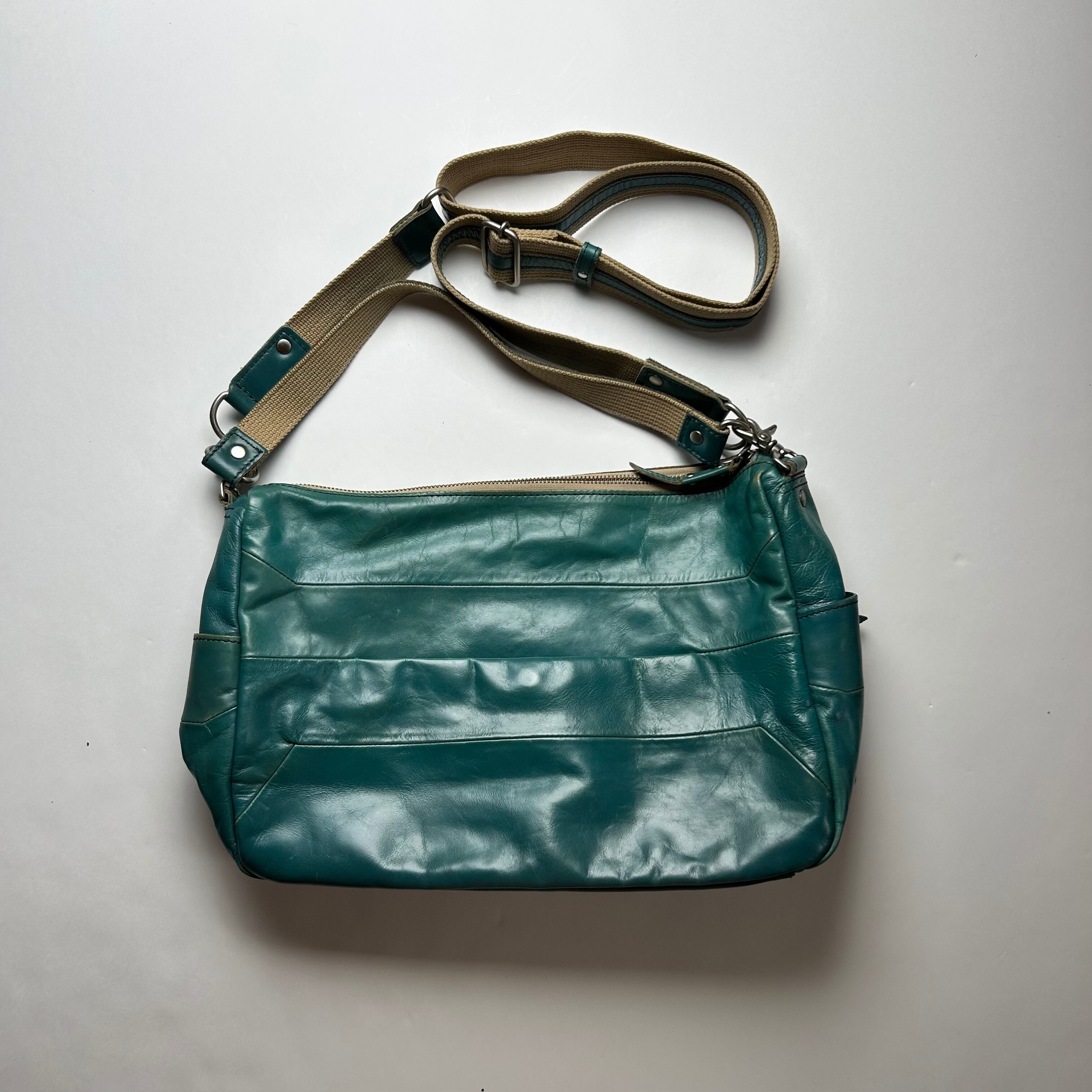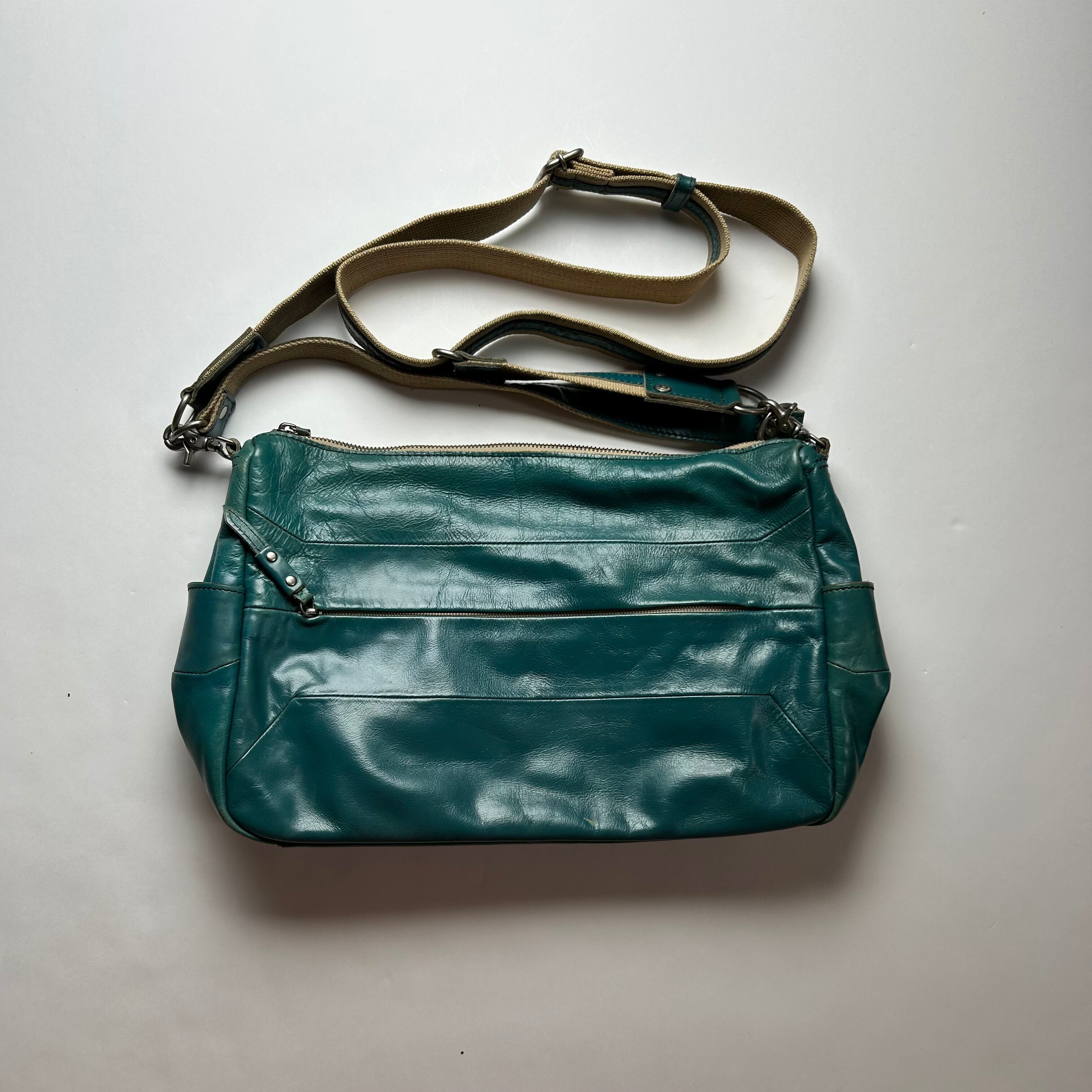 ターコイズブルーのカラーのショルダーバッグになります。オススメはオールブラックのスタイリングでこのバッグを持ってもらうと映えます。