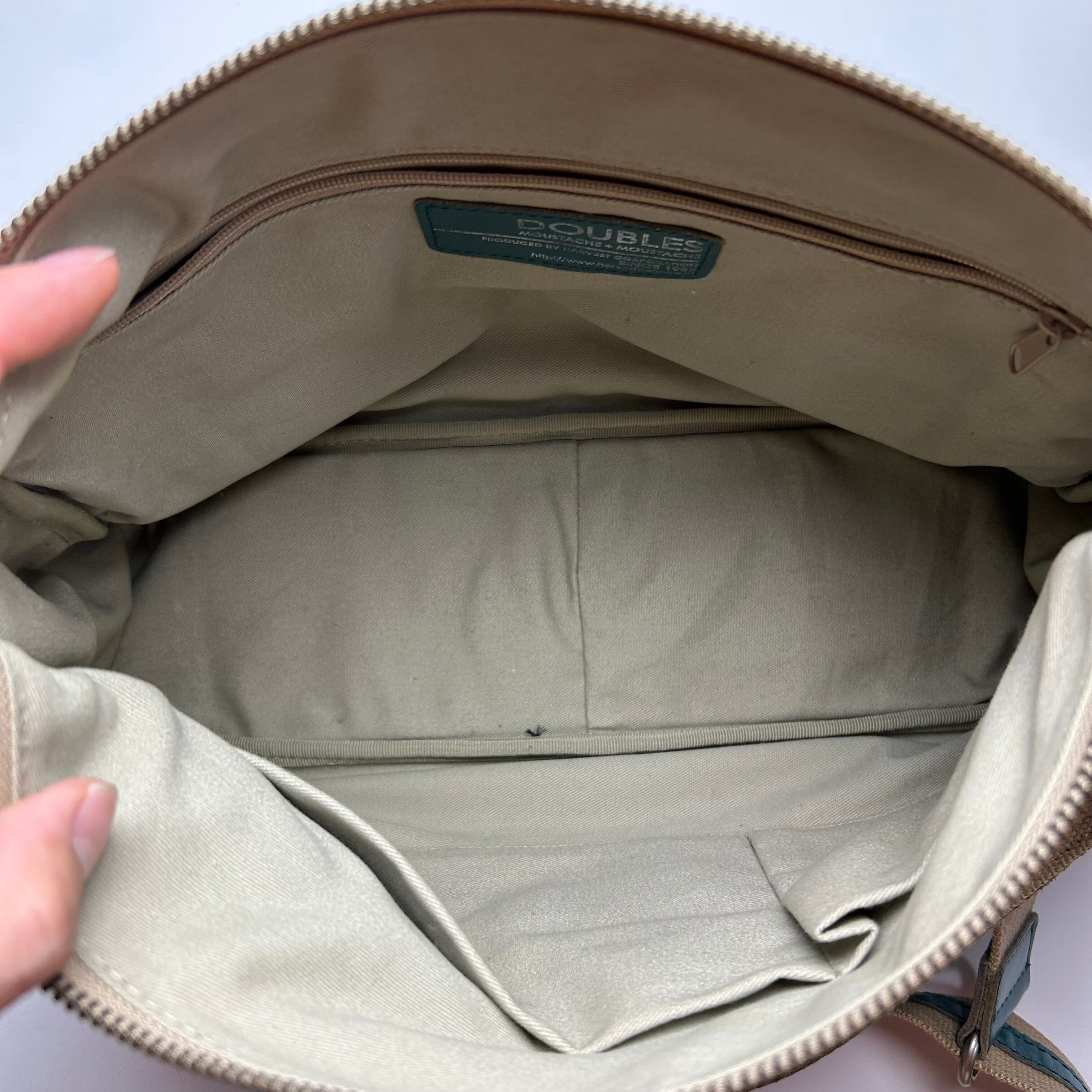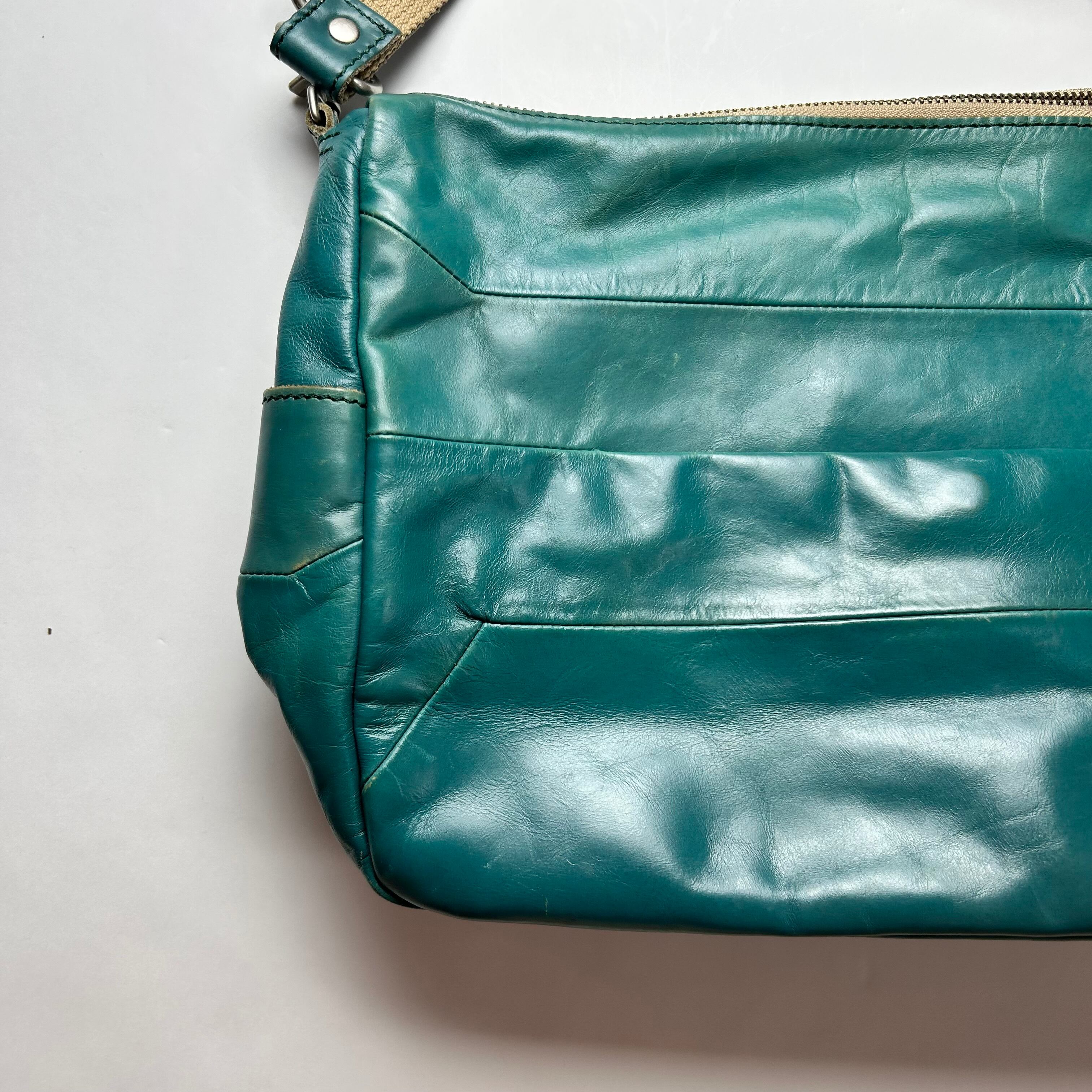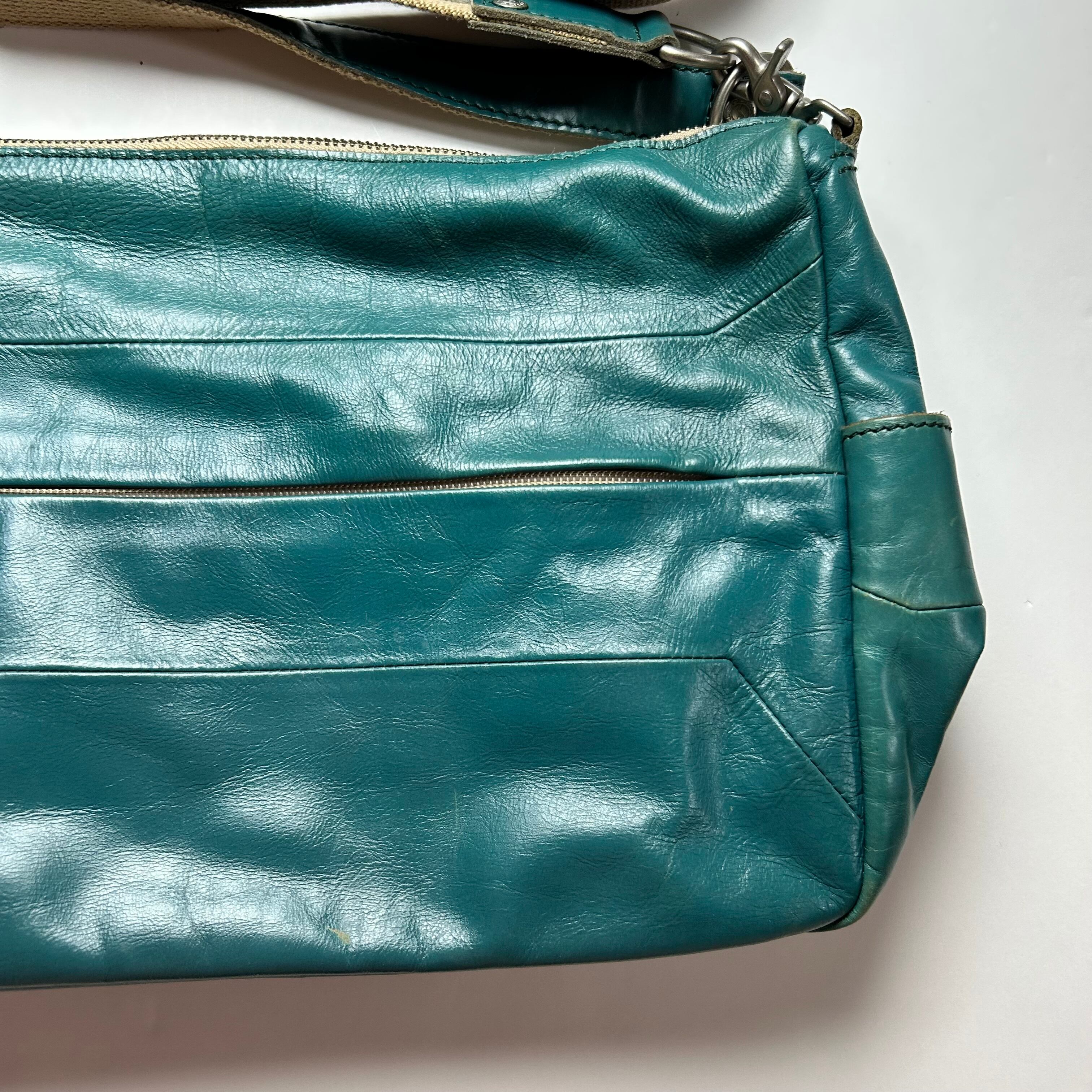 ターコイズブルーのカラーのショルダーバッグになります。オススメはオールブラックのスタイリングでこのバッグを持ってもらうと映えます。