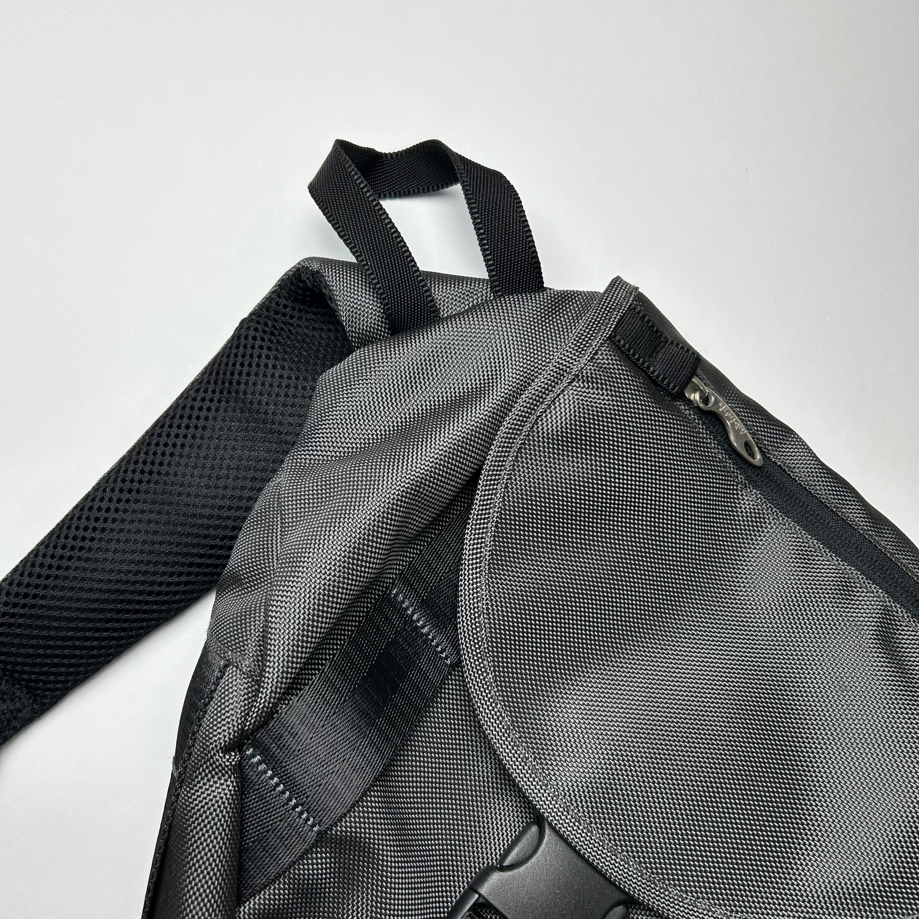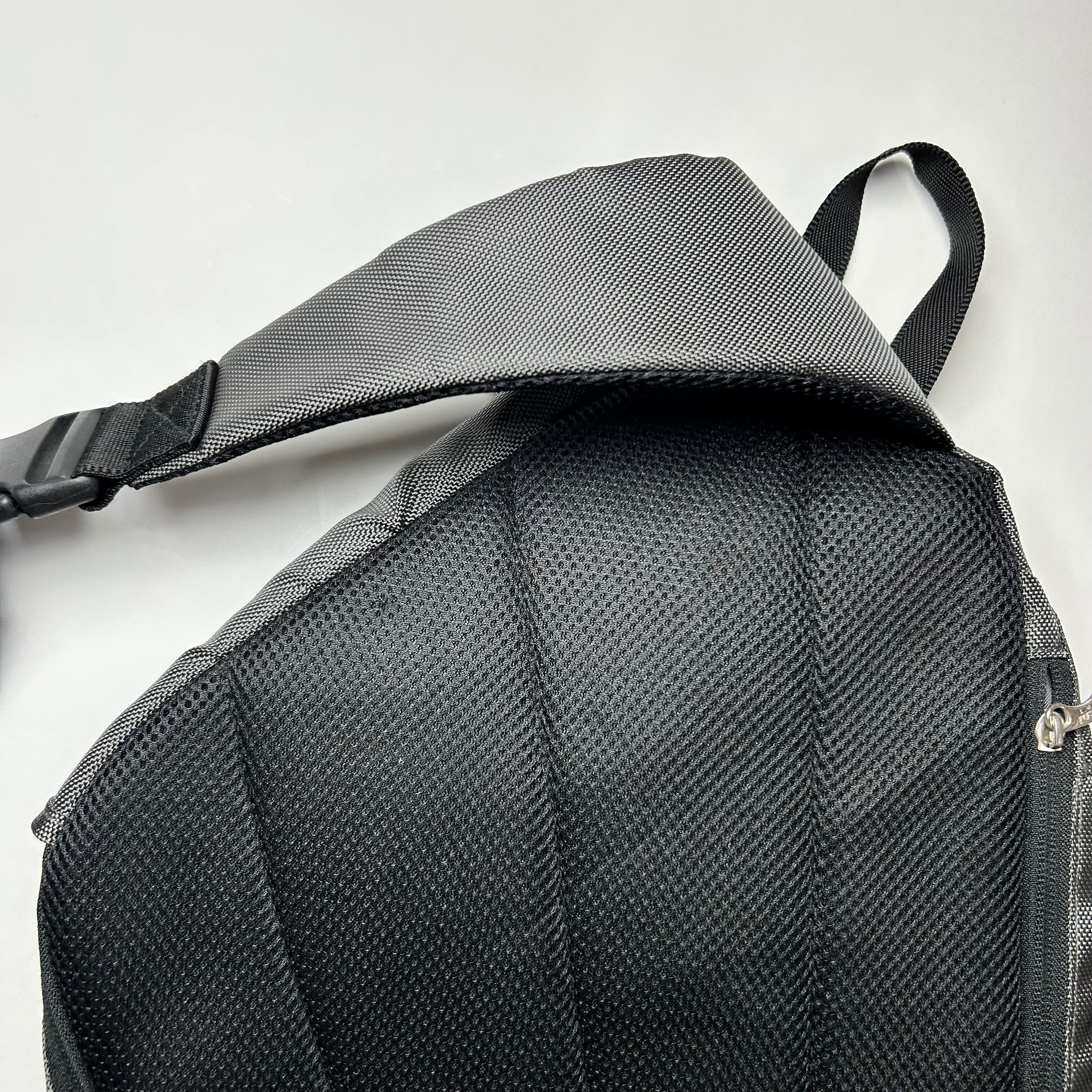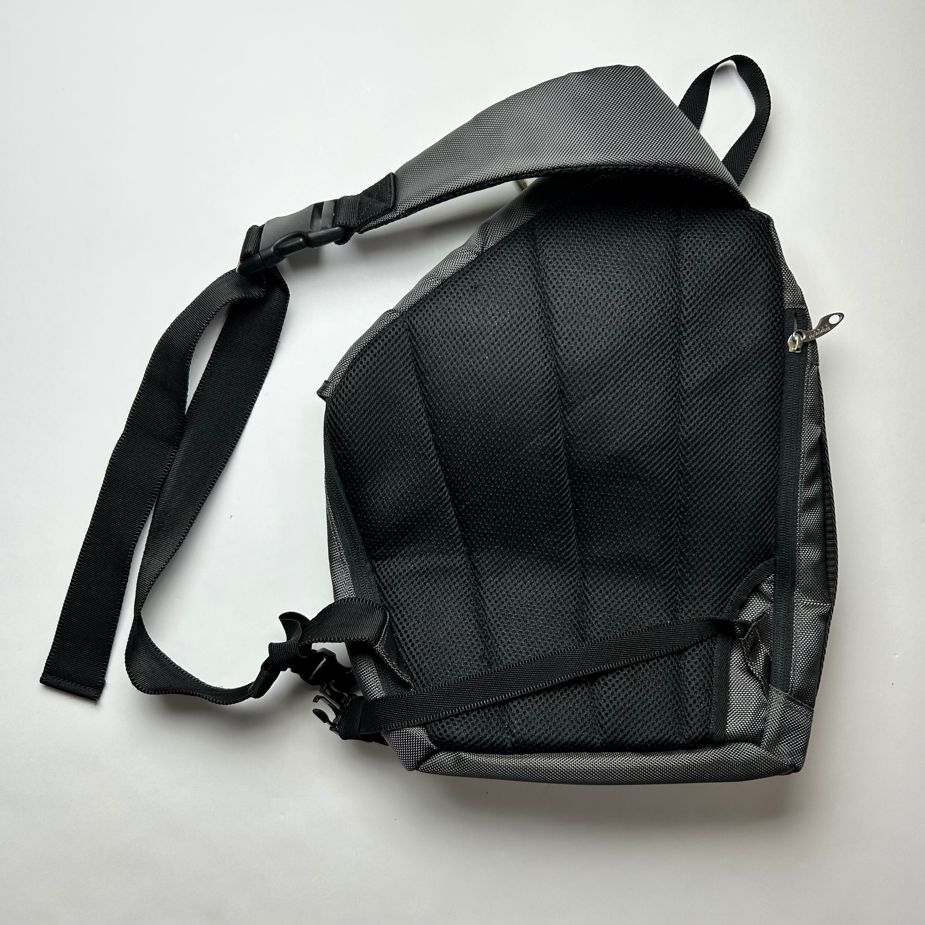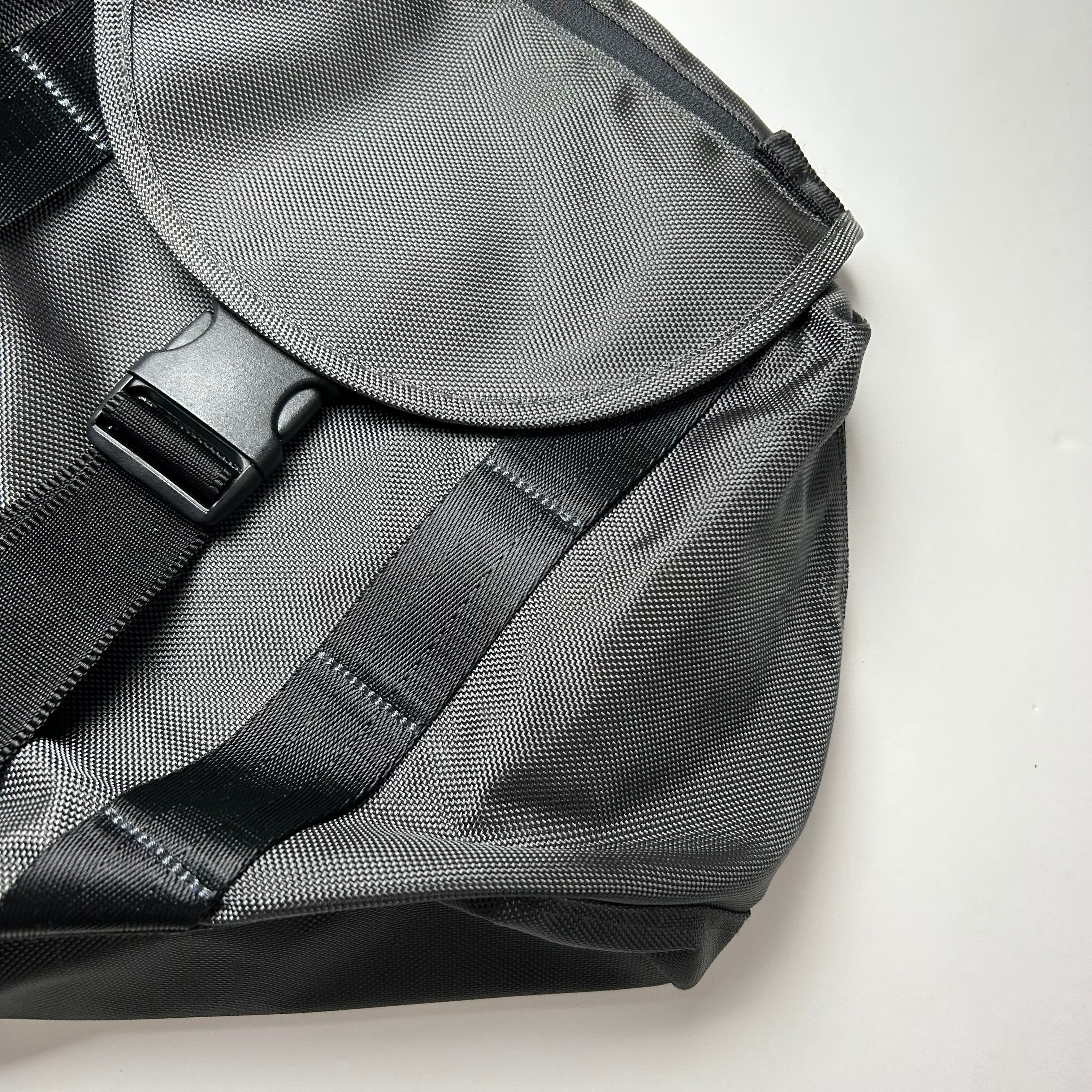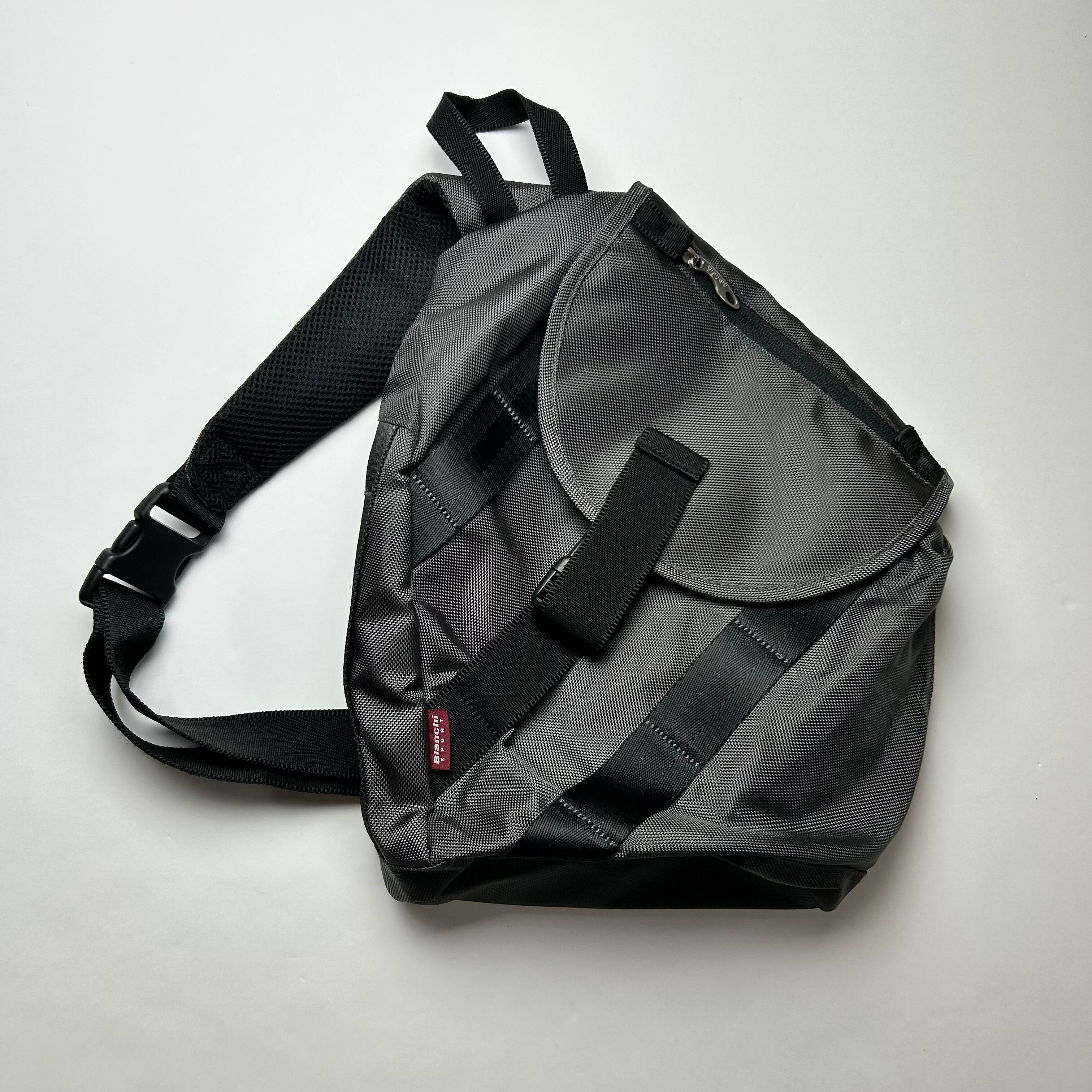 グレーのワンショルダーのショルダーバッグです。形が独特でフロントのデザインがテック感満載です。ナイロン系のアイテムに抜群に合います。