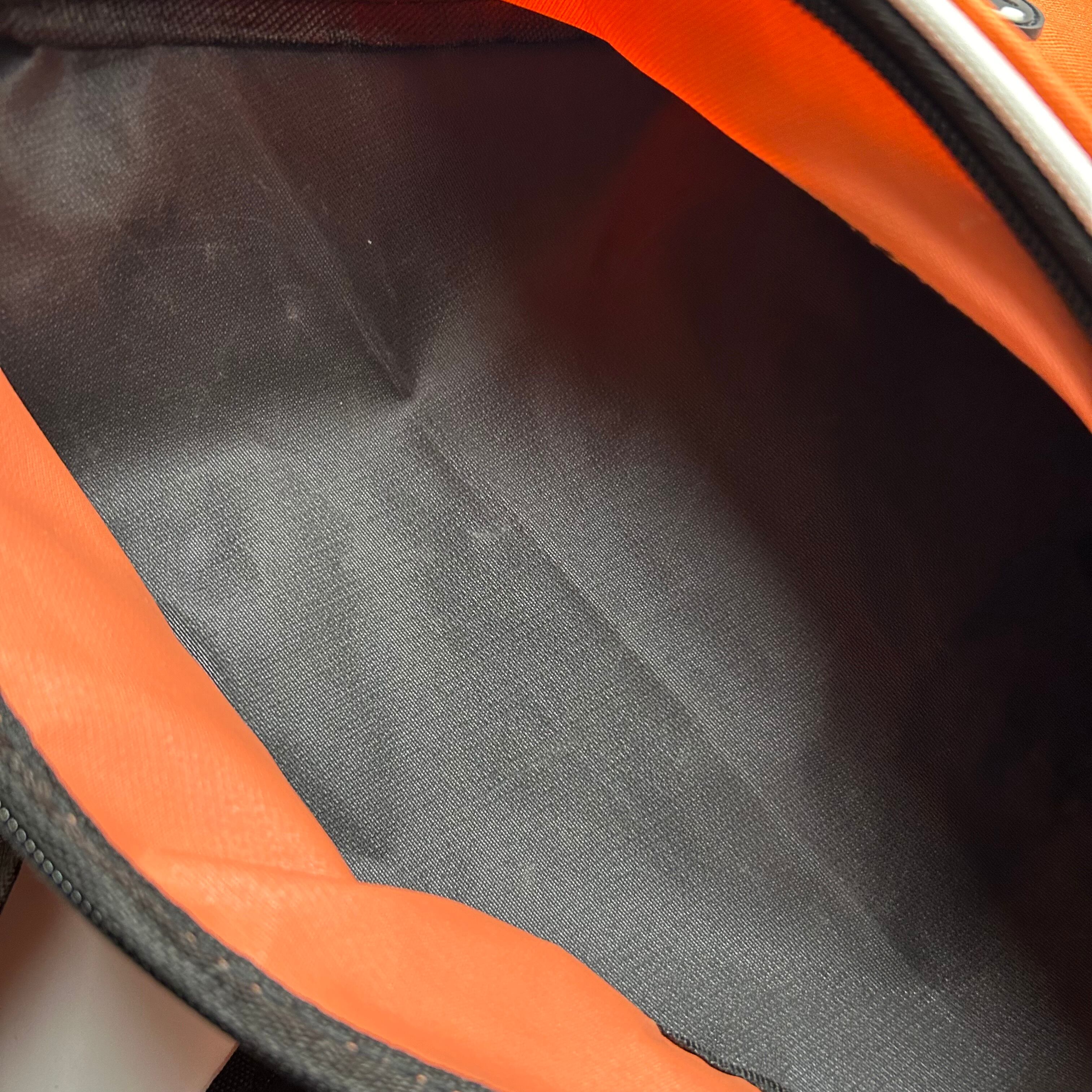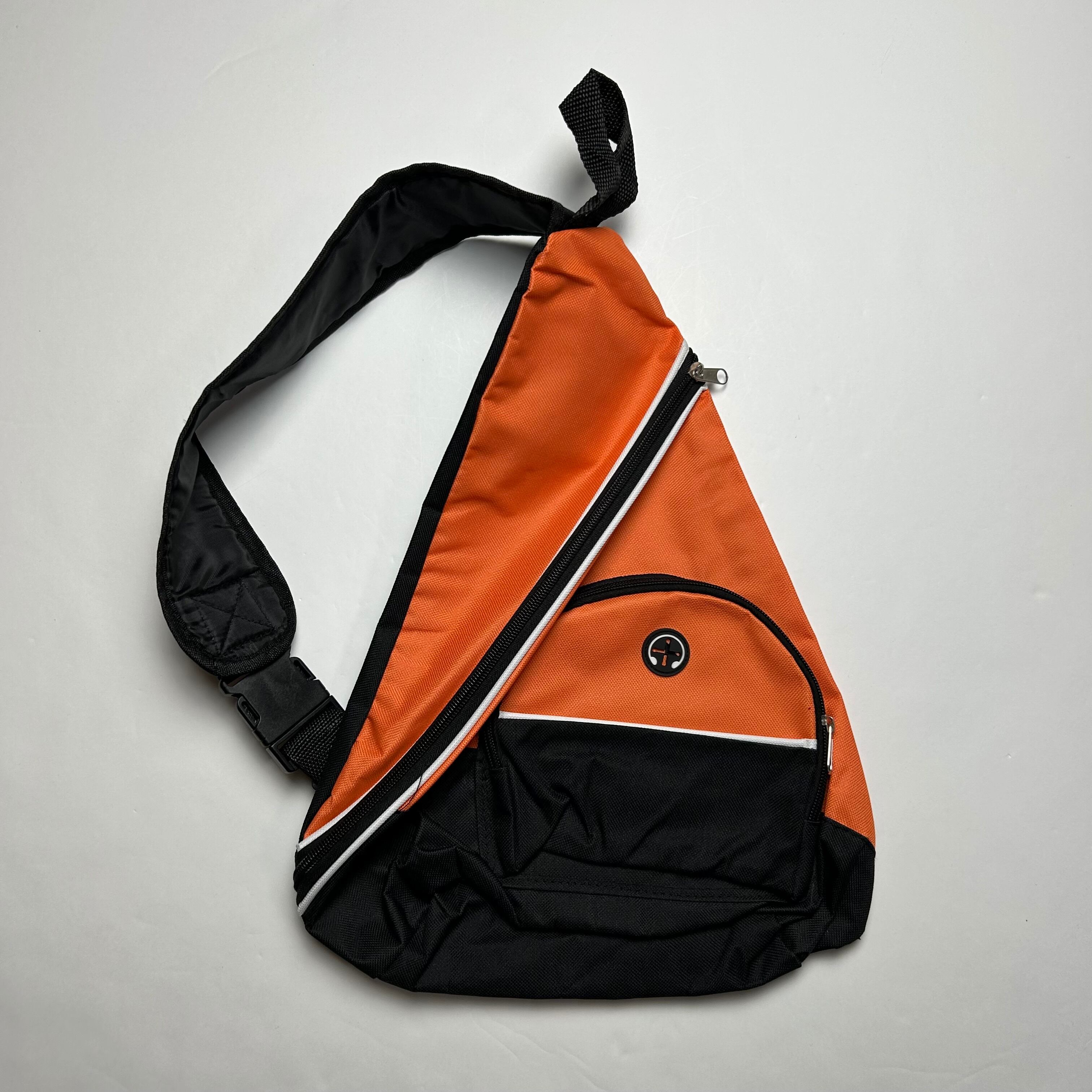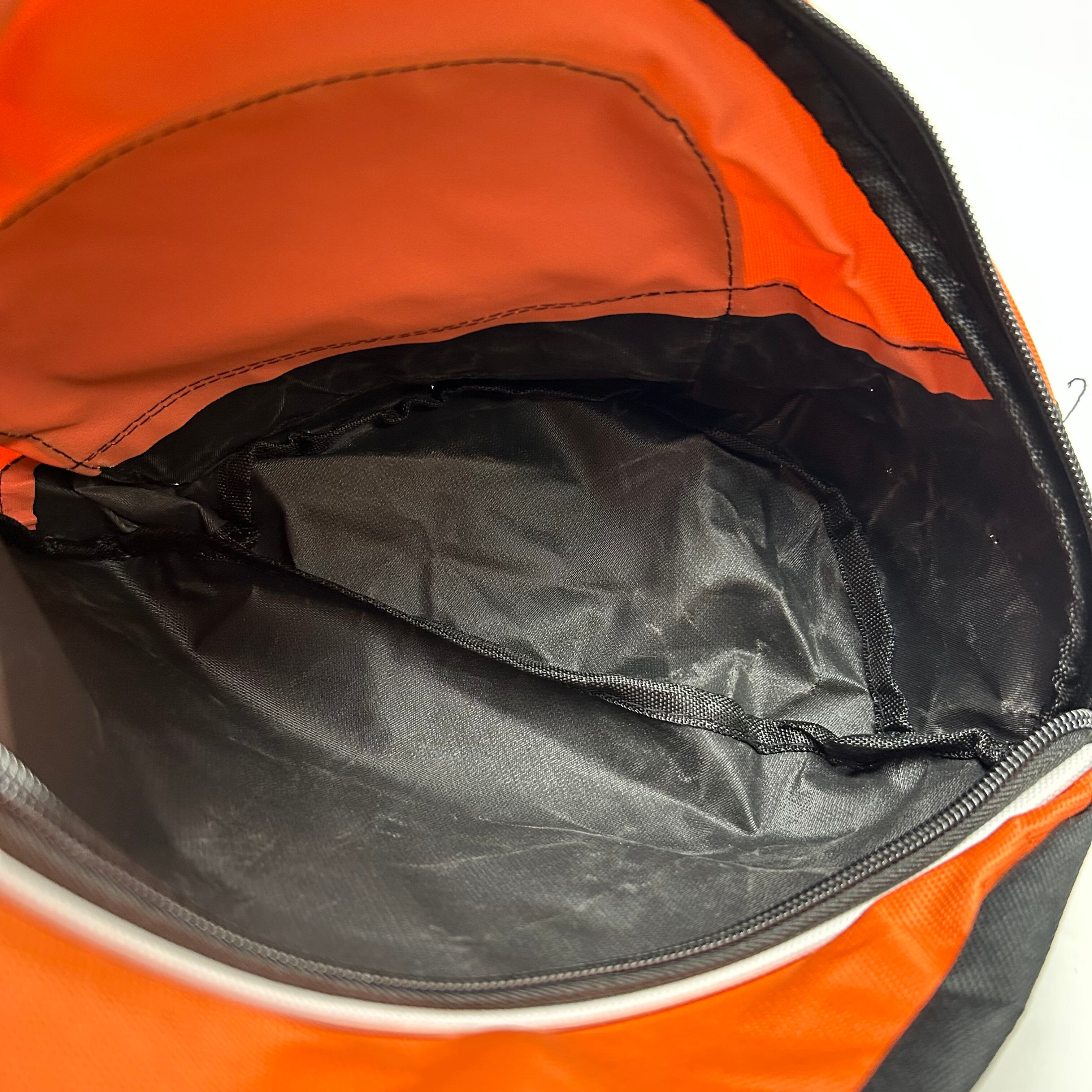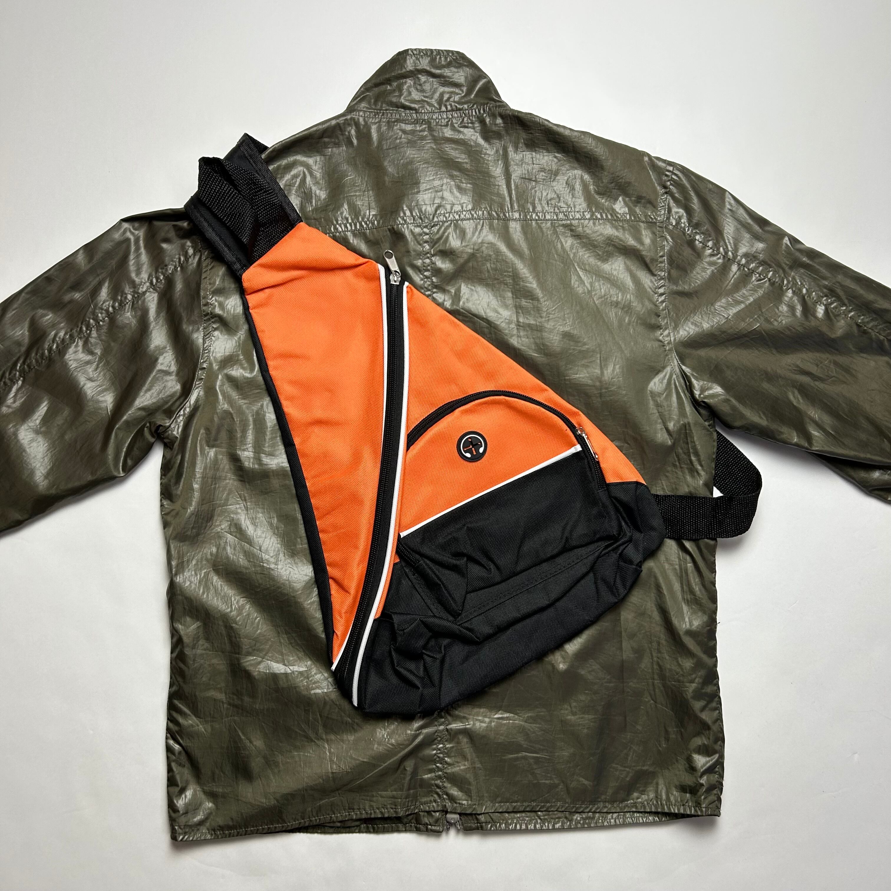 オレンジのワンショルダーのショルダーバッグになります。見た目からテック感満載でイヤホンジャックも付いていて機能性もあります。