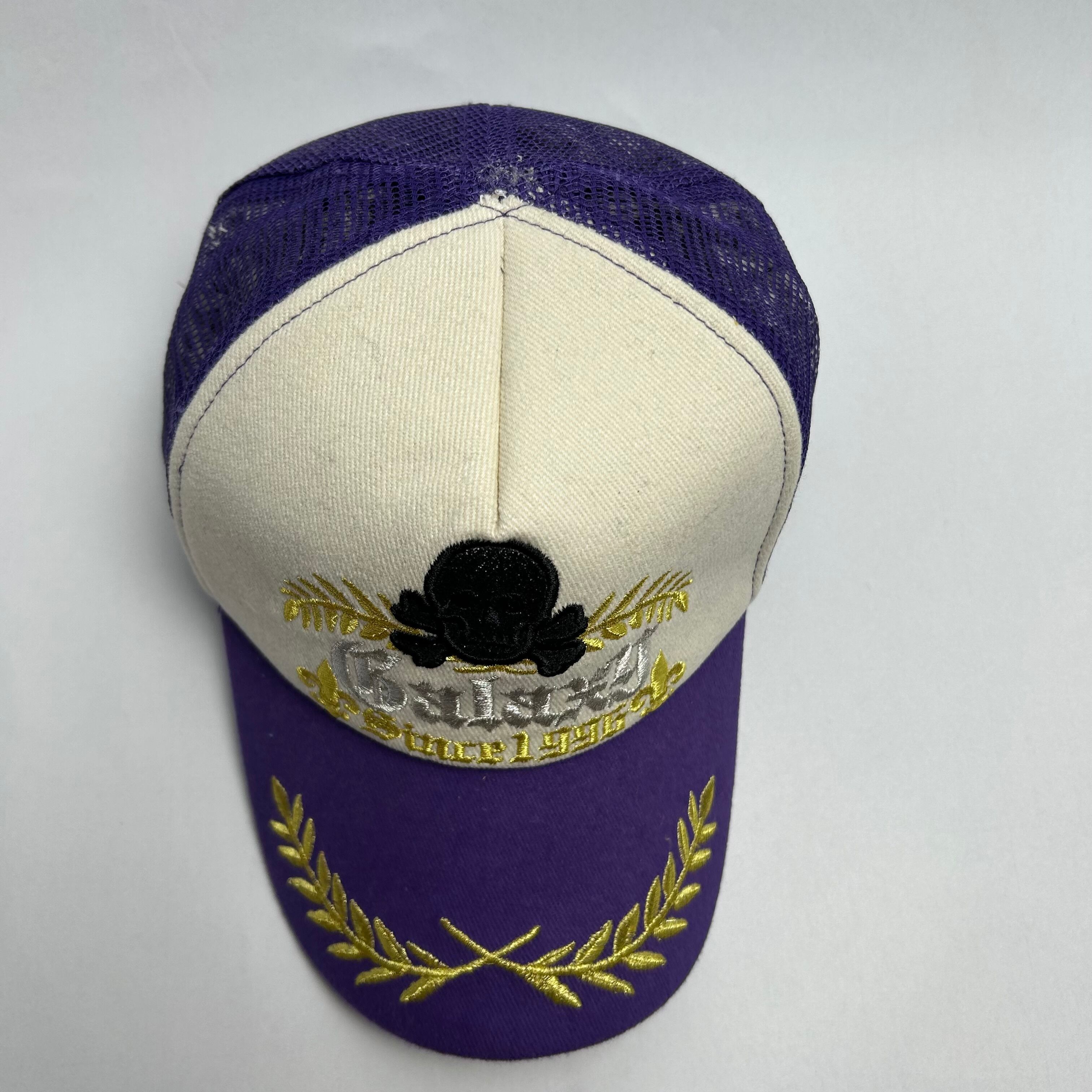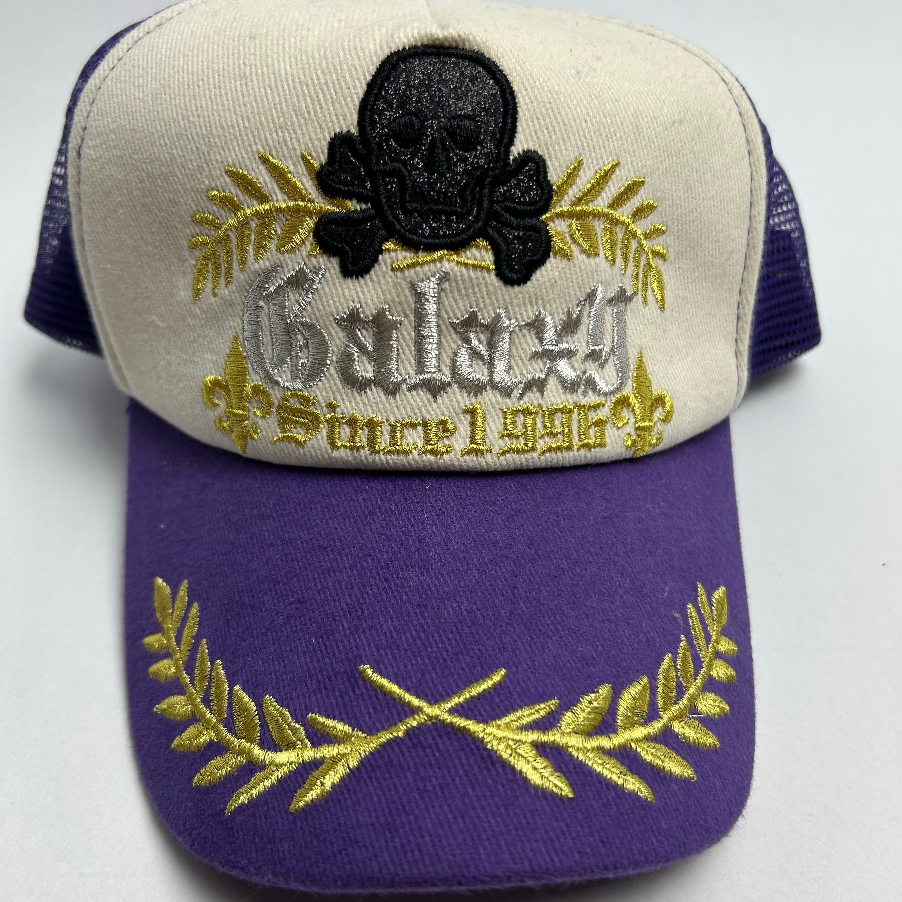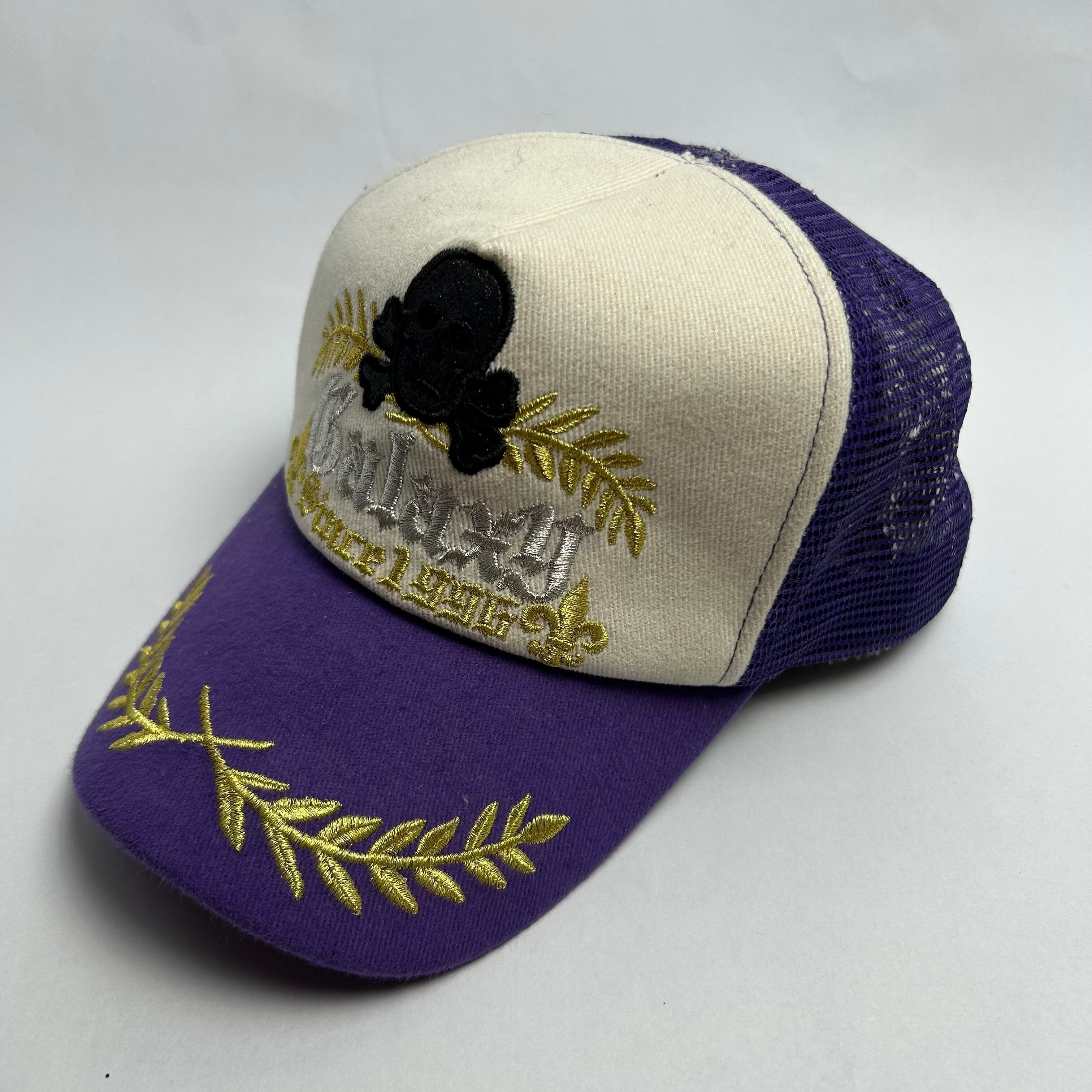 パープル、ホワイトのメッシュキャップです。刺繍でドクロが縫われているのが特徴的で1つで主役になれる商品です。