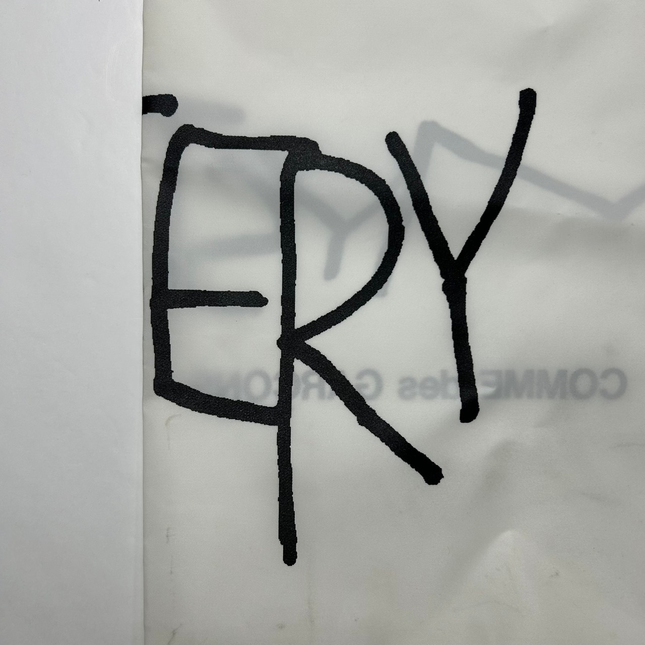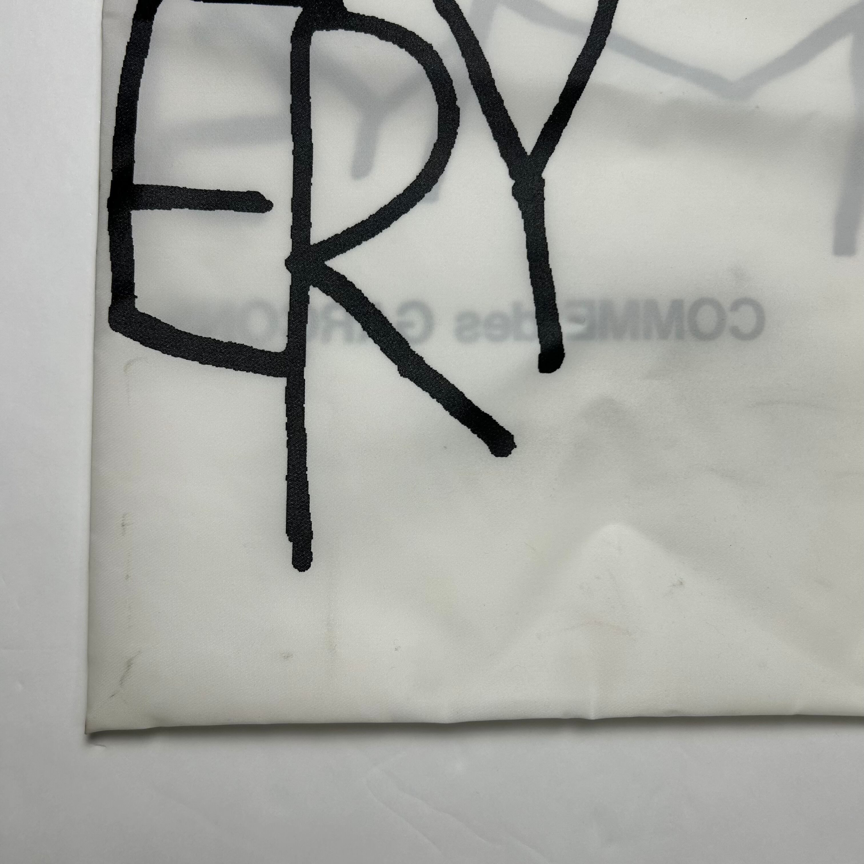 COMME des GARÇONSのトートバッグになります。落書き風のデザインが施されていてスタイリングに一癖欲しい時に重宝します。