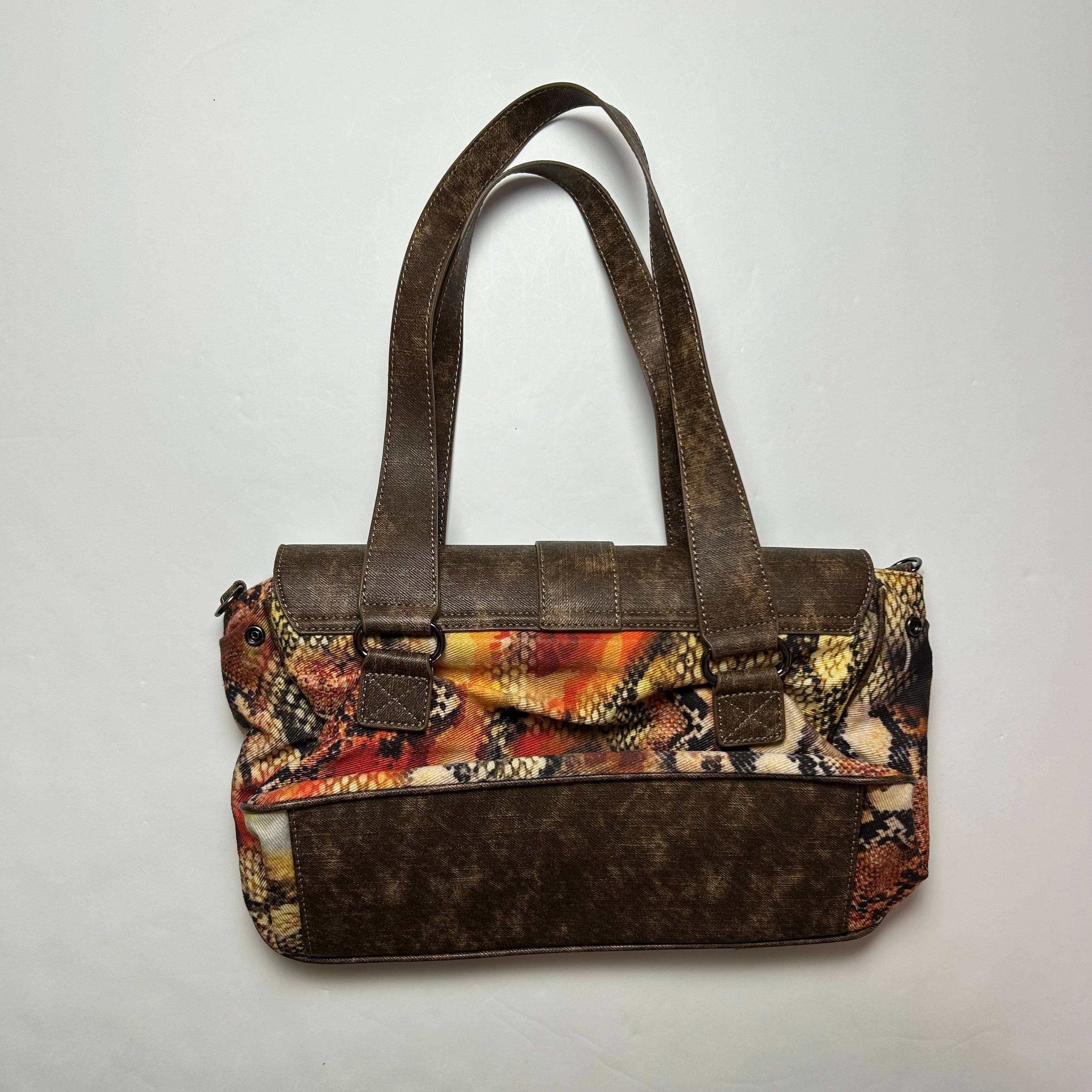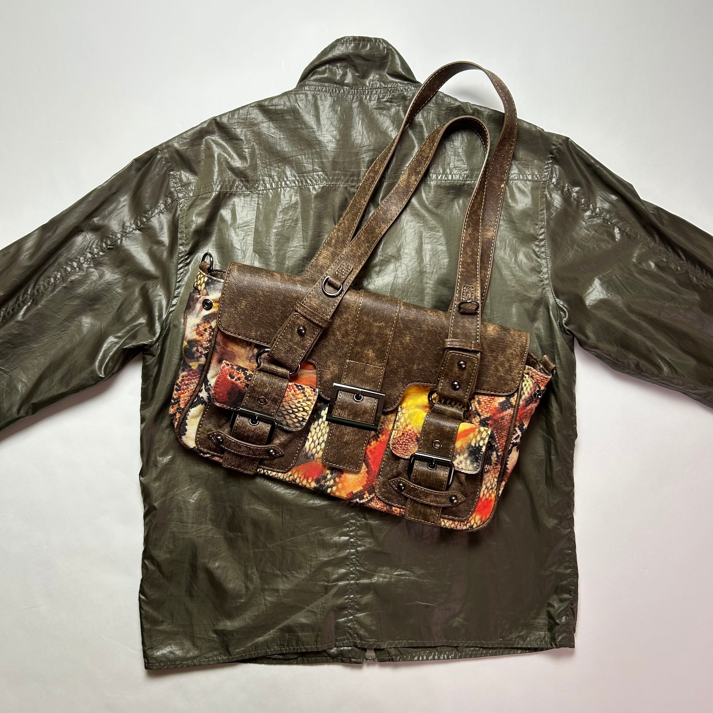 スネークプリントの肩がけのショルダーバッグになります。一見、派手ですが持ってみると意外とスタイルに馴染みます。