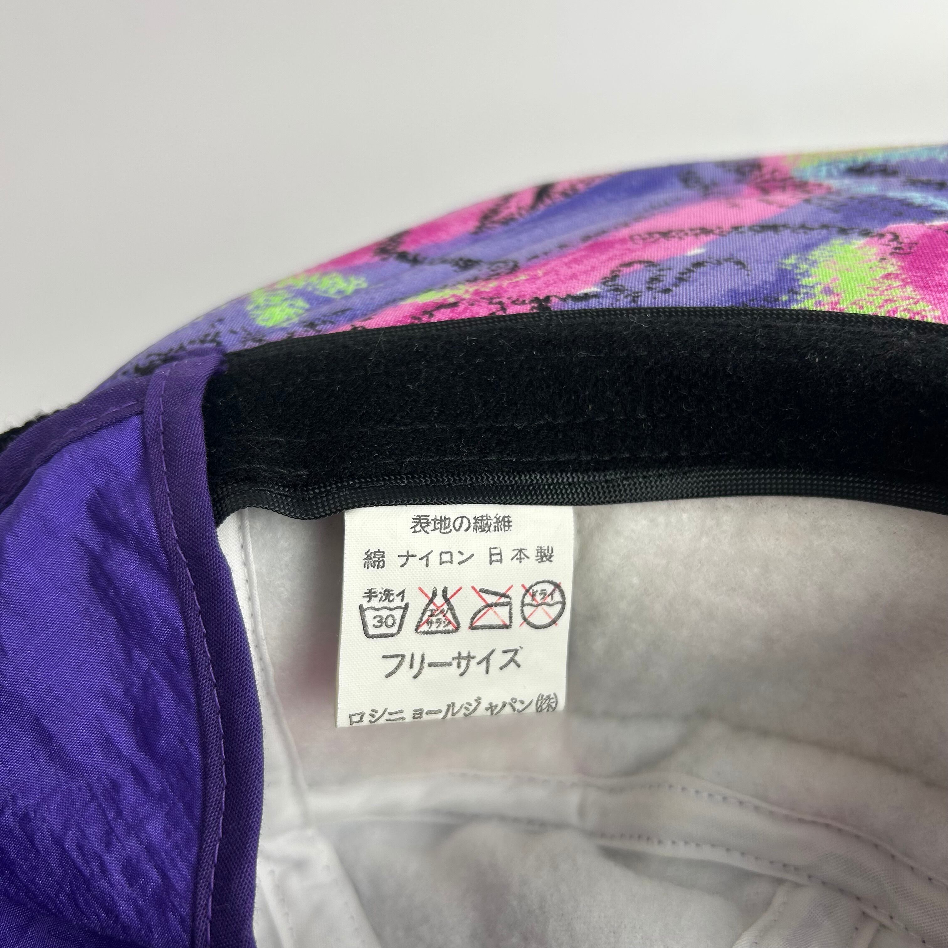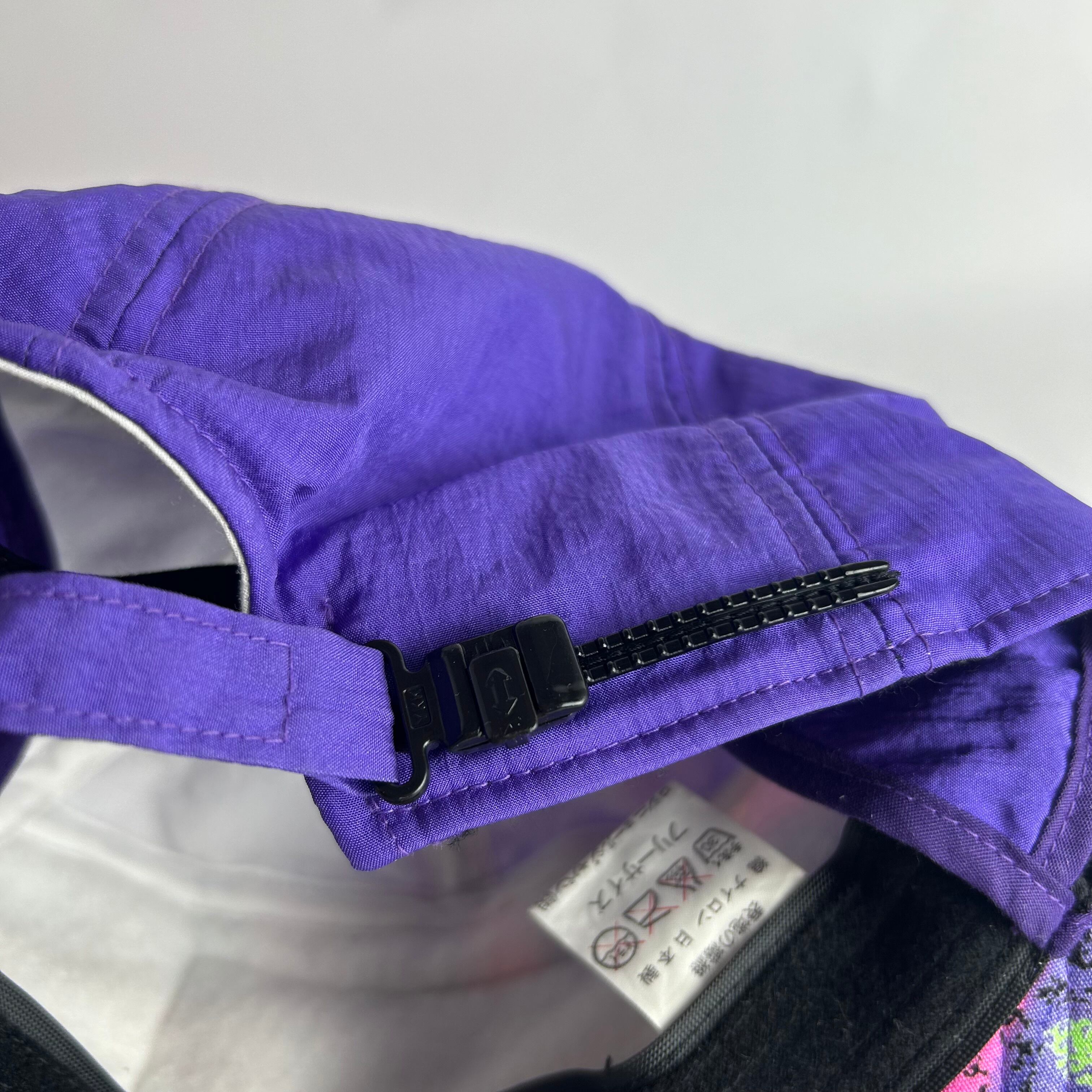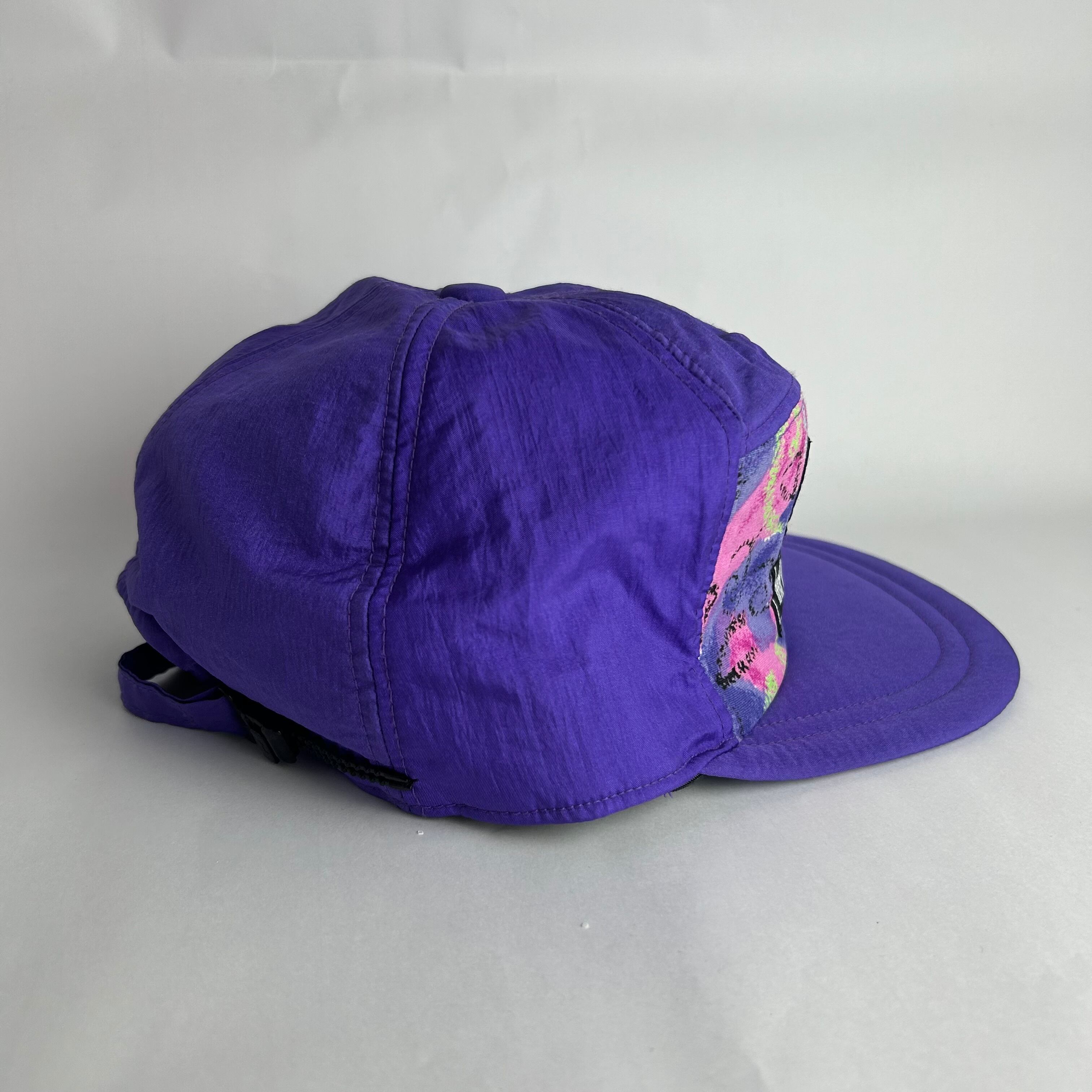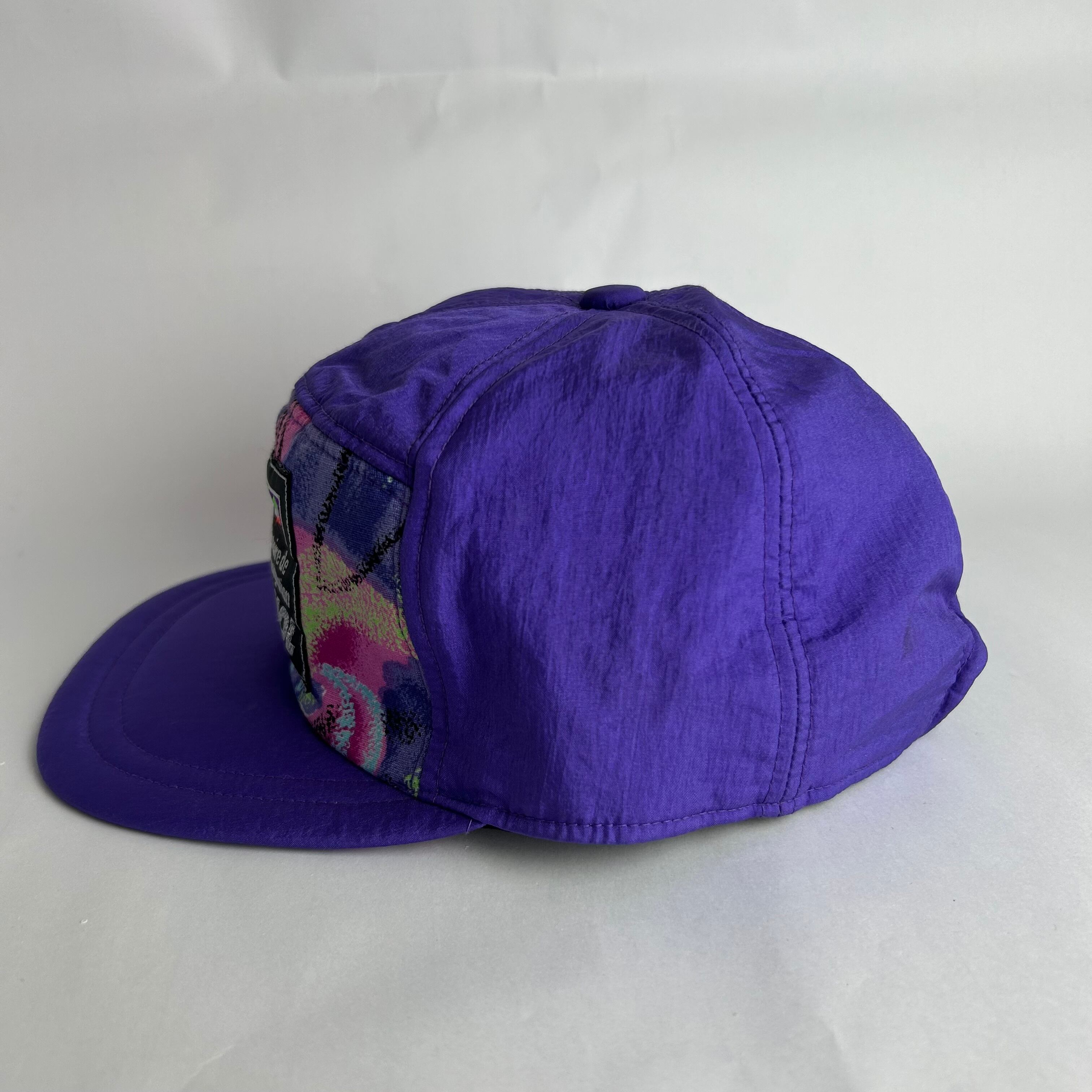 鮮やかなパープルのボディに、フロント部分にはカラフルなグラフィックや幾何学模様が施されたパッチが配置されています。