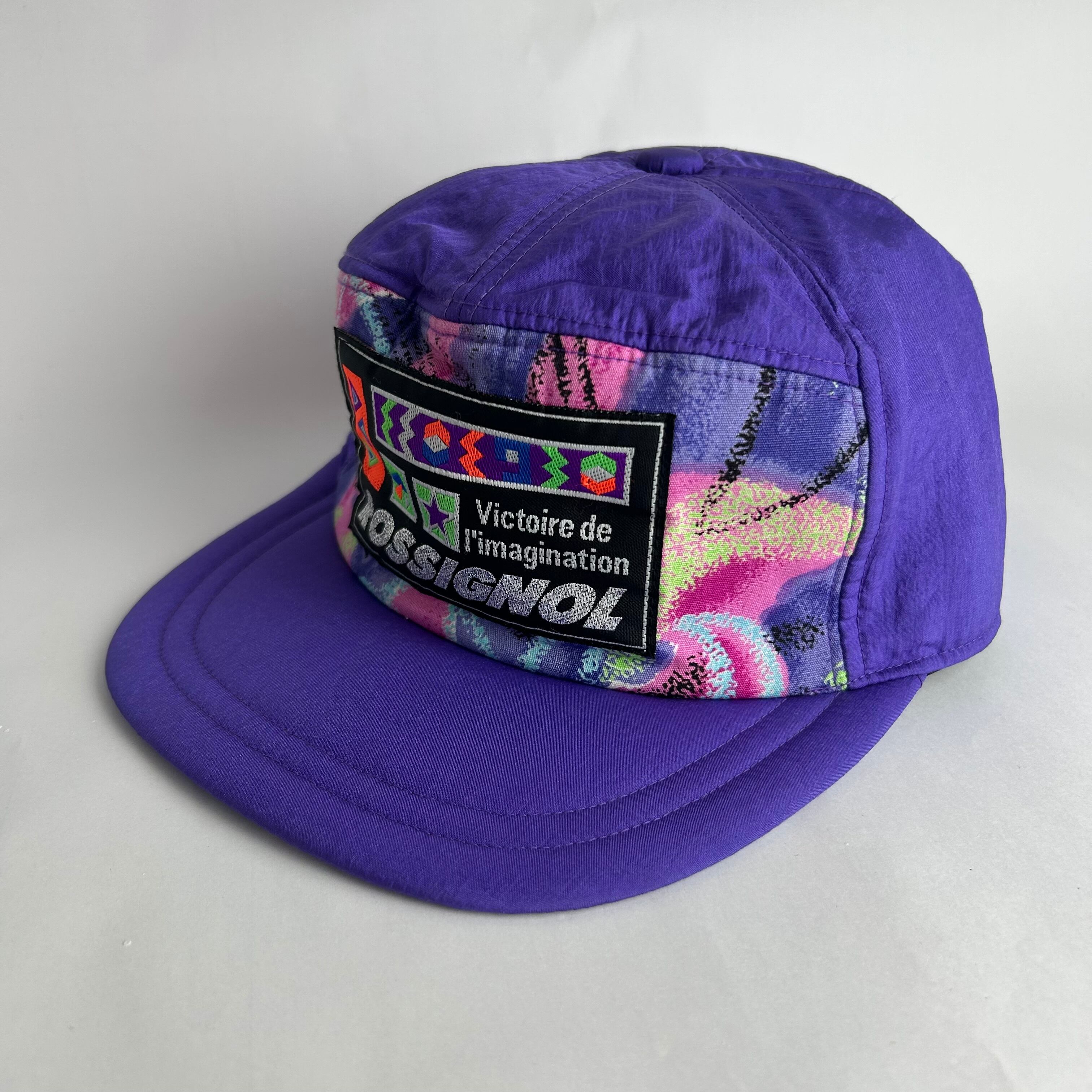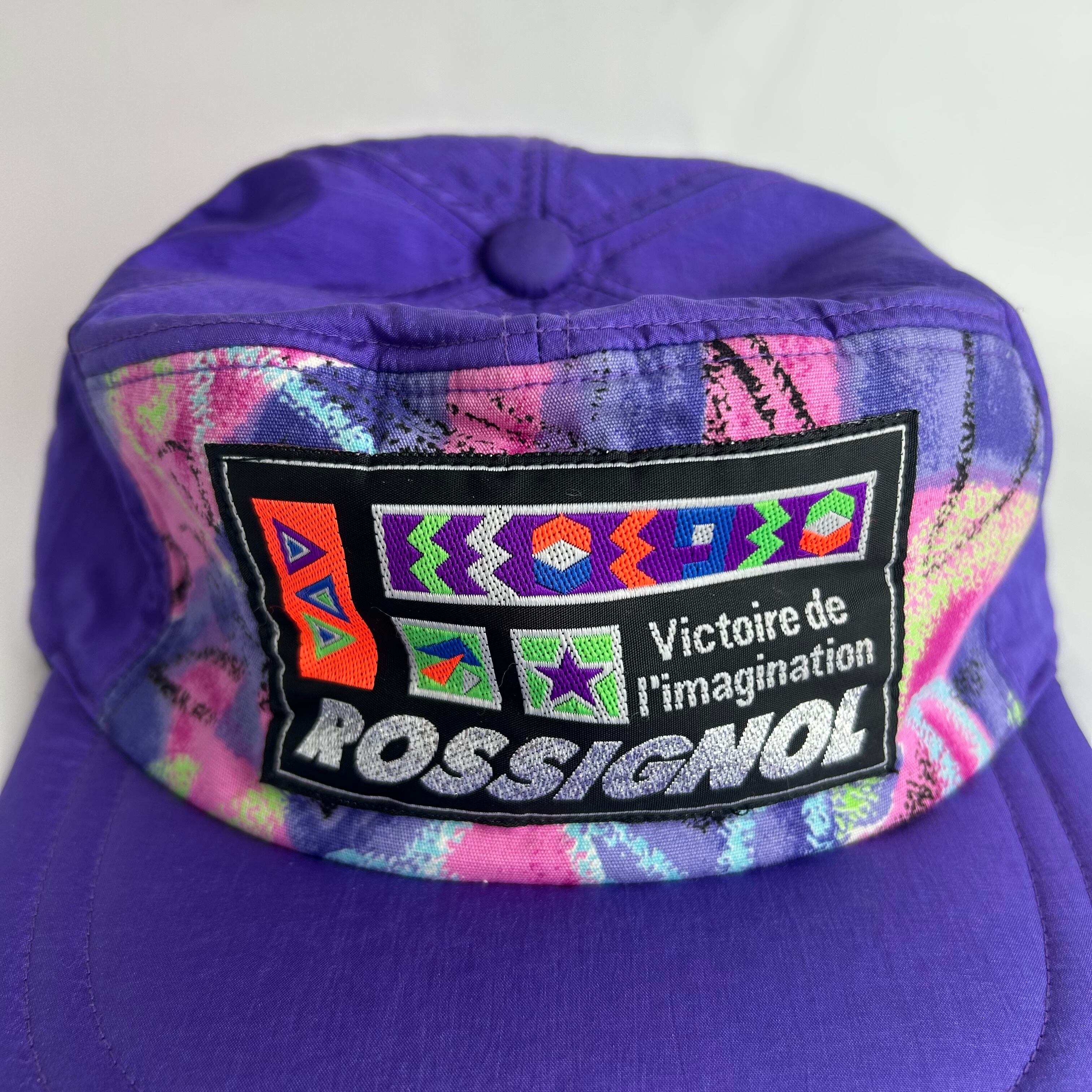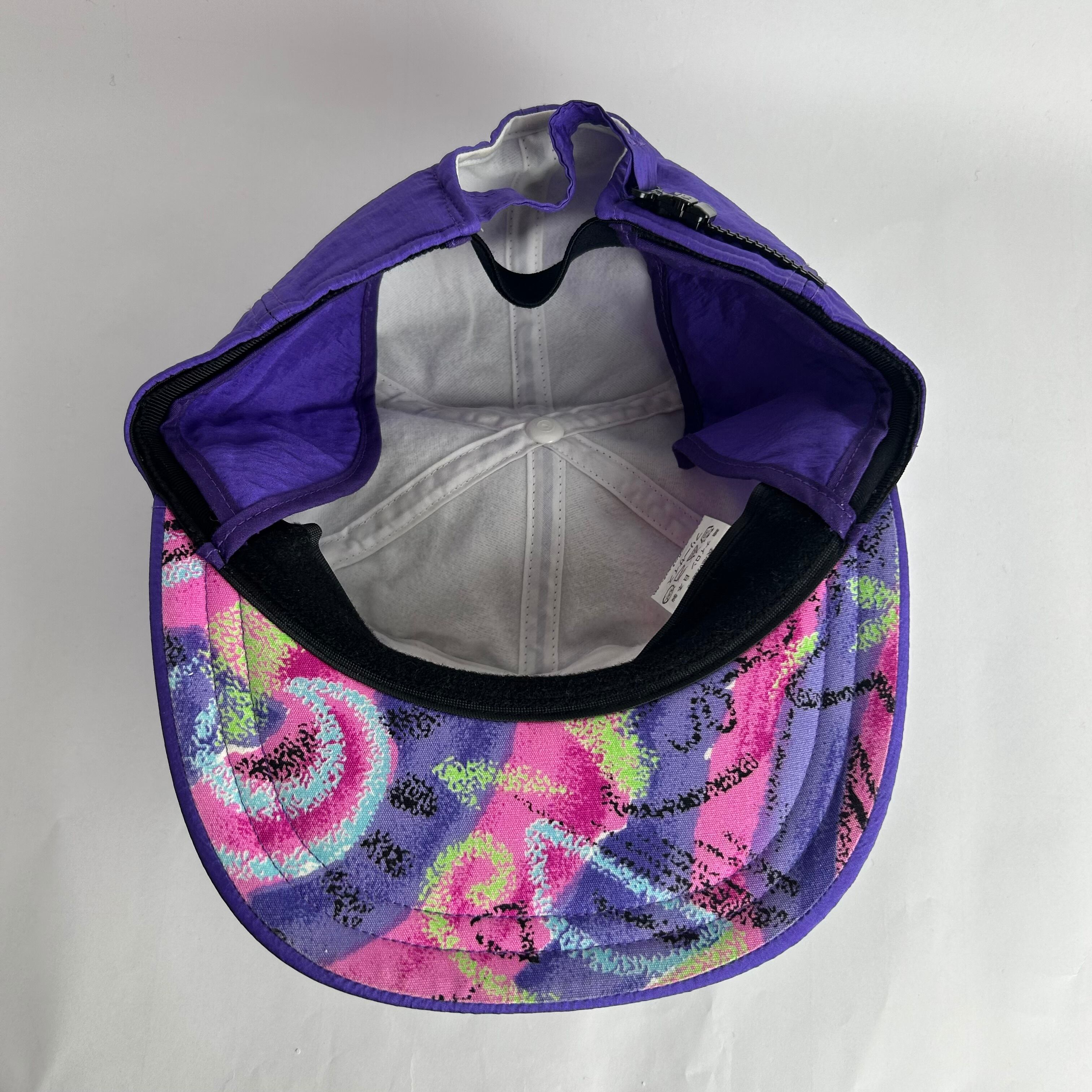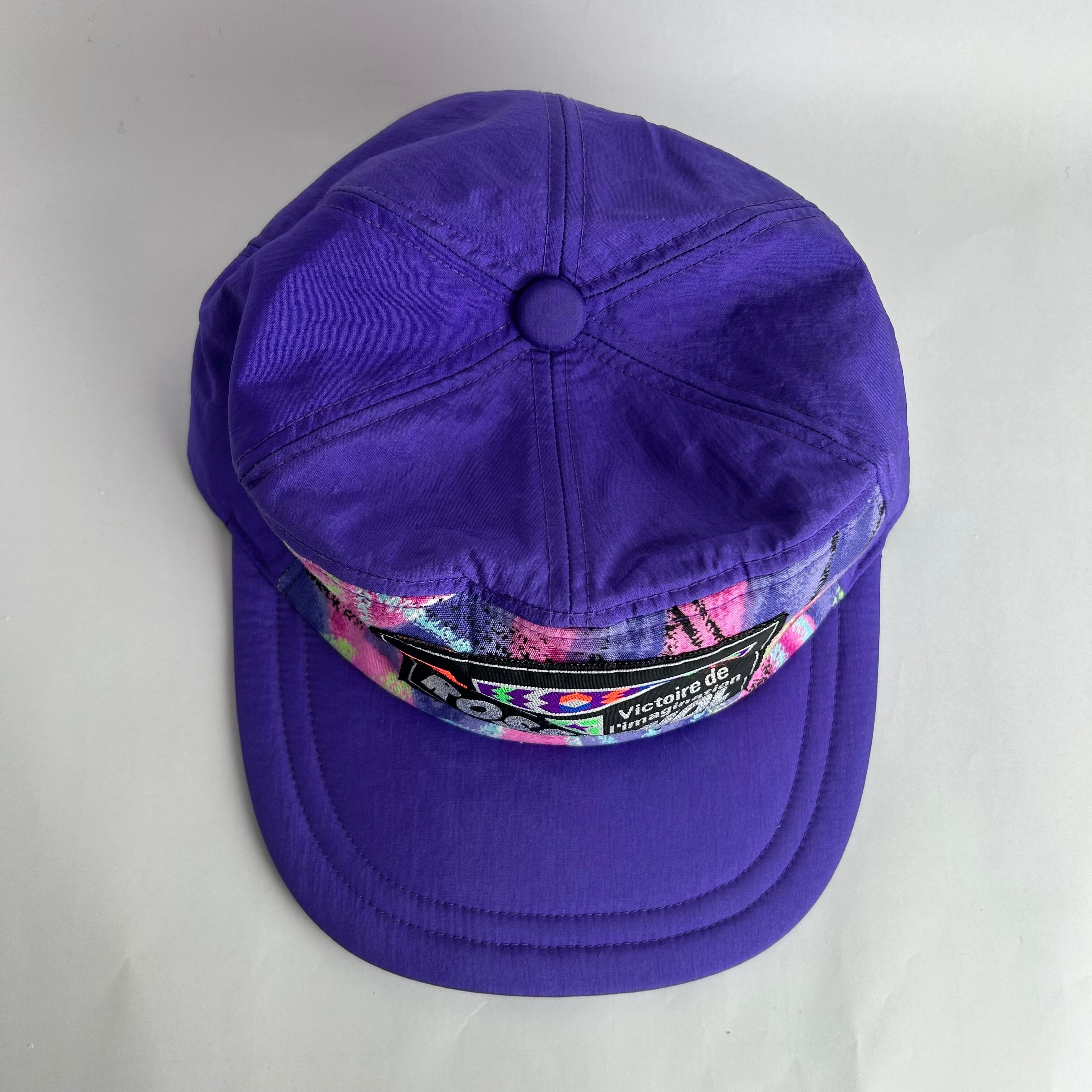 鮮やかなパープルのボディに、フロント部分にはカラフルなグラフィックや幾何学模様が施されたパッチが配置されています。